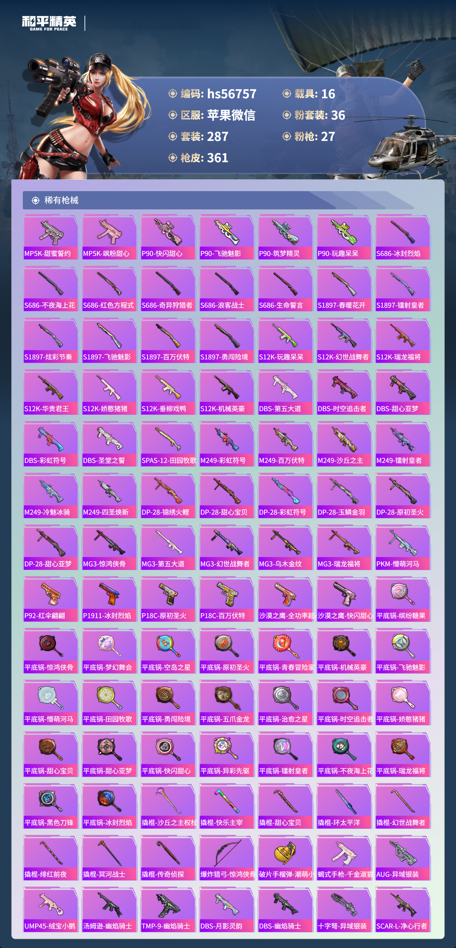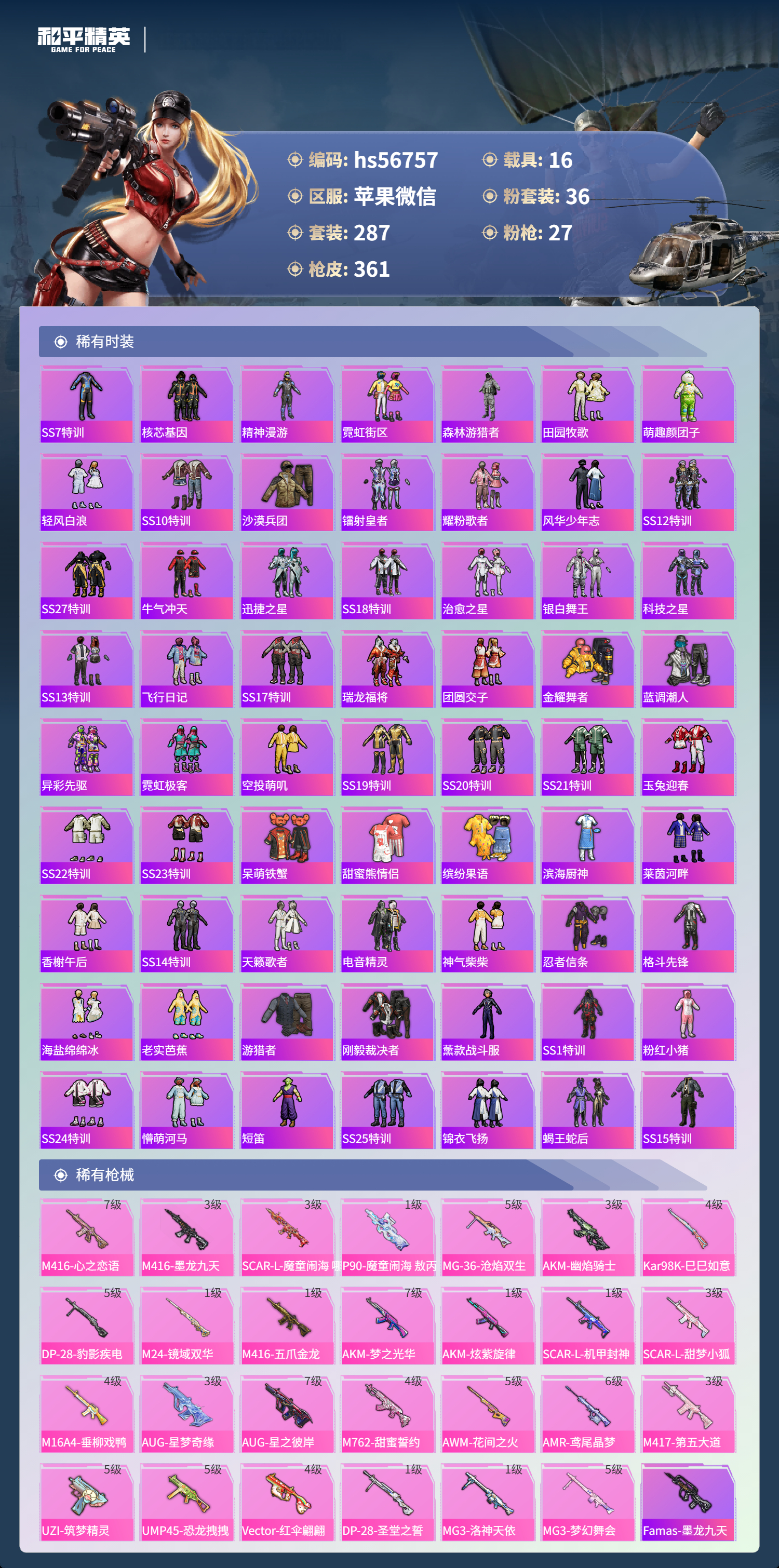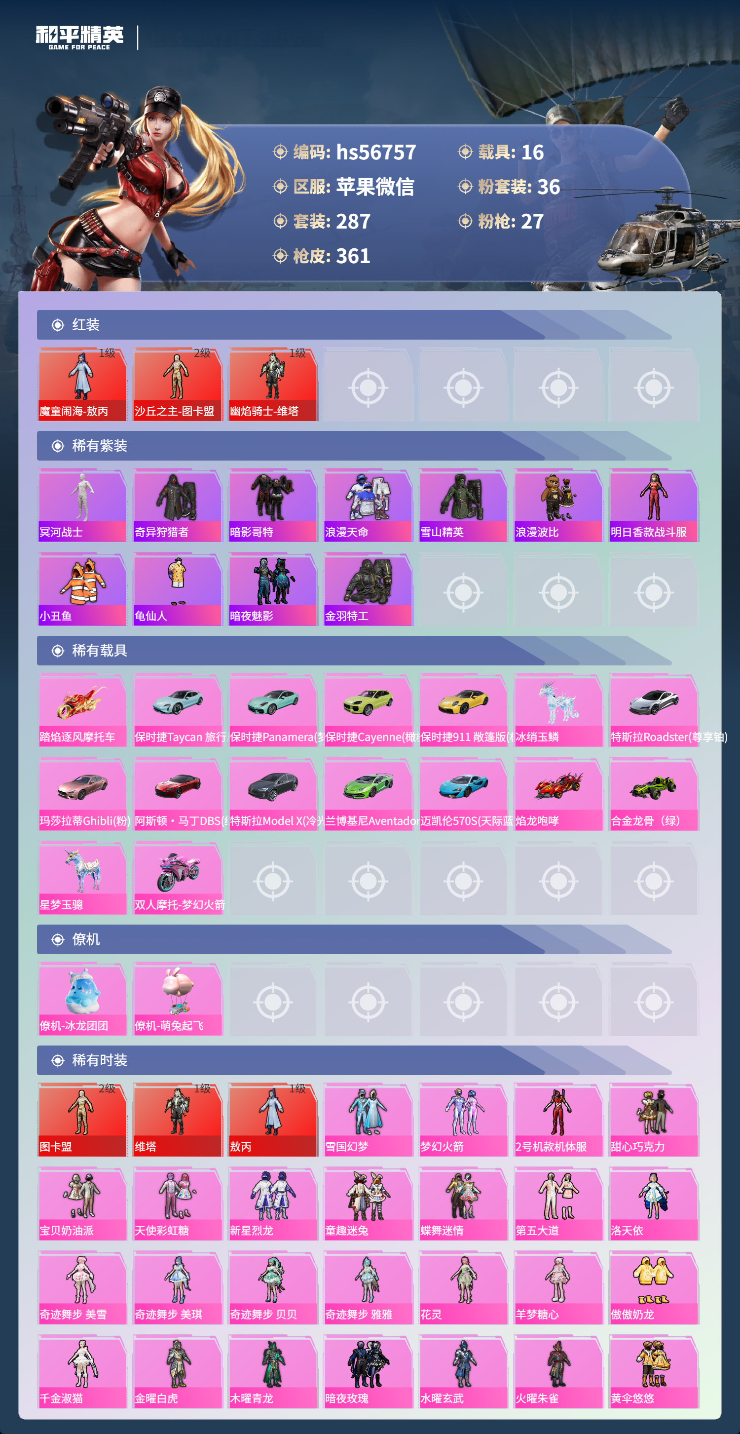 hs56757 苹果微信-23王牌印记-有战神框-3红装-36粉装-27特效枪-16载具-热力值-287套装-361枪皮-6卓越印记-4传奇印记