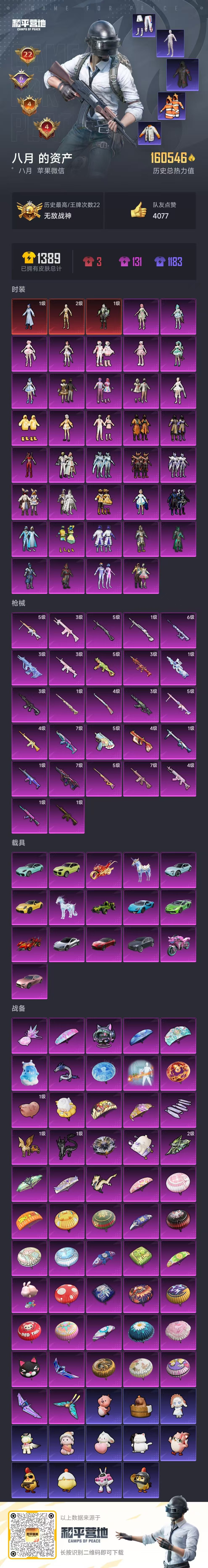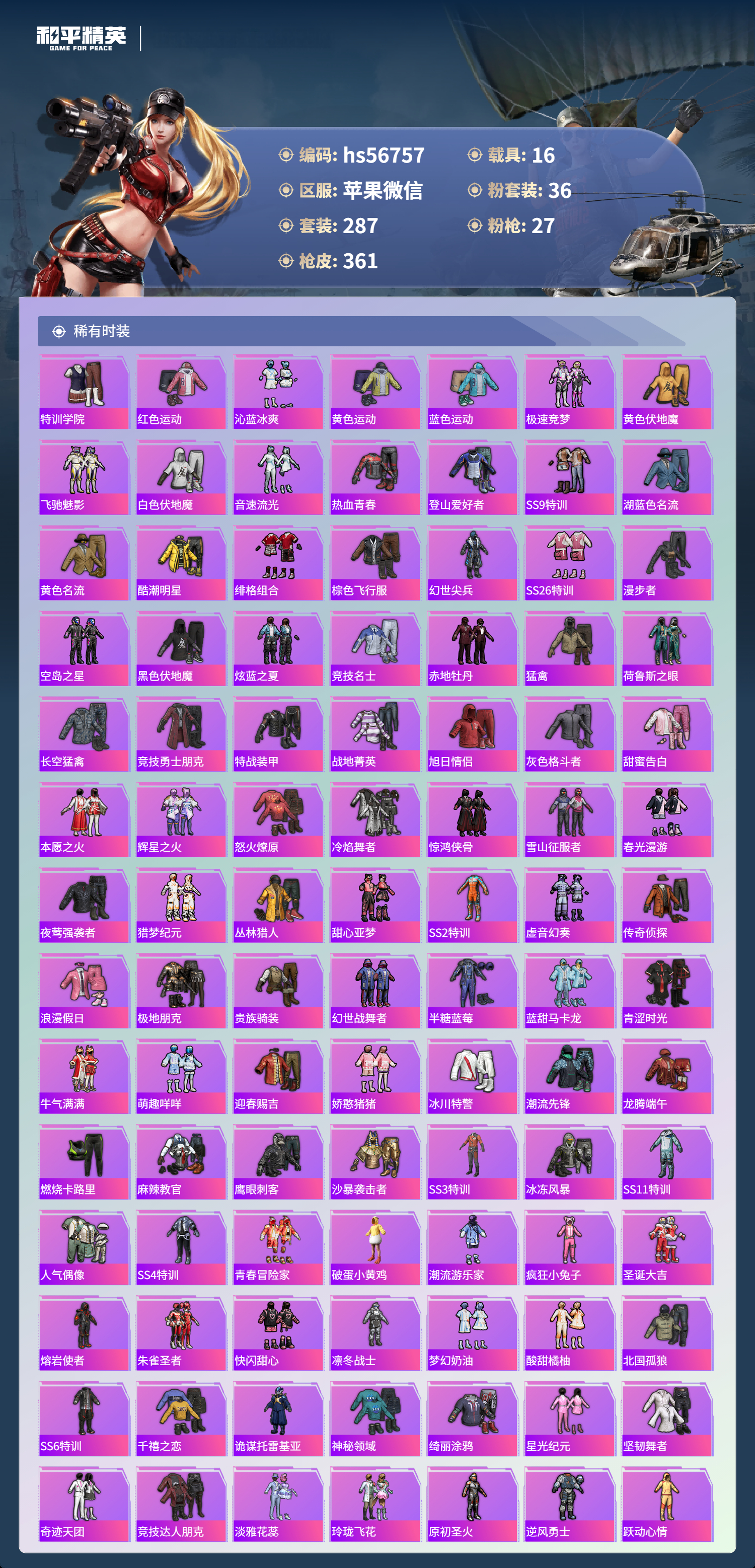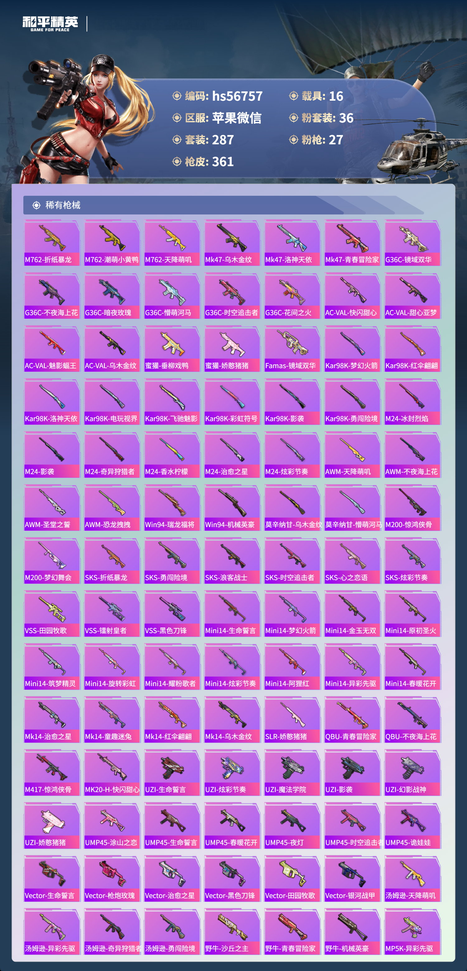 hs56757 苹果微信-23王牌印记-有战神框-3红装-36粉装-27特效枪-16载具-热力值-287套装-361枪皮-6卓越印记-4传奇印记