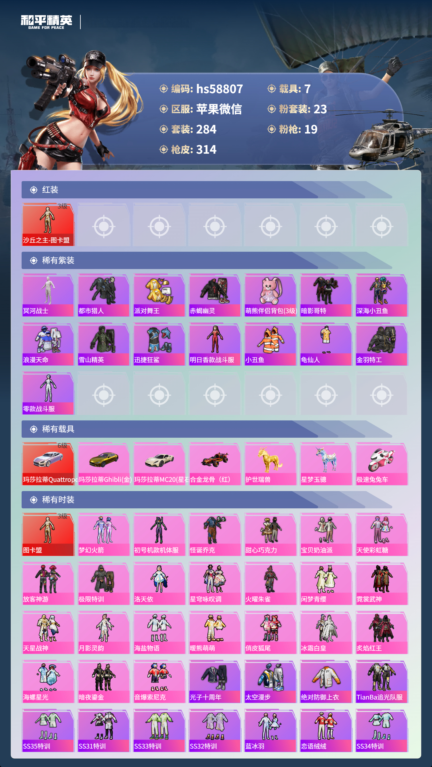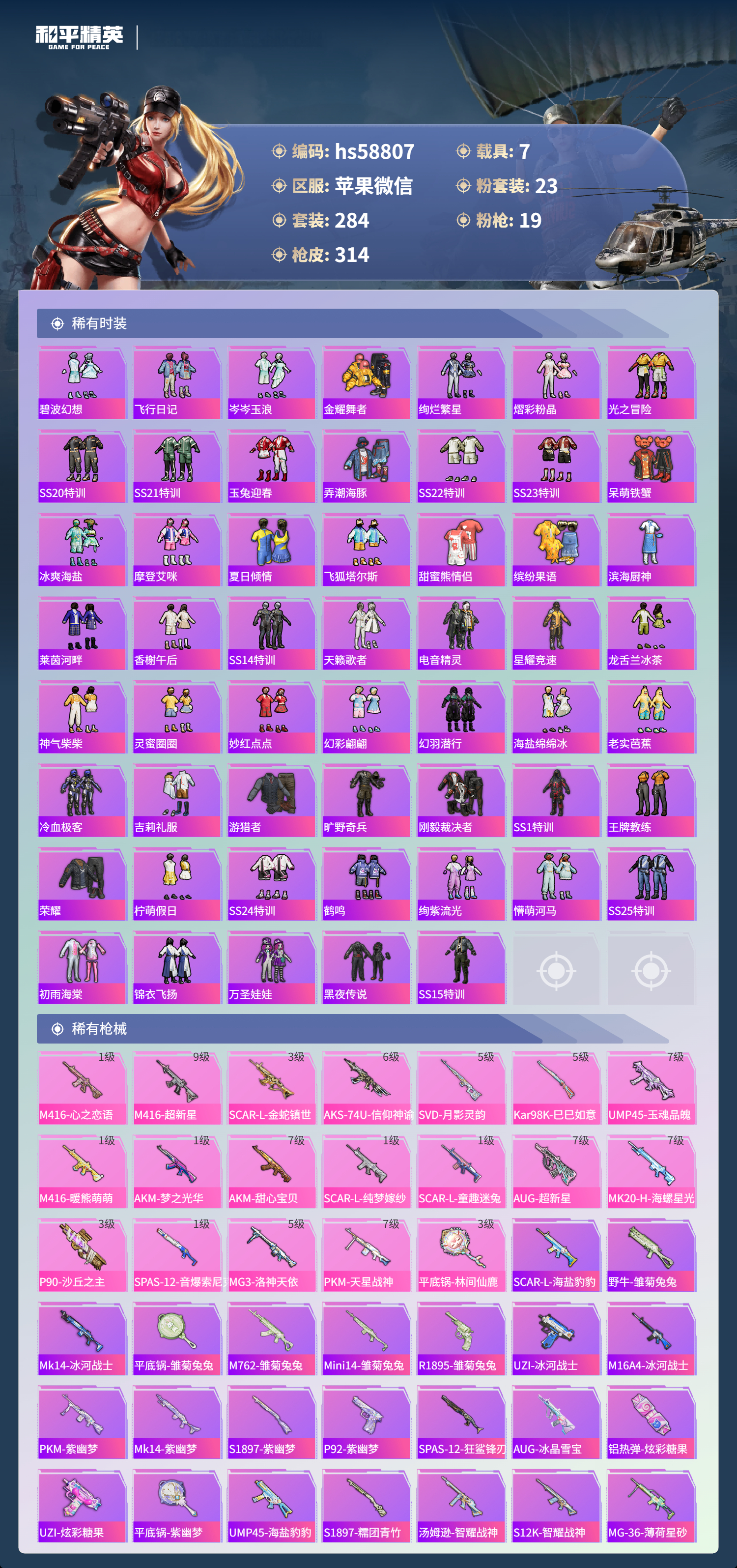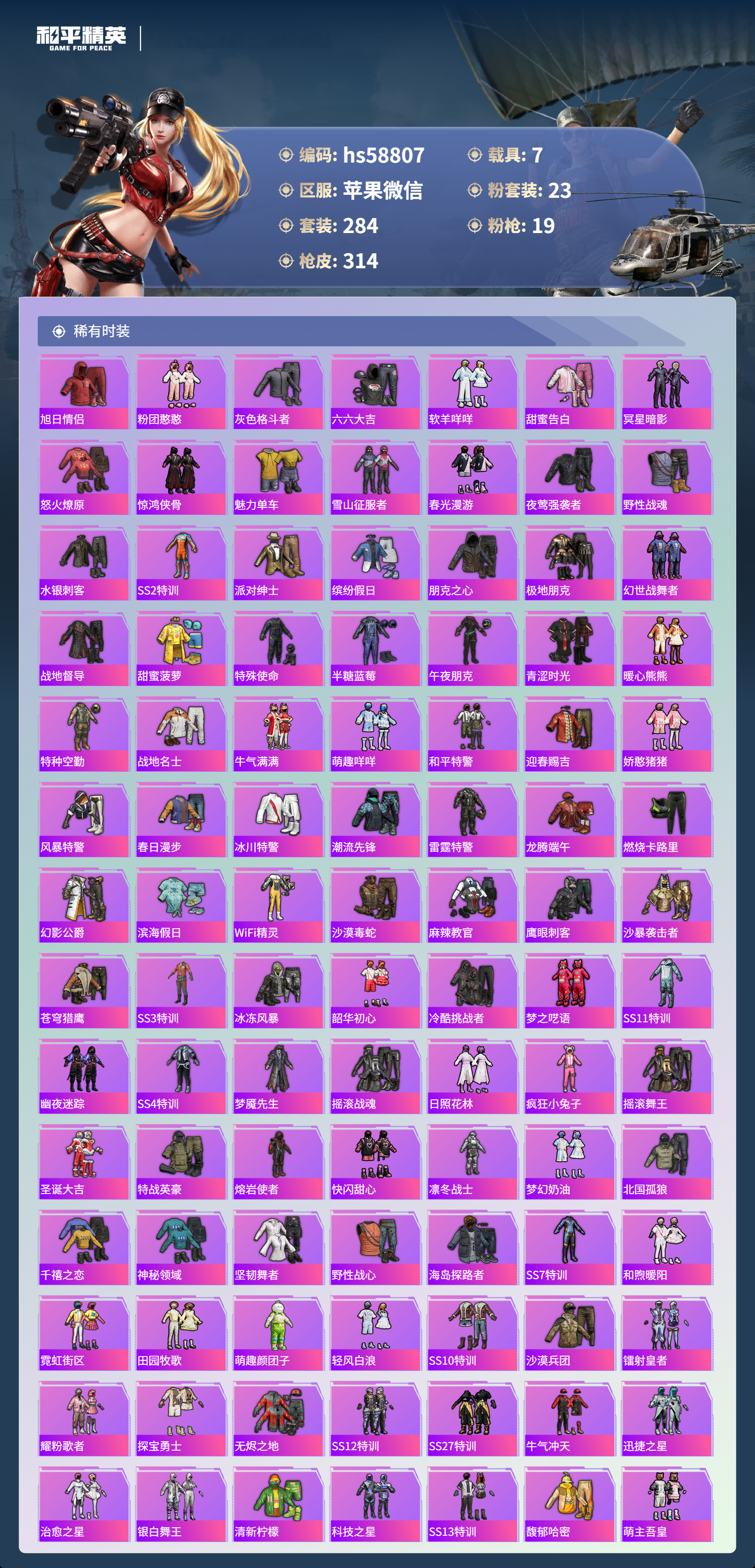hs58807 苹果微信-30王牌印记-有战神框-1红装-23粉装-19特效枪-7载具-热力值-284套装-314枪皮-13卓越印记-13传奇印记