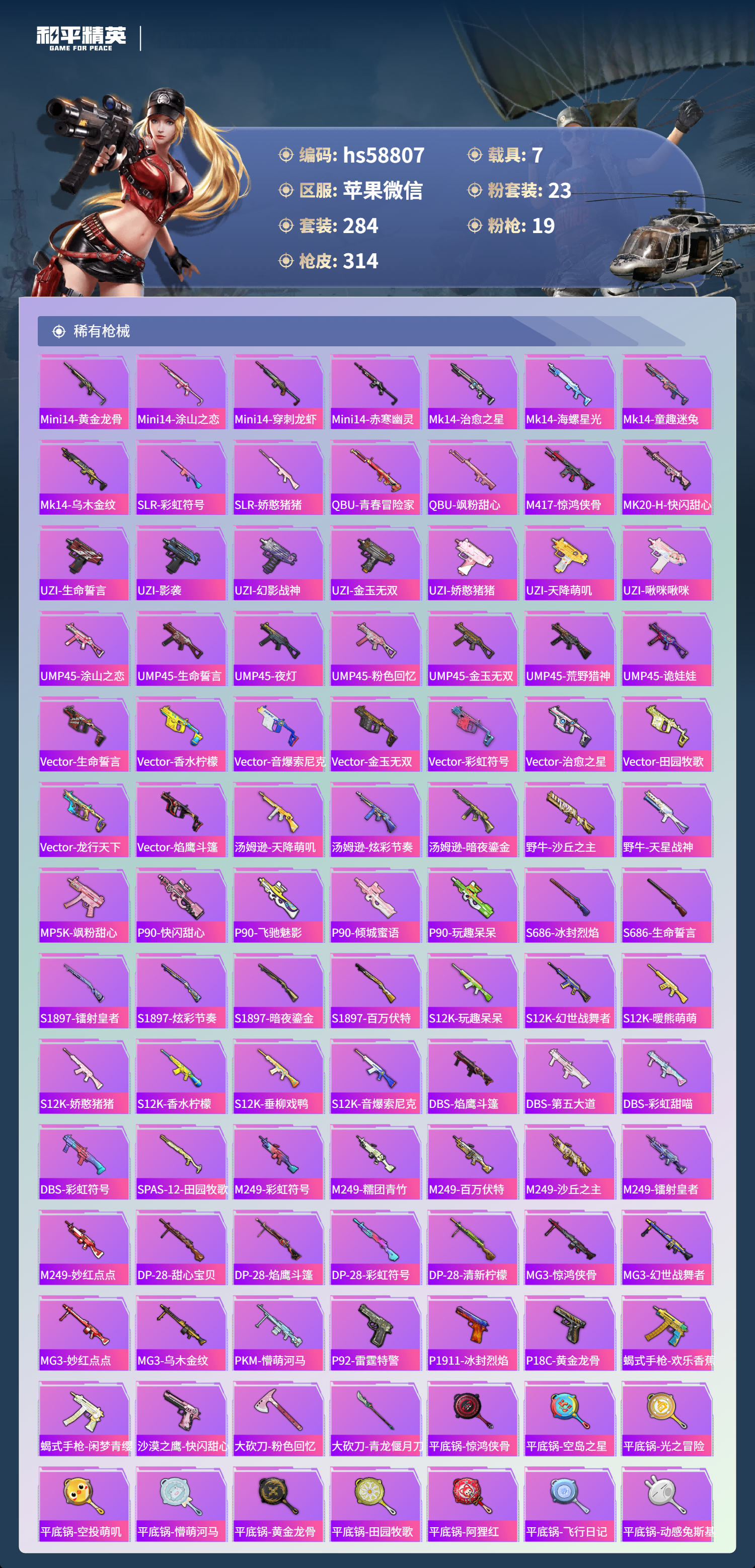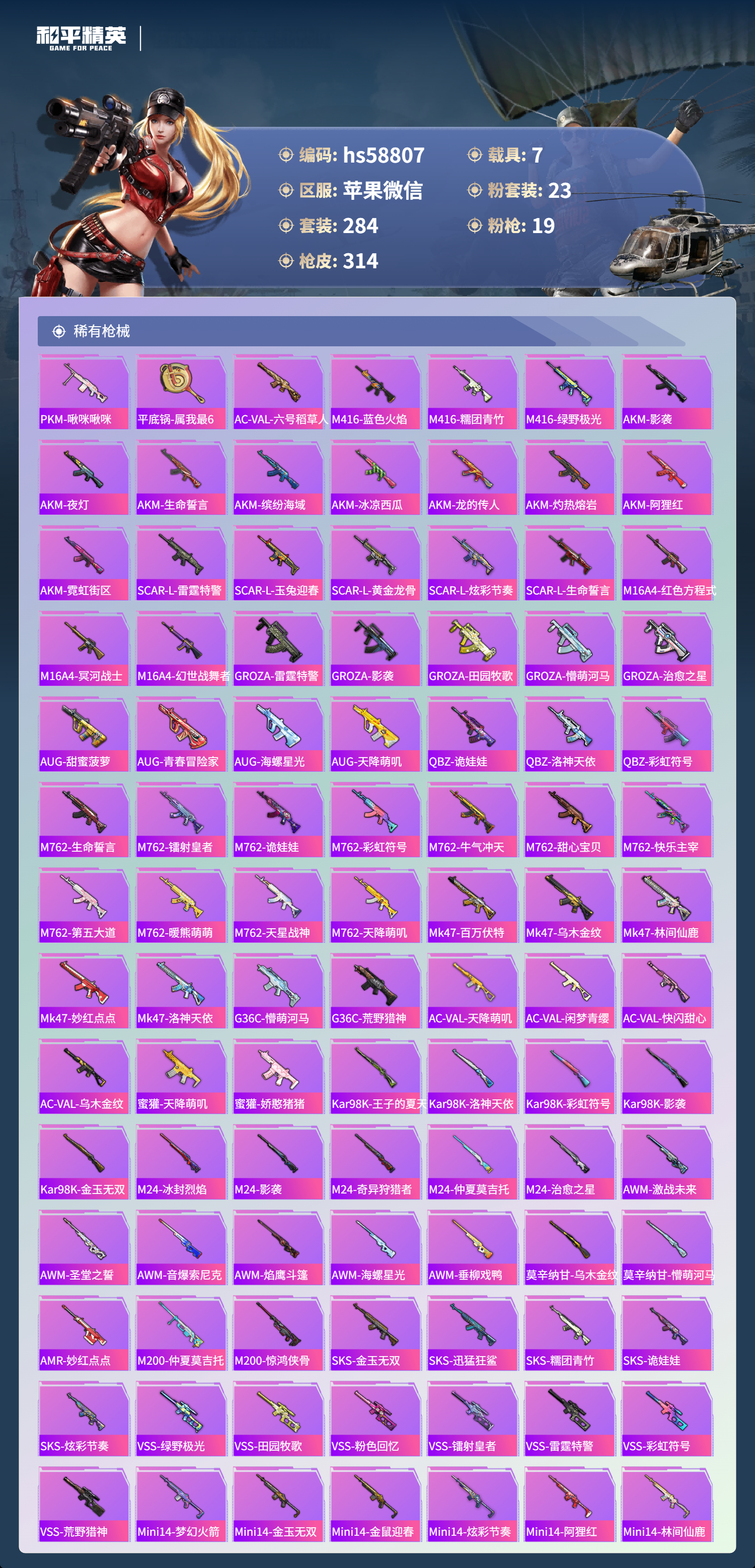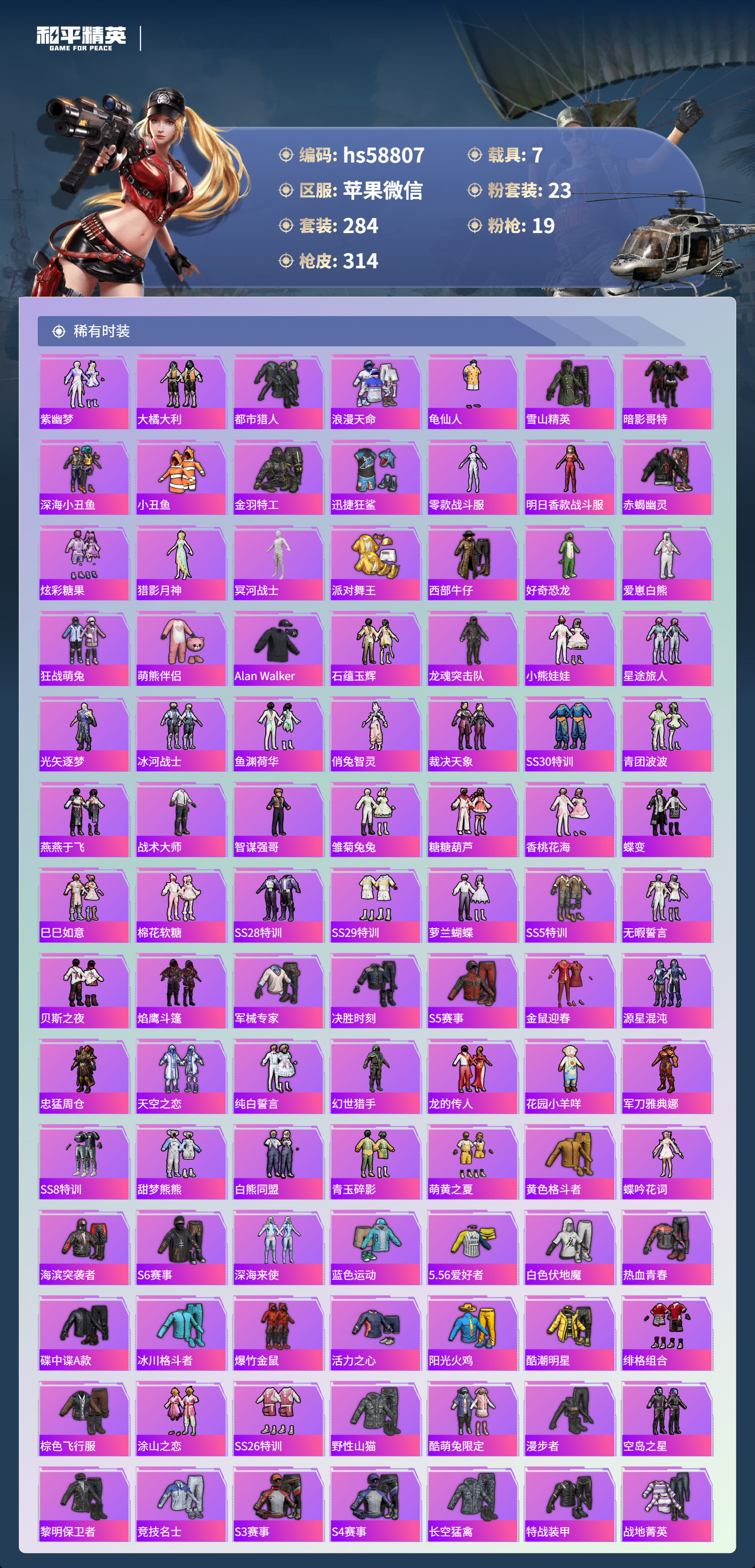 hs58807 苹果微信-30王牌印记-有战神框-1红装-23粉装-19特效枪-7载具-热力值-284套装-314枪皮-13卓越印记-13传奇印记