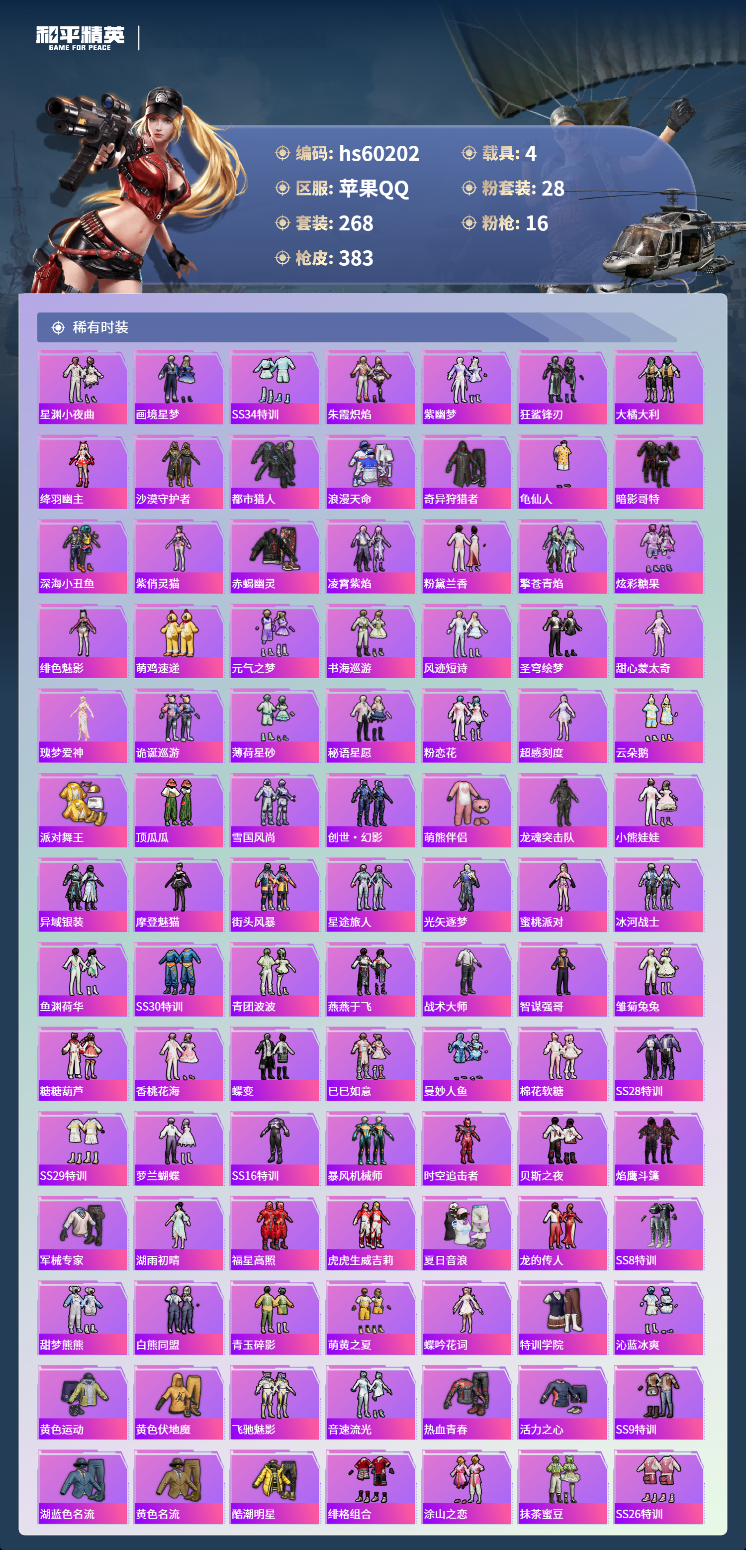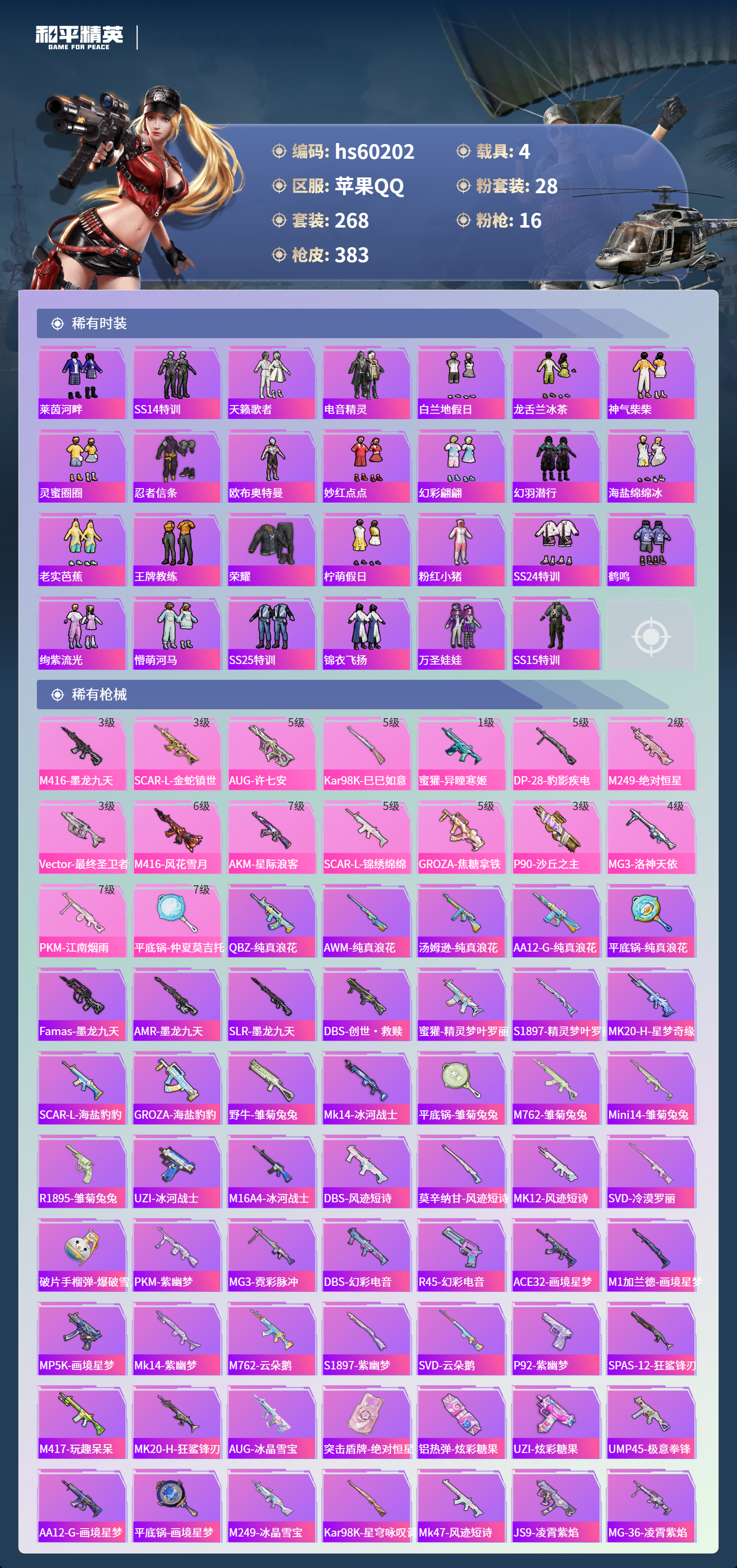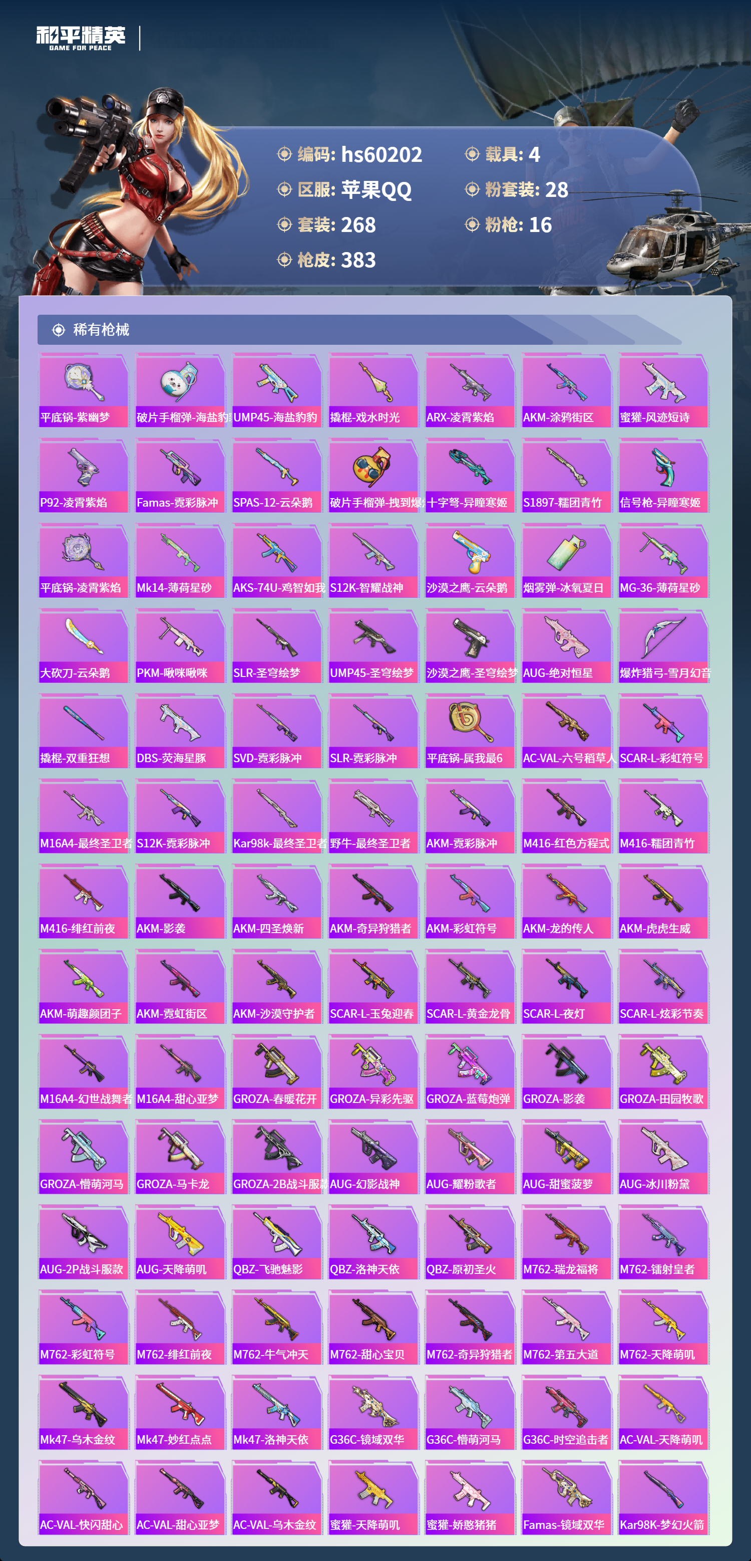 hs60202 苹果手Q-26王牌印记-有战神框-2红装-28粉装-16特效枪-4载具-热力值-268套装-383枪皮-14卓越印记-14传奇印记