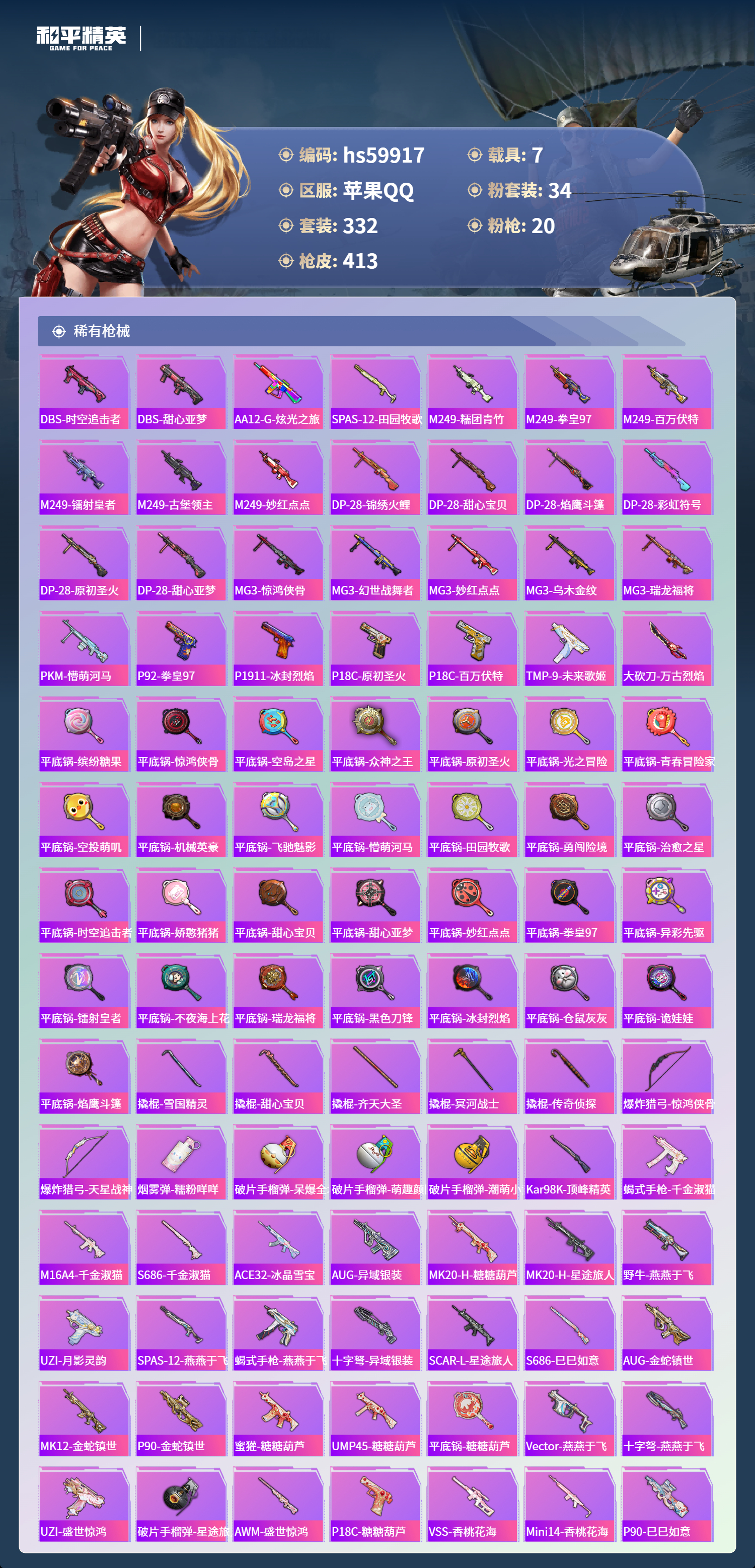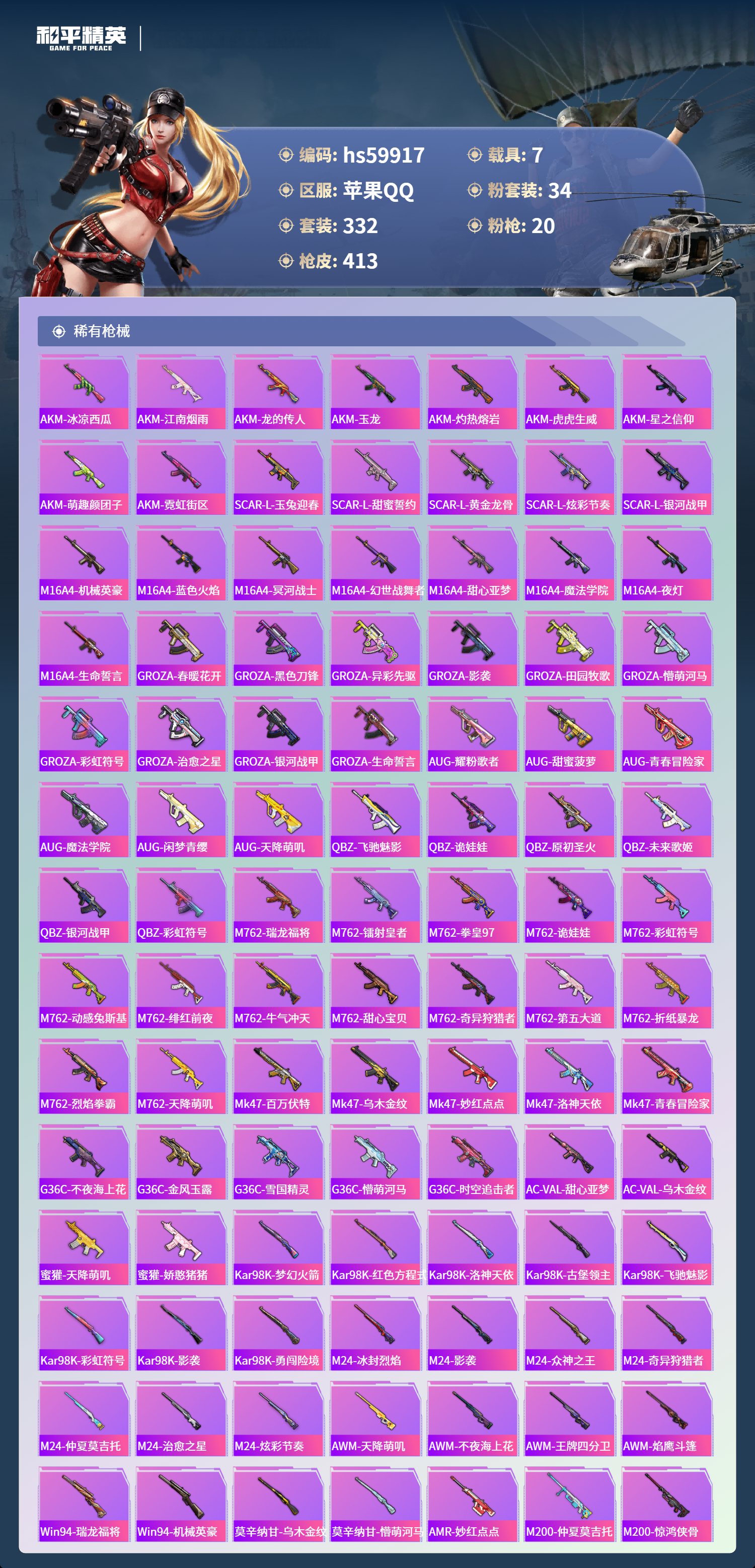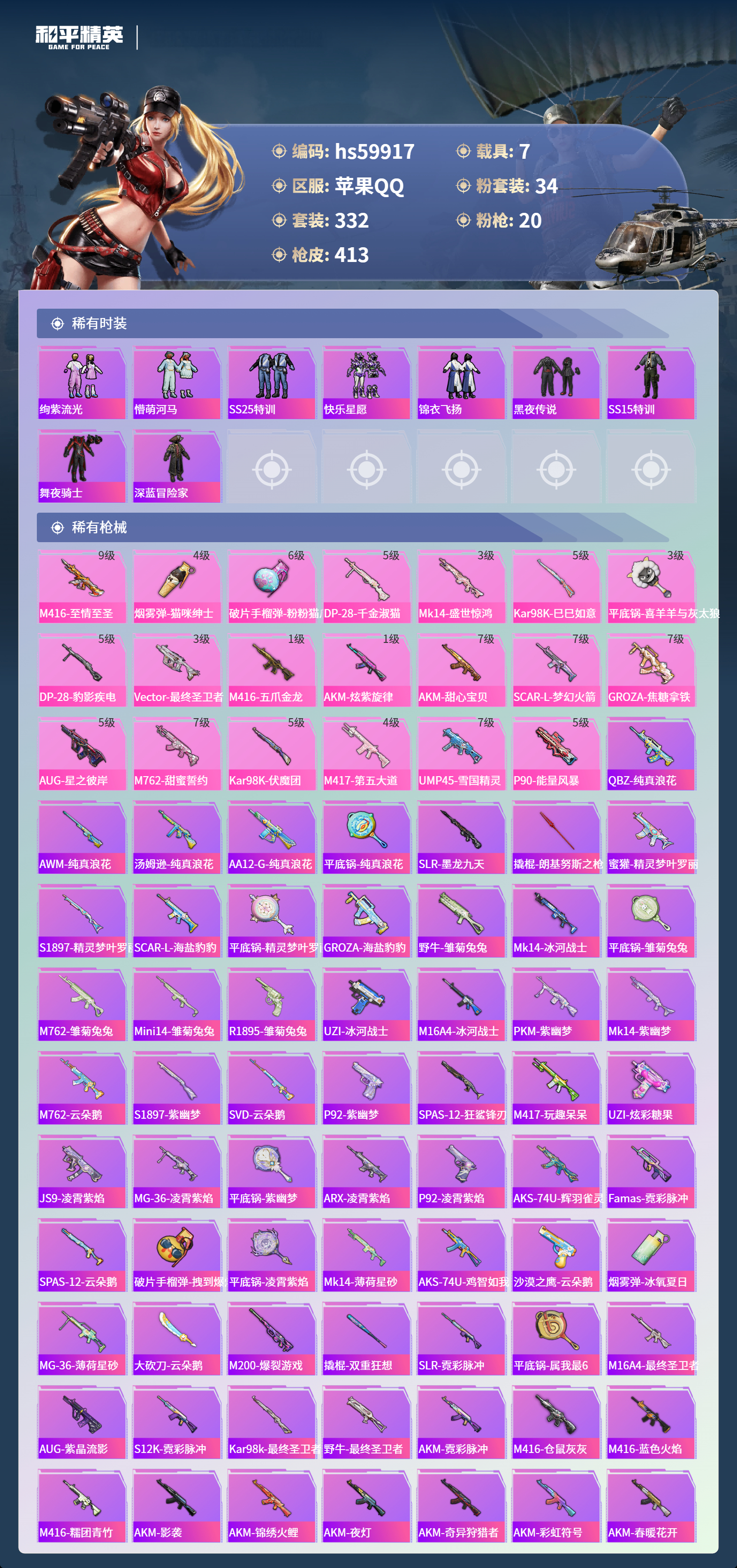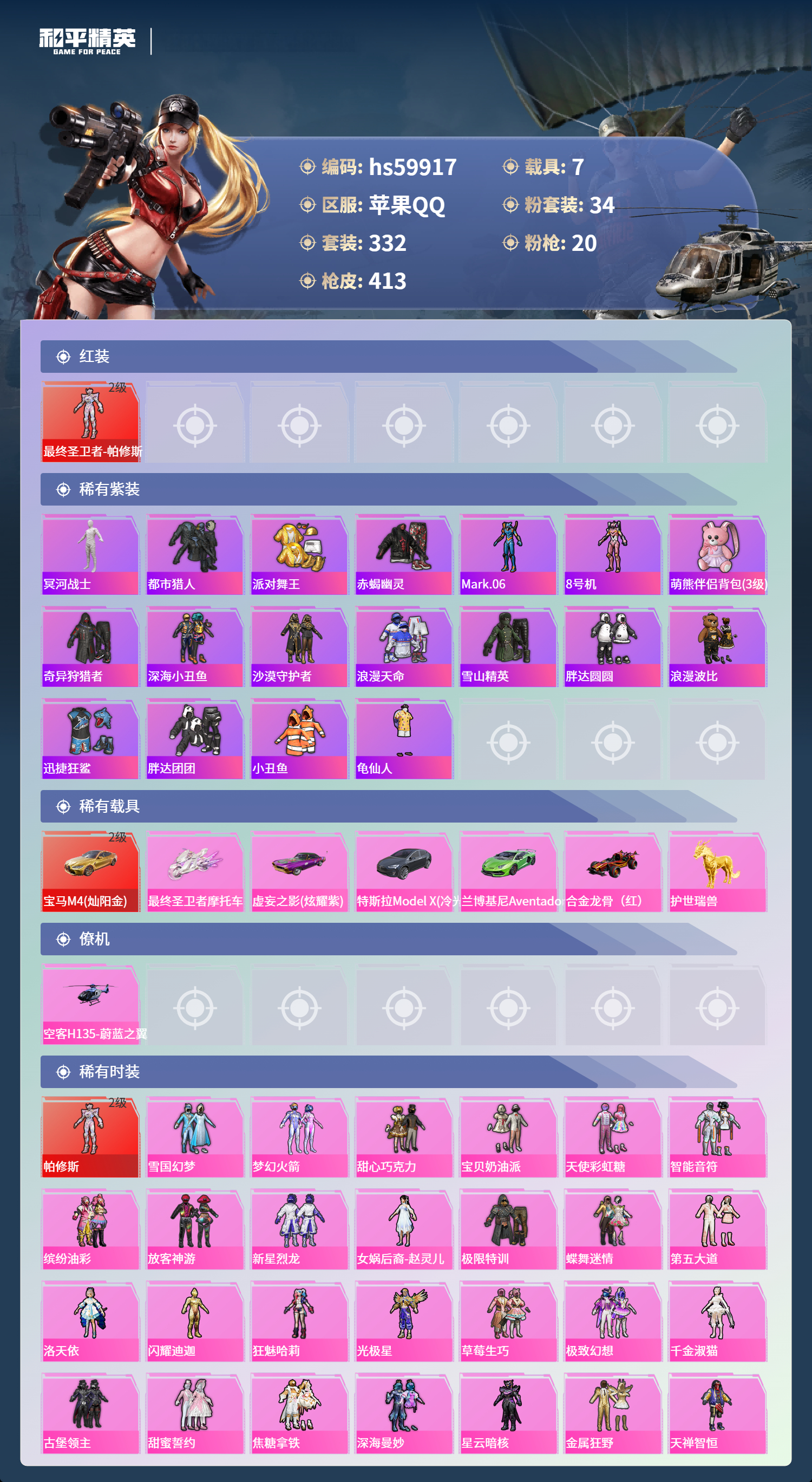 hs59917 苹果手Q-29王牌印记-有战神框-1红装-34粉装-20特效枪-7载具-热力值-332套装-413枪皮-4卓越印记-2传奇印记
