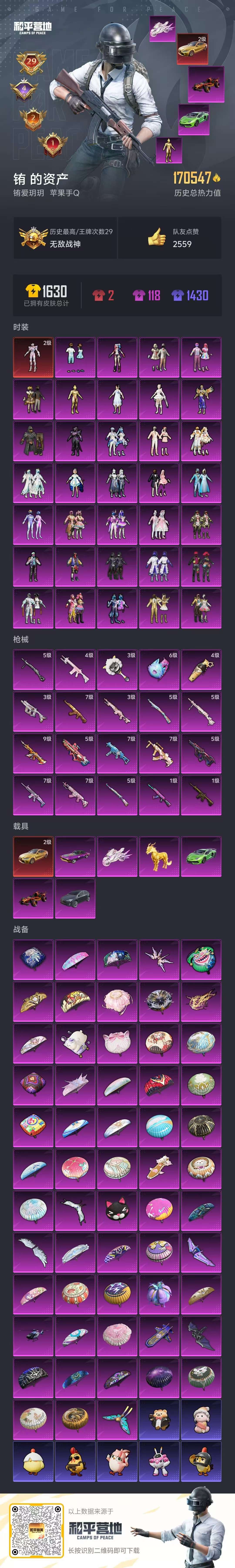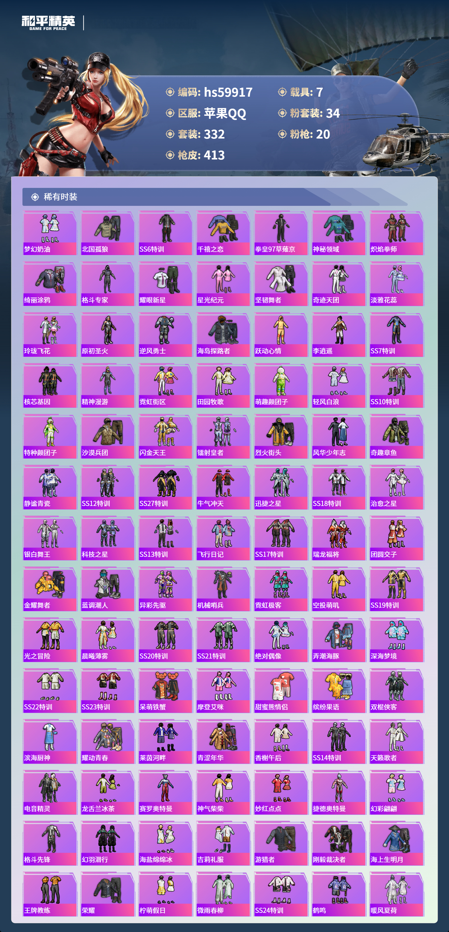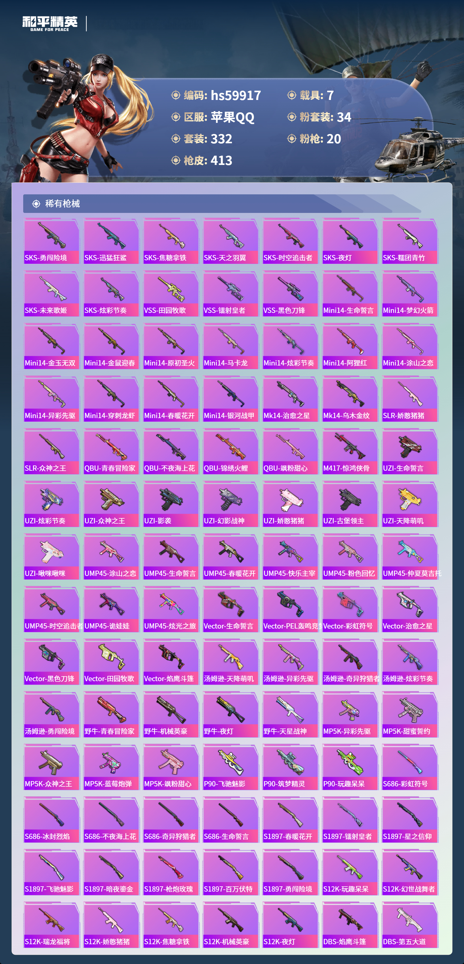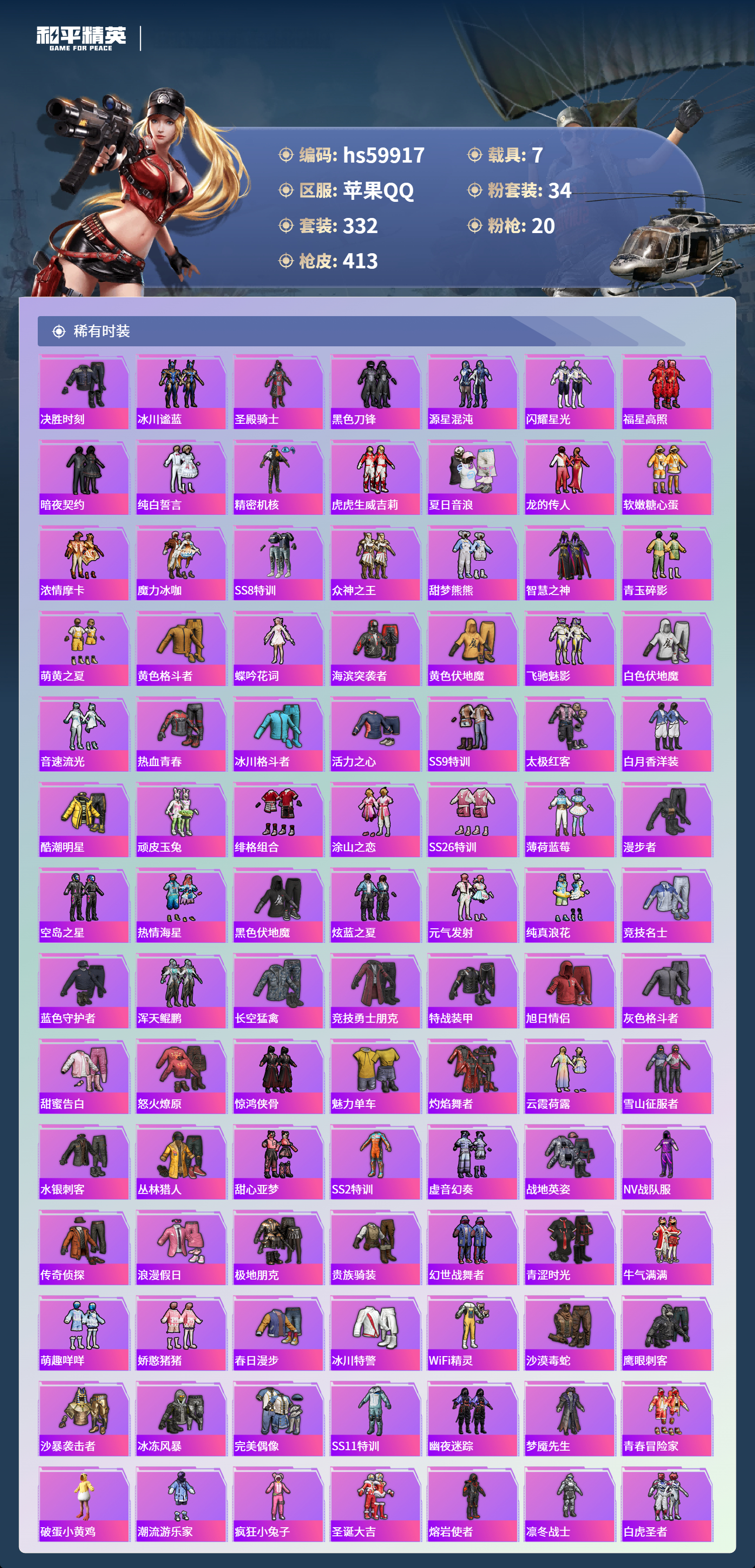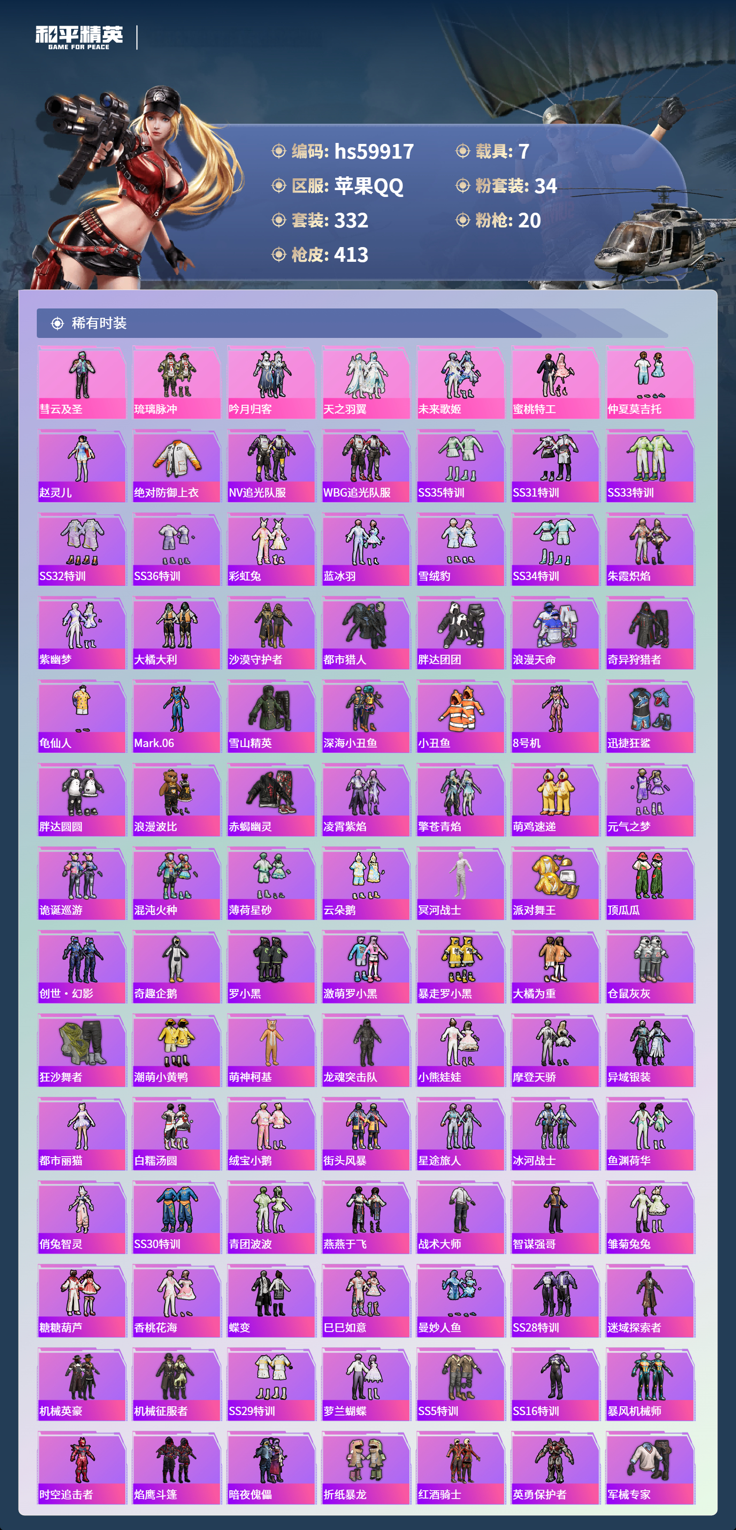 hs59917 苹果手Q-29王牌印记-有战神框-1红装-34粉装-20特效枪-7载具-热力值-332套装-413枪皮-4卓越印记-2传奇印记