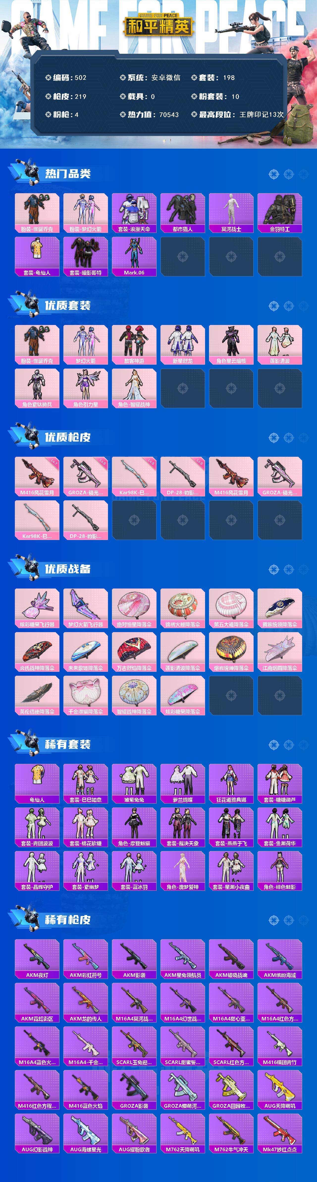 安卓 微信-10粉装-4特效枪-0载具-2粉色飞行器-70543热力值-13王牌印记-198套装-219枪皮