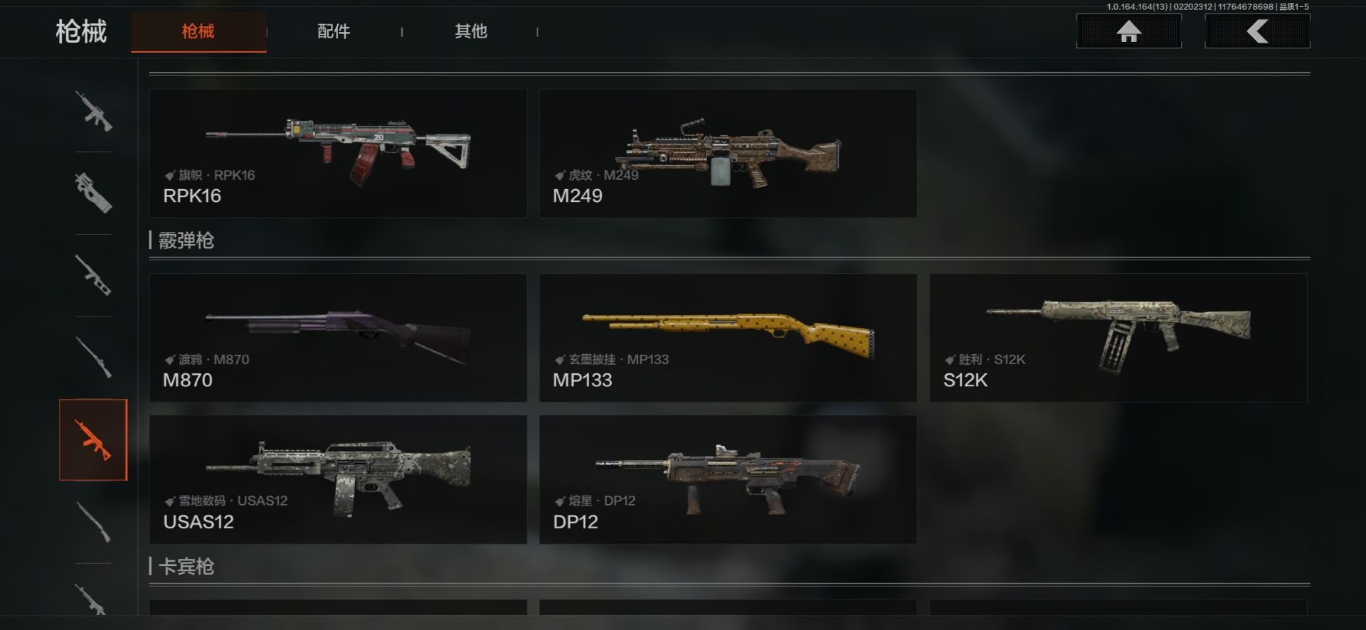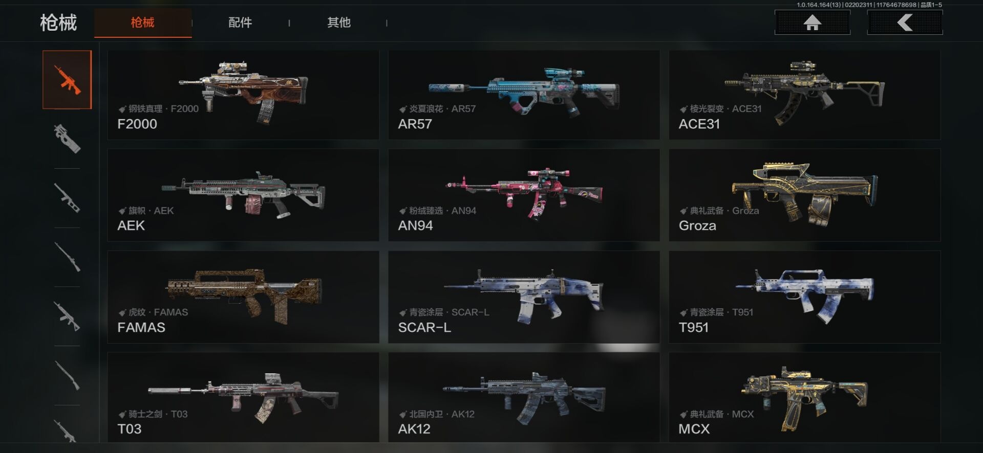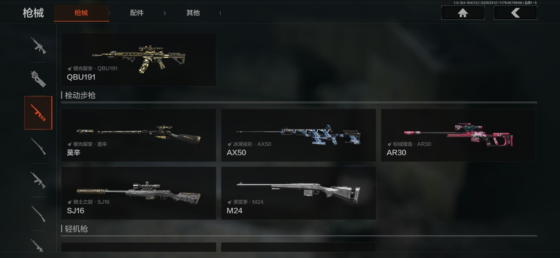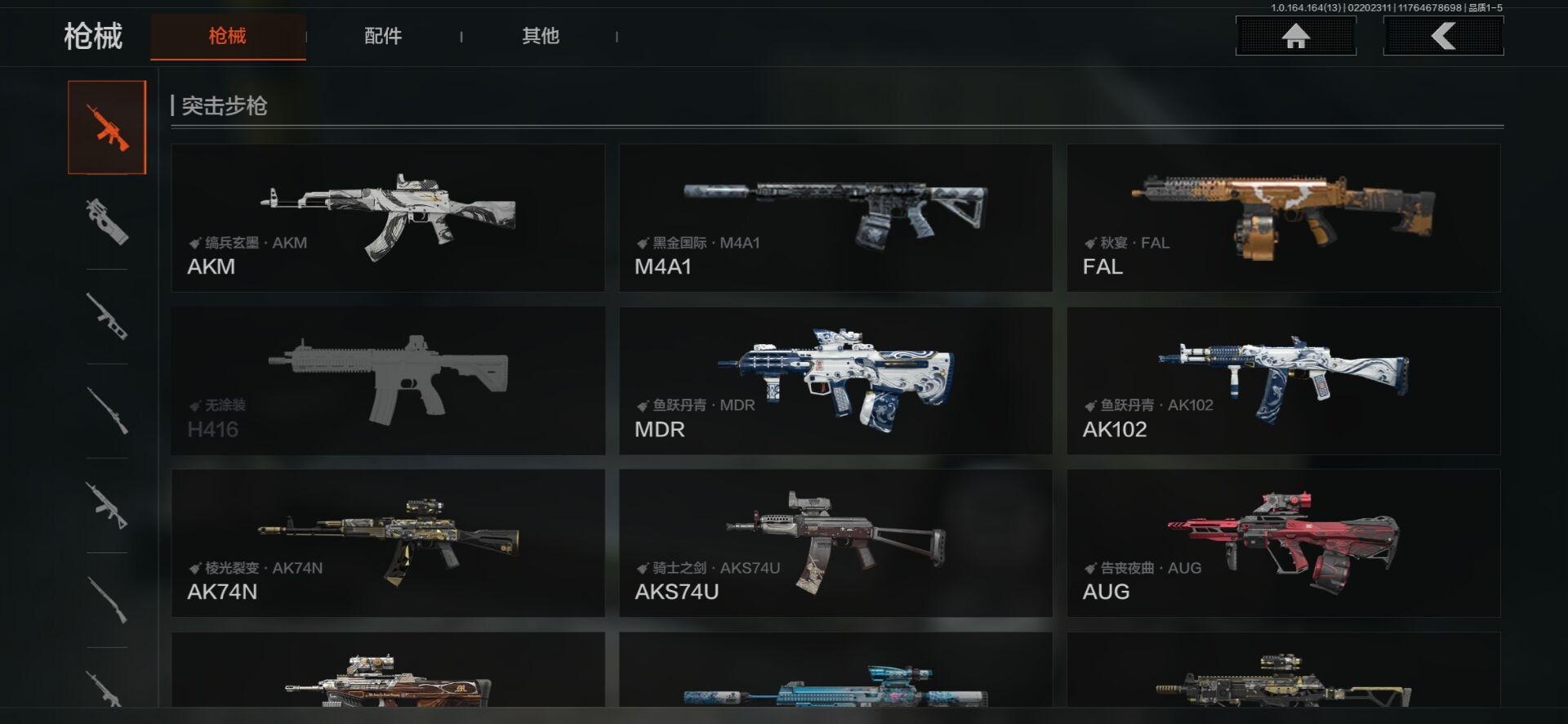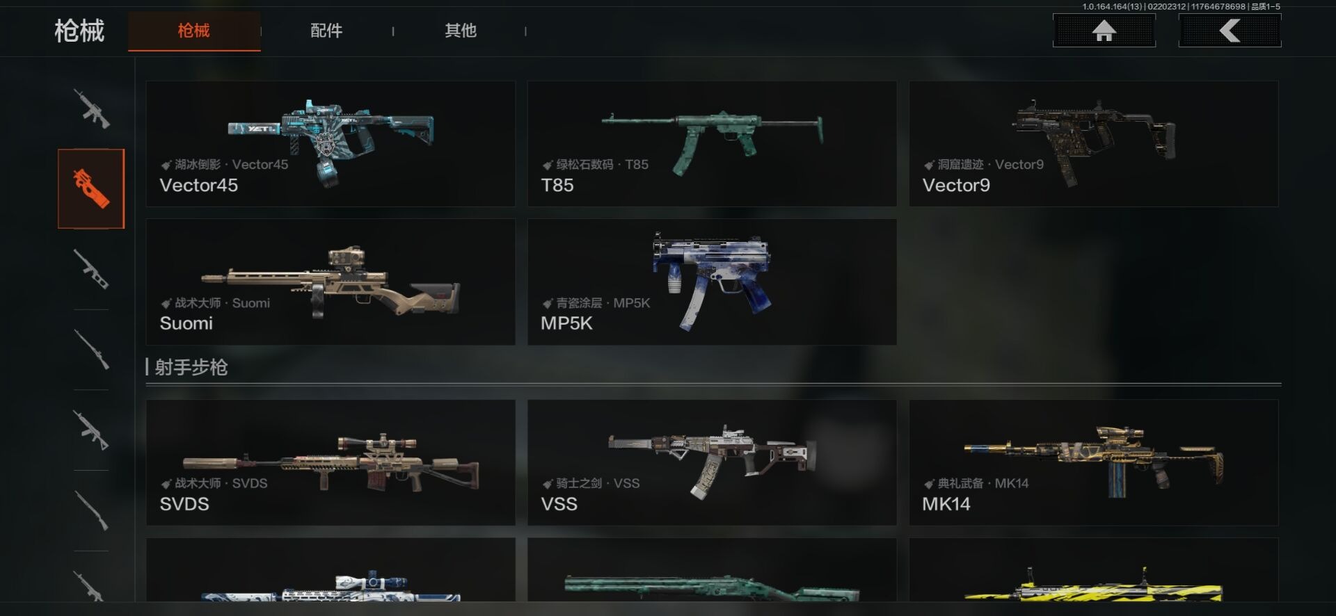 【紫色枪皮】鱼跃丹青·DT MDR,鱼跃丹青·AK102,典礼武备·GROZA,典礼武备·MCX,典礼武备·MK14,棱光裂变·莫辛,火力倾泻·AUG,棱光裂变·AK74N,棱光裂变·ACE31,旗帜·RPK16,骤羽尖啸·MPX,粉绒臻选·AR30,战术大师·SVDS,粉绒臻选·AN94,粉绒臻选·SKS,战术大师·