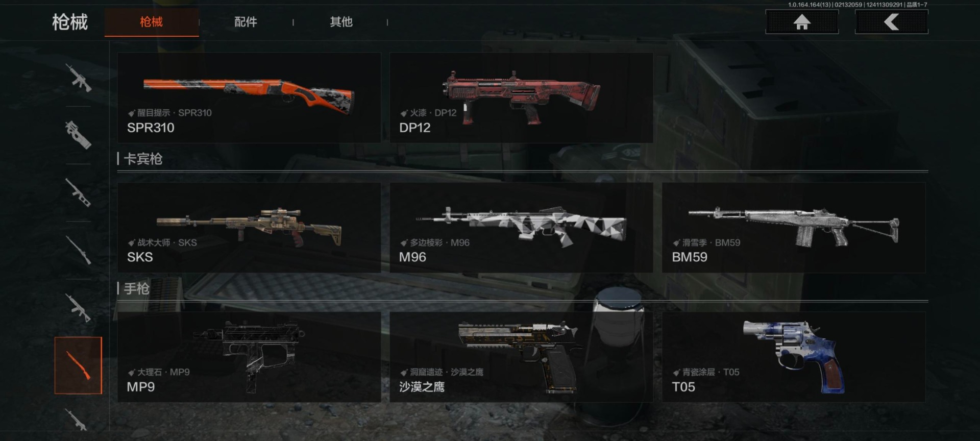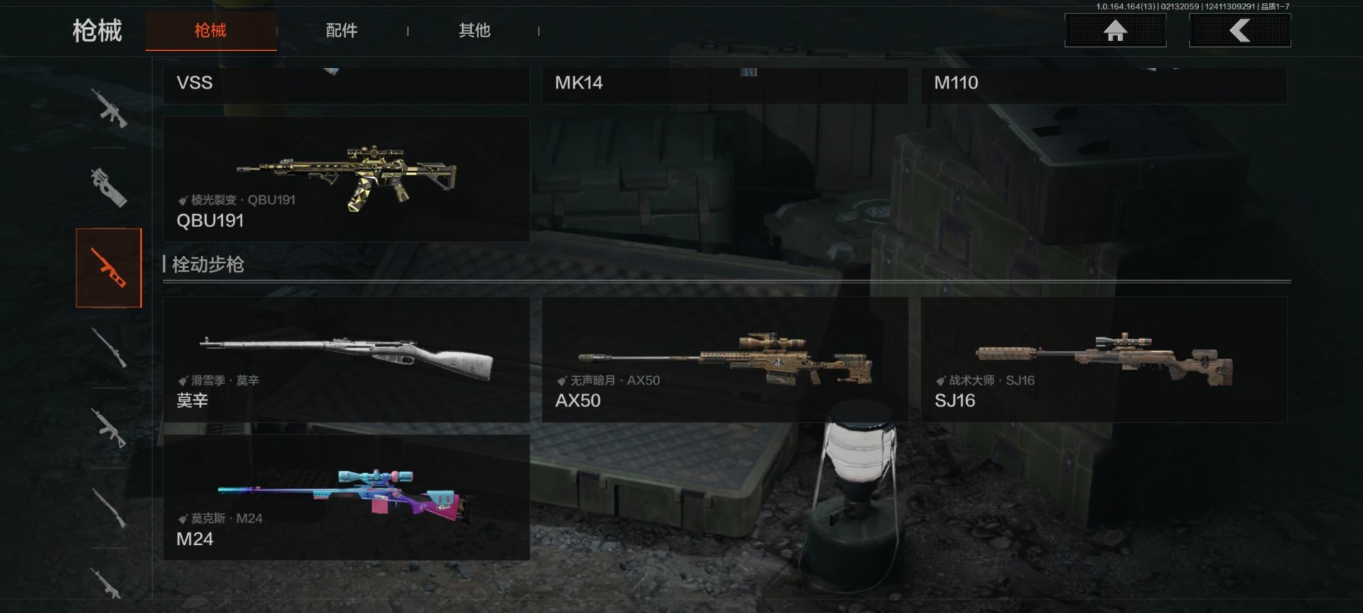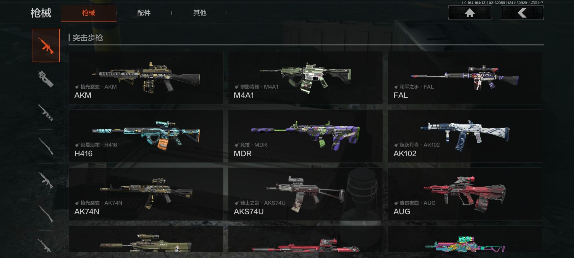 【紫色枪皮】鱼跃丹青·AK102,骤羽尖啸·AK12,典礼武备·GROZA,竞技·MDR,棱光裂变·AKM,莫克斯·M24,宝石籽料·P90,粉绒臻选·AN94,战术大师·SJ16,战术大师·SKS,无声暗月·AX50,危崖敌影·MPX,深潜·T03,骑士之剑·AKS74U,掌中