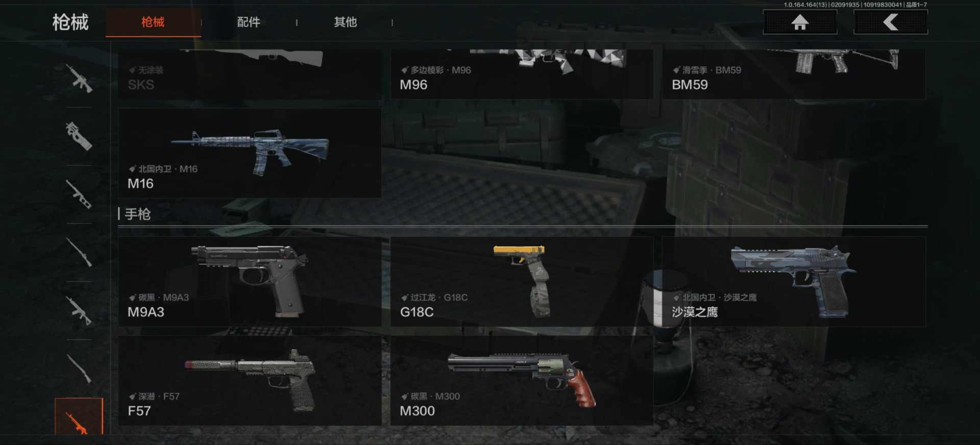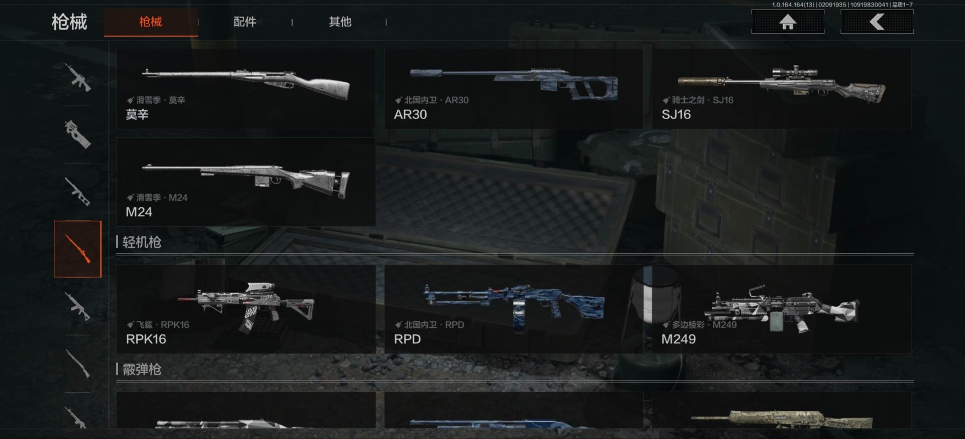 【紫色枪皮】旗帜·SVDS,棱光裂变·AK102,火力倾泻·AUG,棱光裂变·AKM,竞技·M4A1,危崖敌影·F2000,骑士之剑·SJ16,骑士之剑·ACE31,北国内卫·AN94,北国内卫·MDR,骑士之剑·
