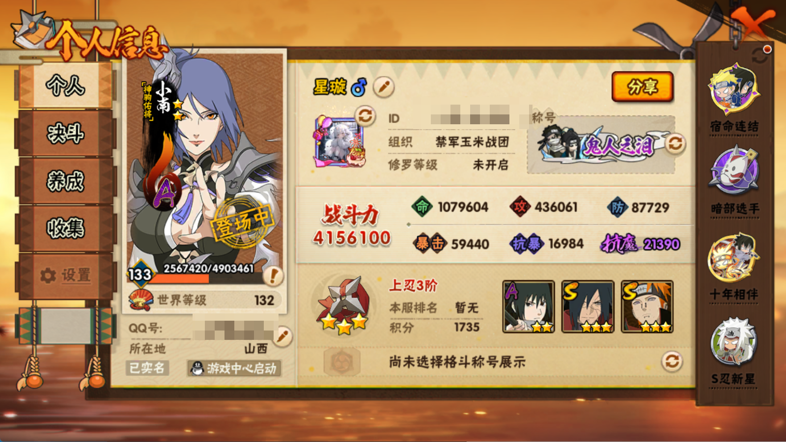 (可转苹果)415W战力 解斑 传自6S+198直购妖怪纲手+骨架 巳月19A+双百战