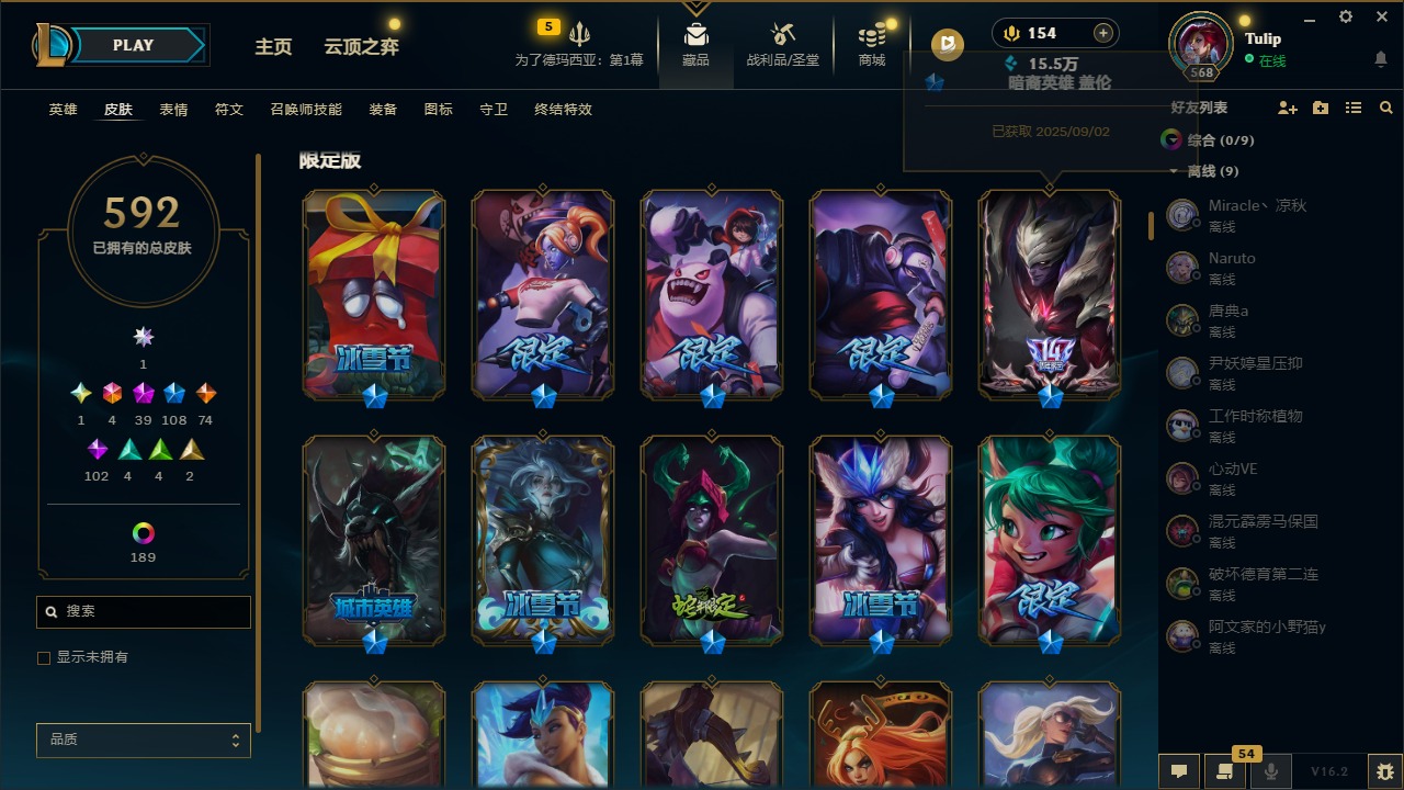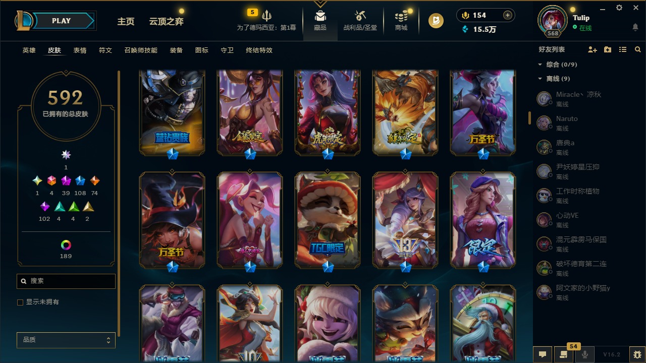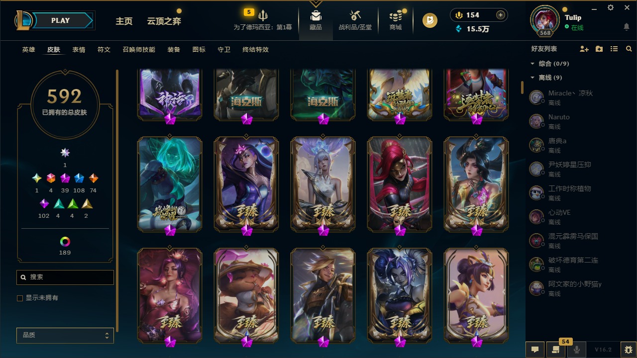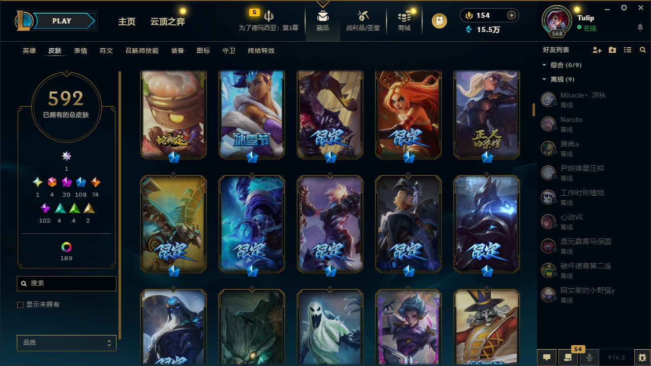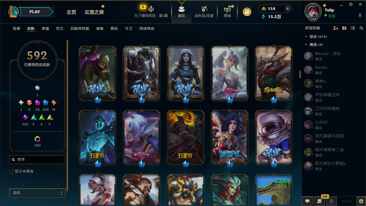 3卓越 1圣堂 4终极 39神话 108限定 74传说 102史诗 592皮肤 240炫彩 172英雄 可二次