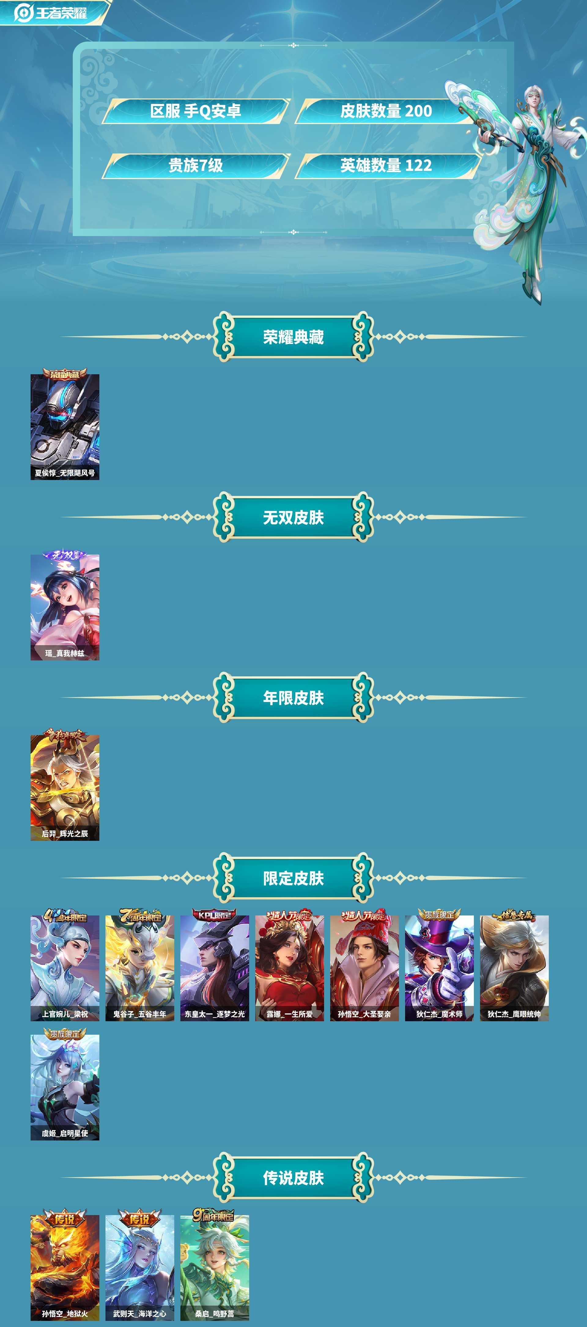 传说皮肤:桑启鸣野蒿,虞姬启明星使,武则天海洋之心,铠曙光守护者,孙悟空地狱火 武则天