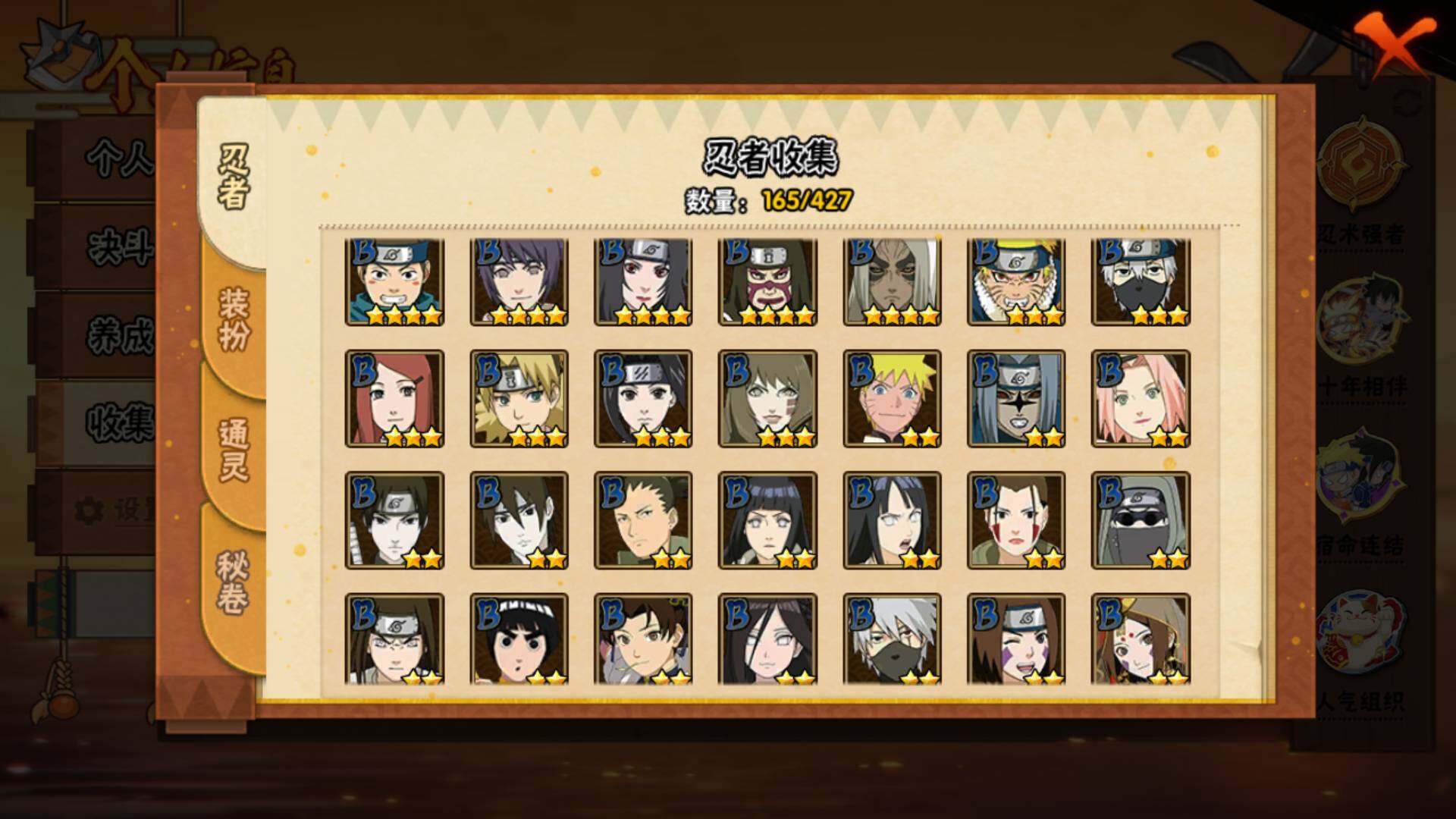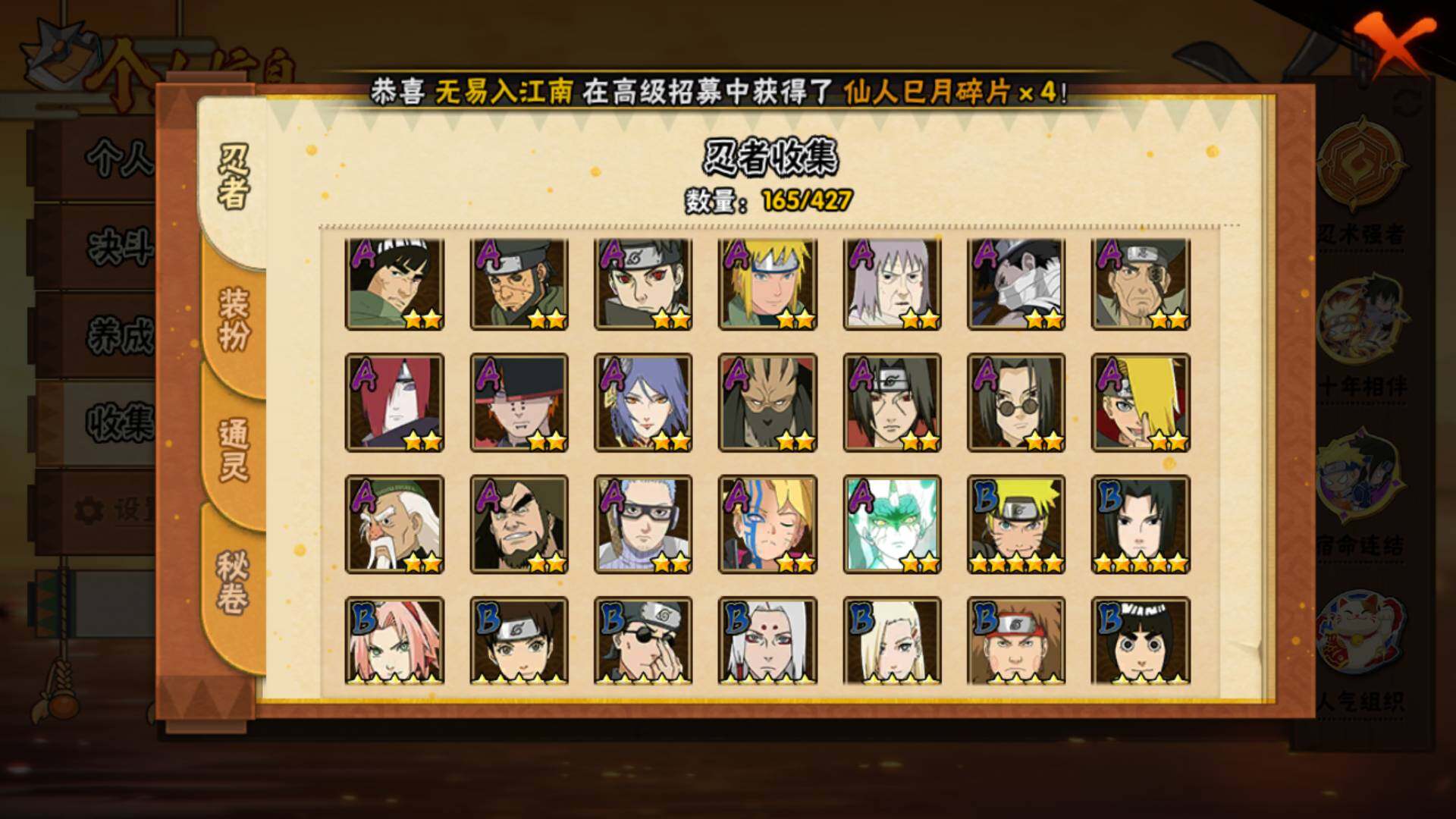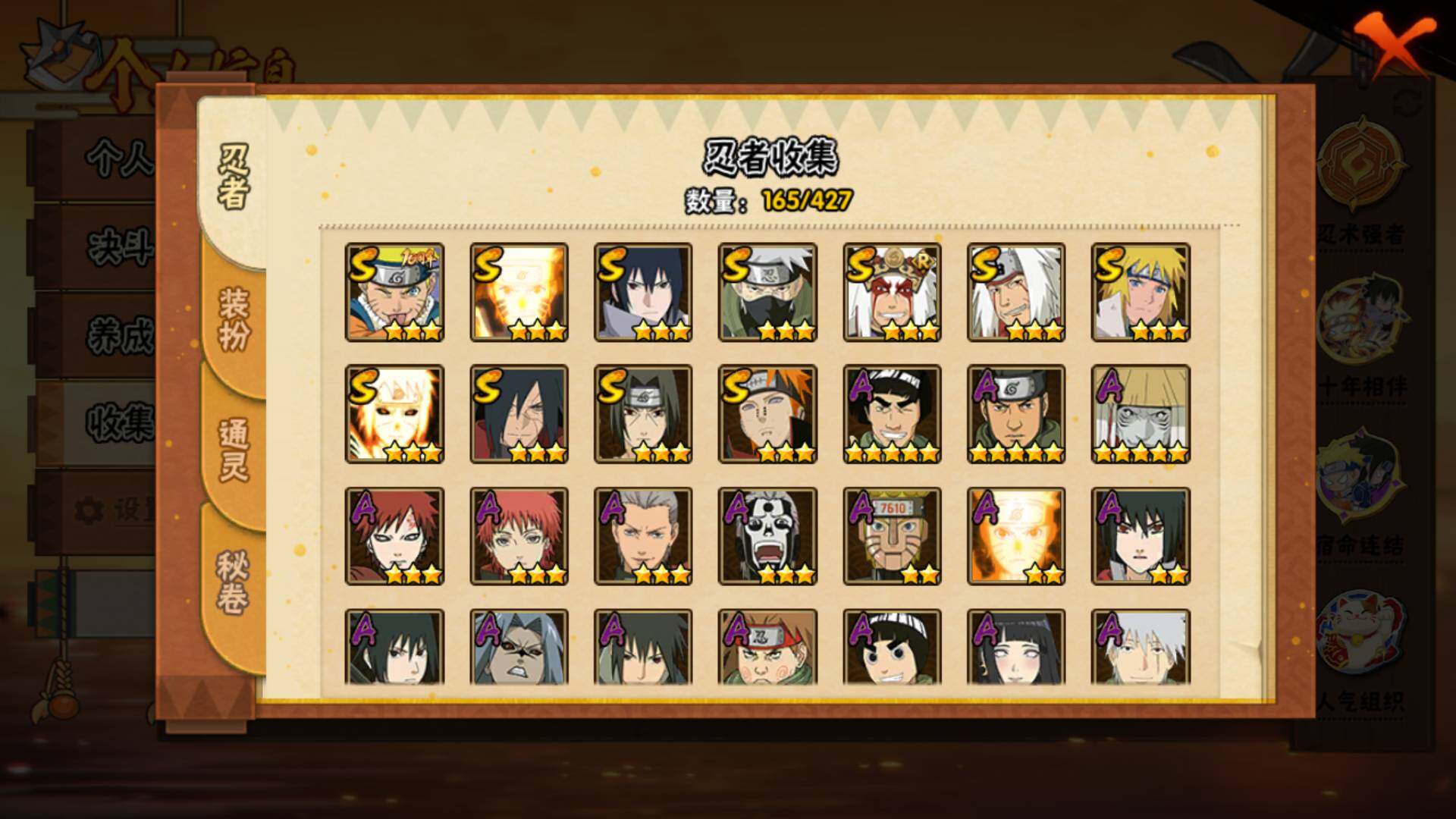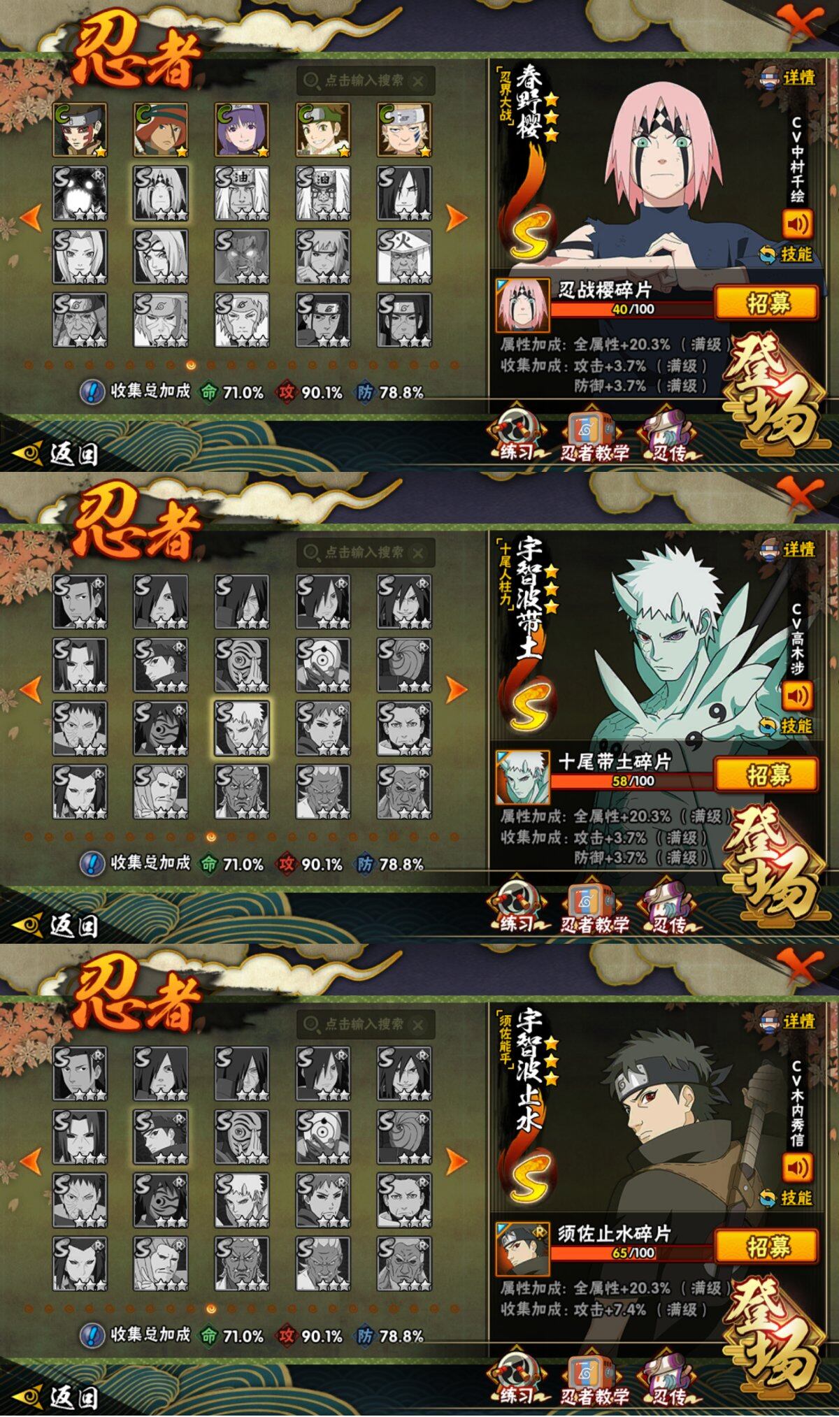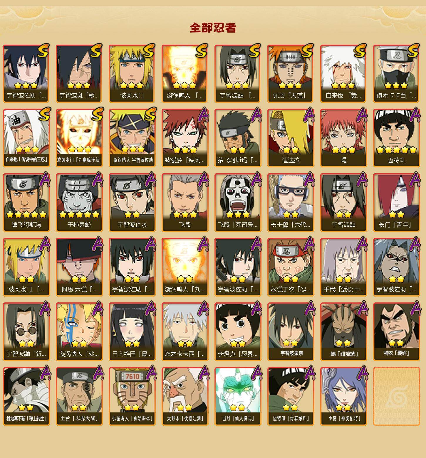 【S级忍者】:宇智波斑「秽土转生·解」(3星),宇智波鼬「须佐能乎」(3星),旗木卡卡西「须佐能乎」(3星),自来也「舞之豪杰」(3星),自来也「传说中的三忍」(3星),波风水门(3星),漩涡鸣人「