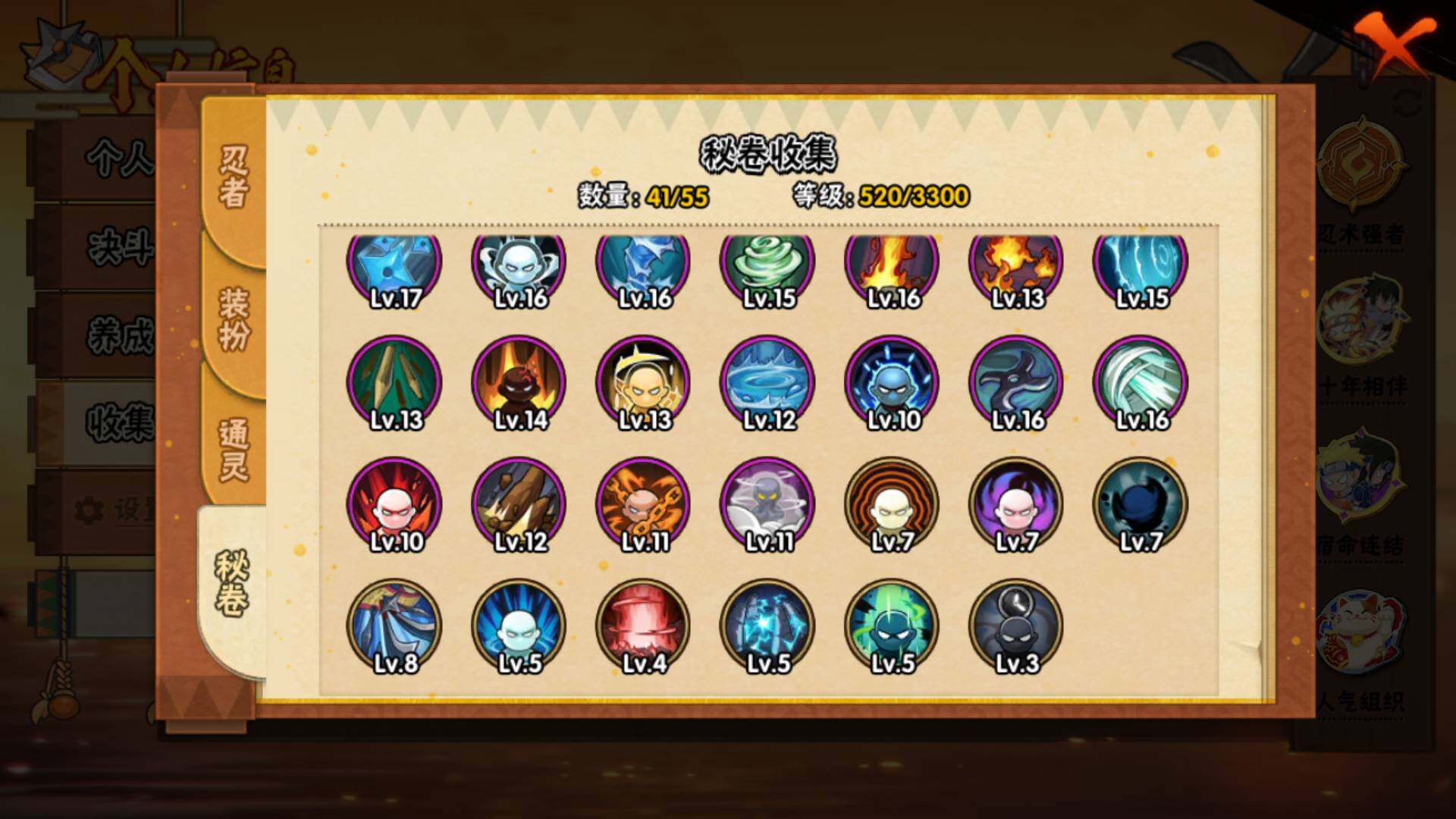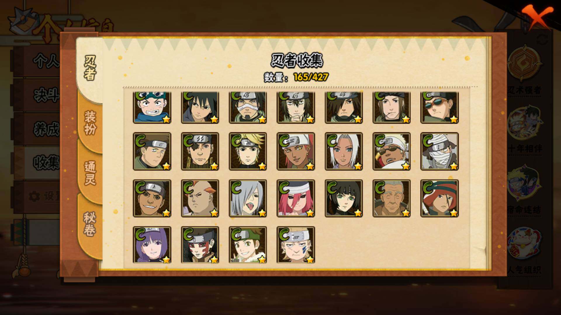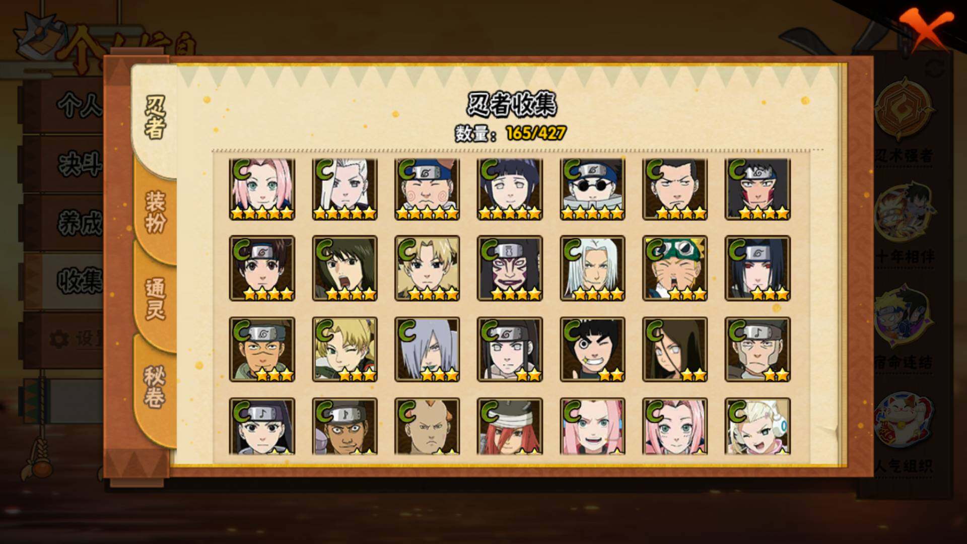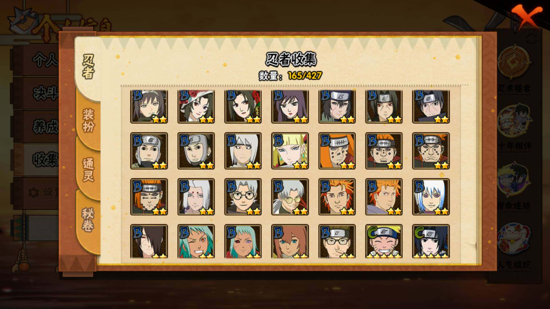 【S级忍者】:宇智波斑「秽土转生·解」(3星),宇智波鼬「须佐能乎」(3星),旗木卡卡西「须佐能乎」(3星),自来也「舞之豪杰」(3星),自来也「传说中的三忍」(3星),波风水门(3星),漩涡鸣人「