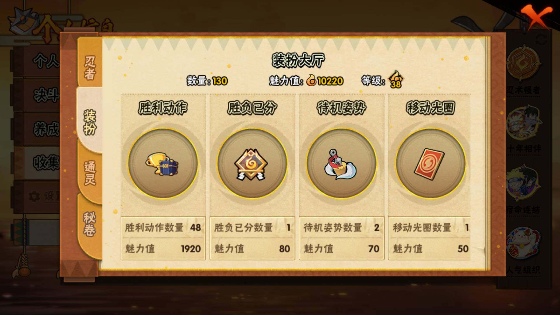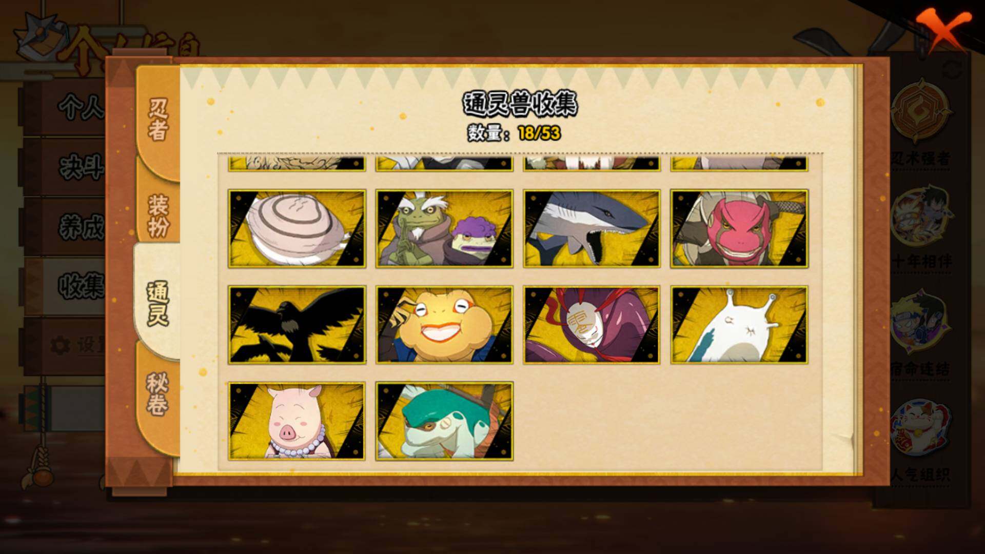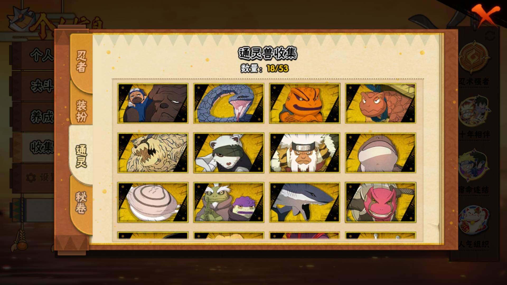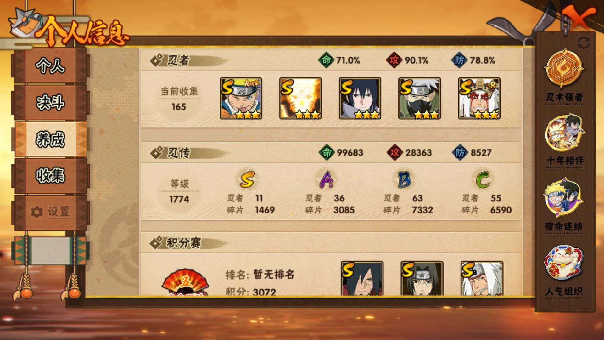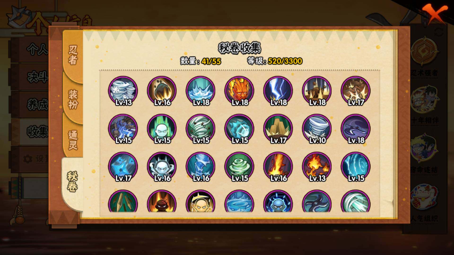 【S级忍者】:宇智波斑「秽土转生·解」(3星),宇智波鼬「须佐能乎」(3星),旗木卡卡西「须佐能乎」(3星),自来也「舞之豪杰」(3星),自来也「传说中的三忍」(3星),波风水门(3星),漩涡鸣人「