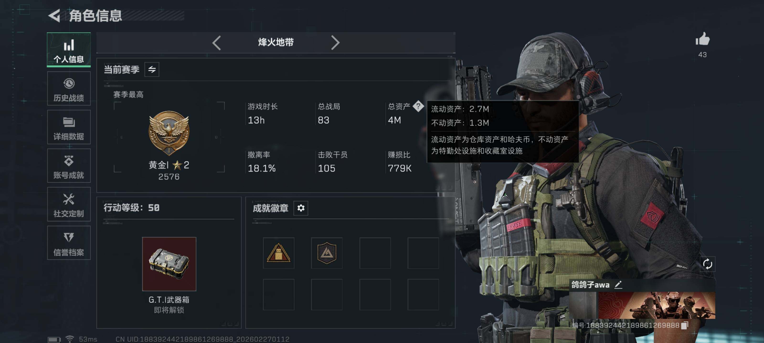 4m总资产-750k哈伏币-50烽火等级-黄金-50战场等级-上等兵