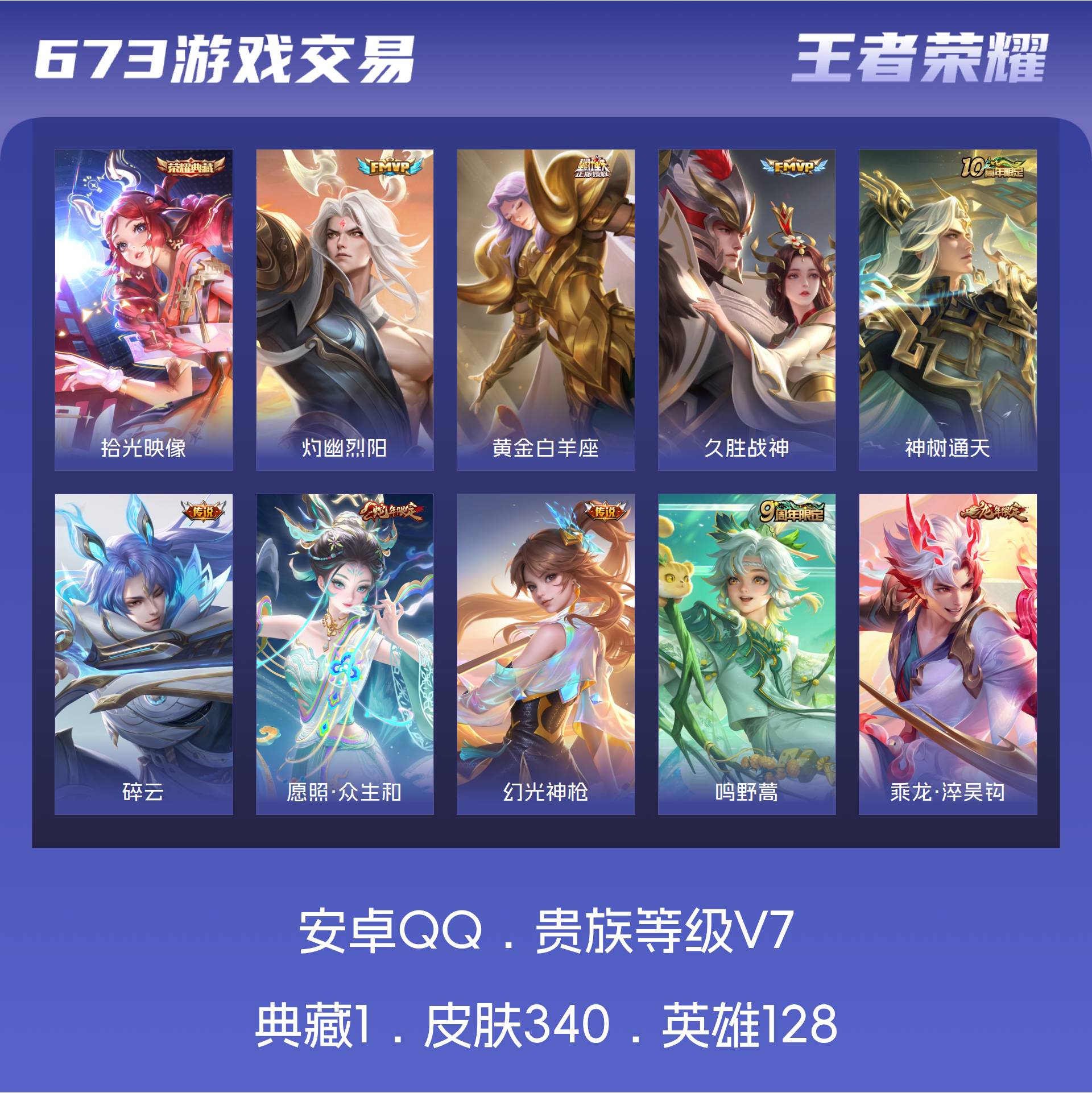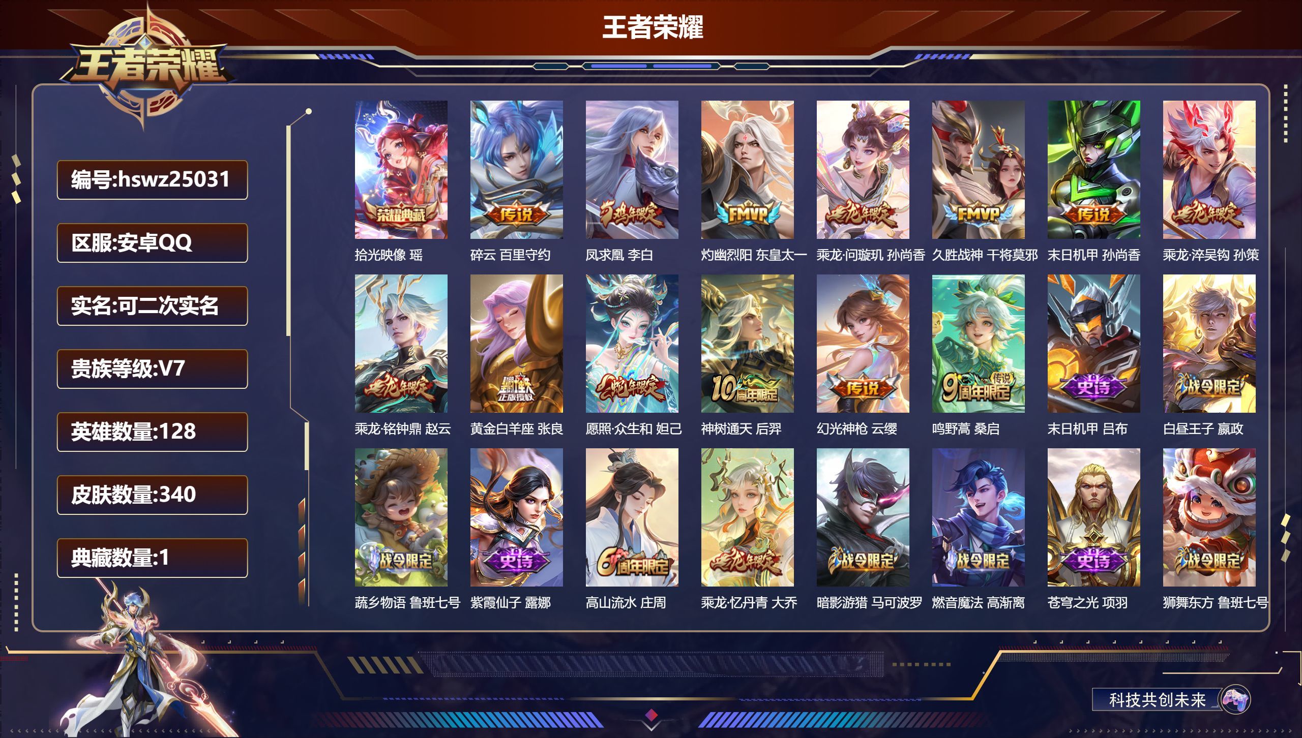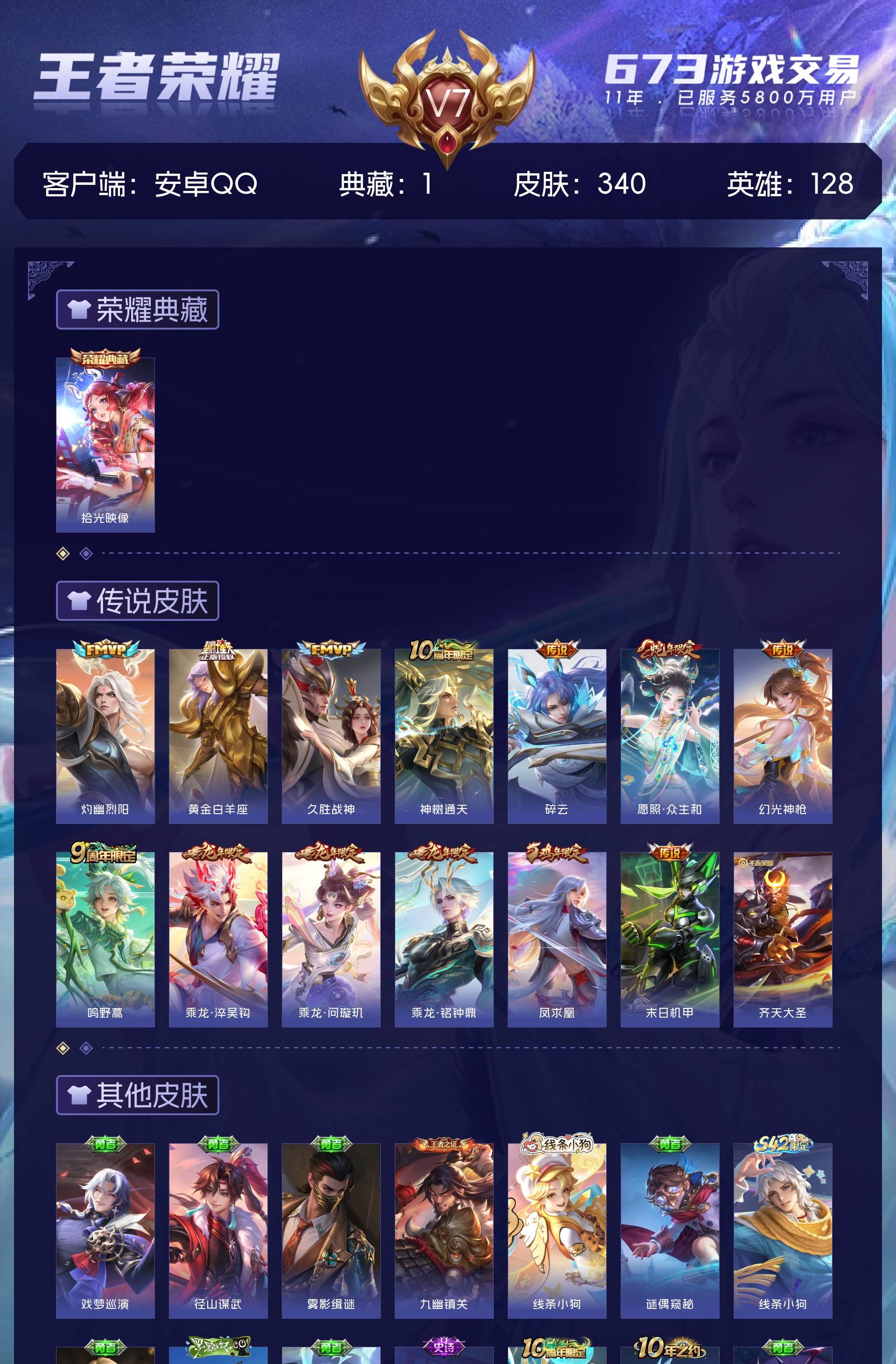 安卓QQ/最强王者/340皮肤/128英雄/1典藏/0珍品无双/0无双/0珍品传说/13传说/93史