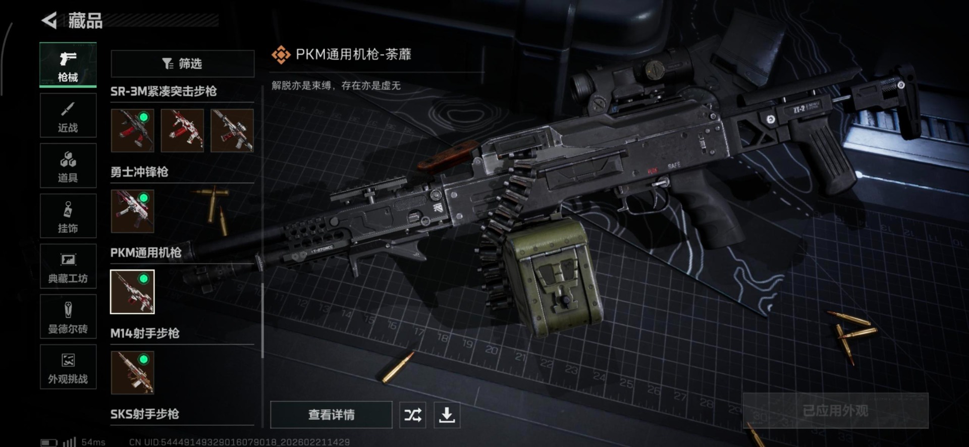 【传说武器皮肤】近战武器-暗星,.357左轮-缄花,SR-25射手步枪-缄花,SCAR-H战斗步枪-启航,M14射手步枪-缄花,SMG-45冲锋枪-锦绣,SR-3M紧凑突击步枪-暗星,K437突击步枪-锦绣,M4A1突击步枪-阿米娅,CAR-15突击步枪-阿米娅,AK-12突击步枪-特斯拉线圈,SR-3M