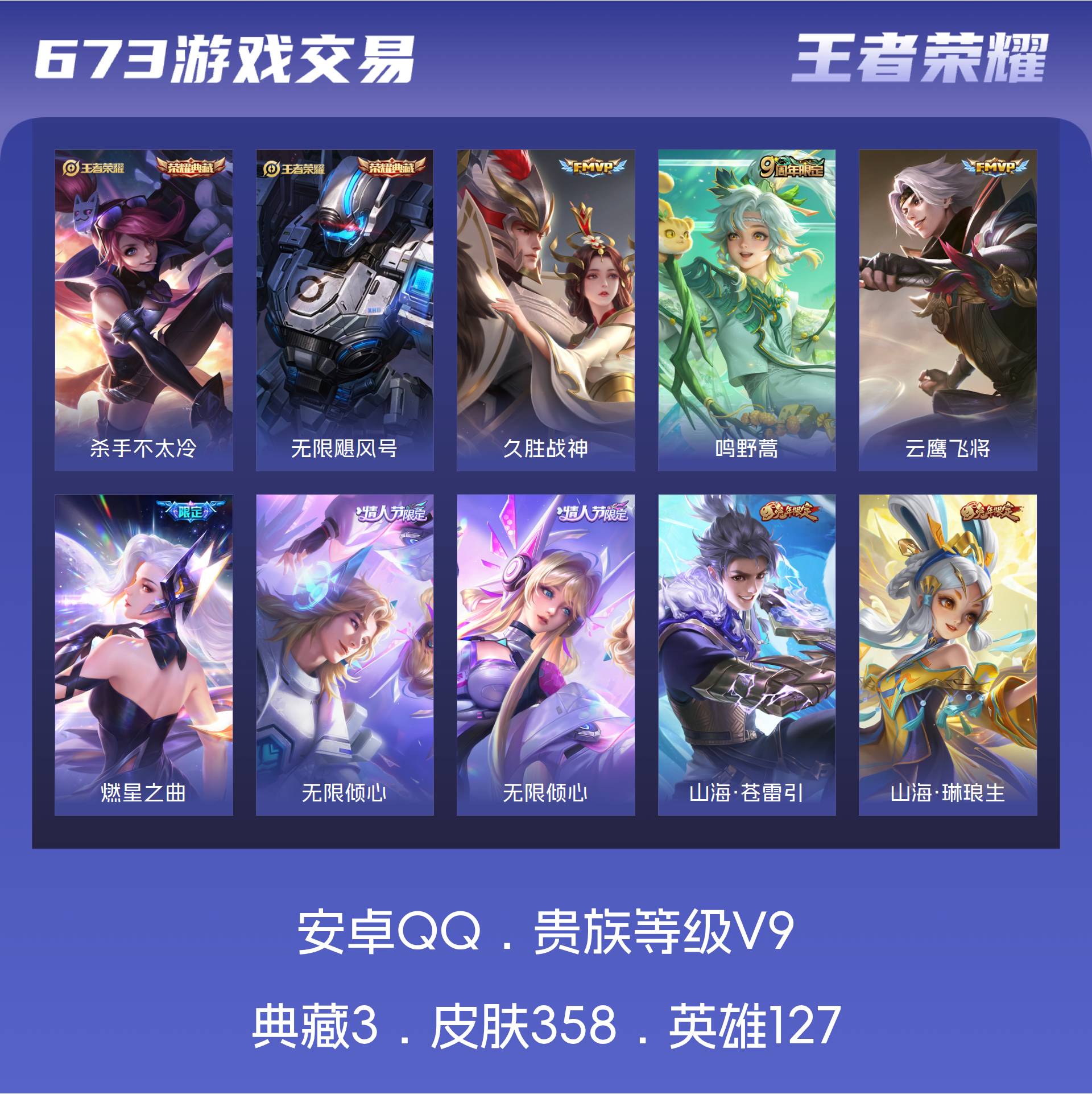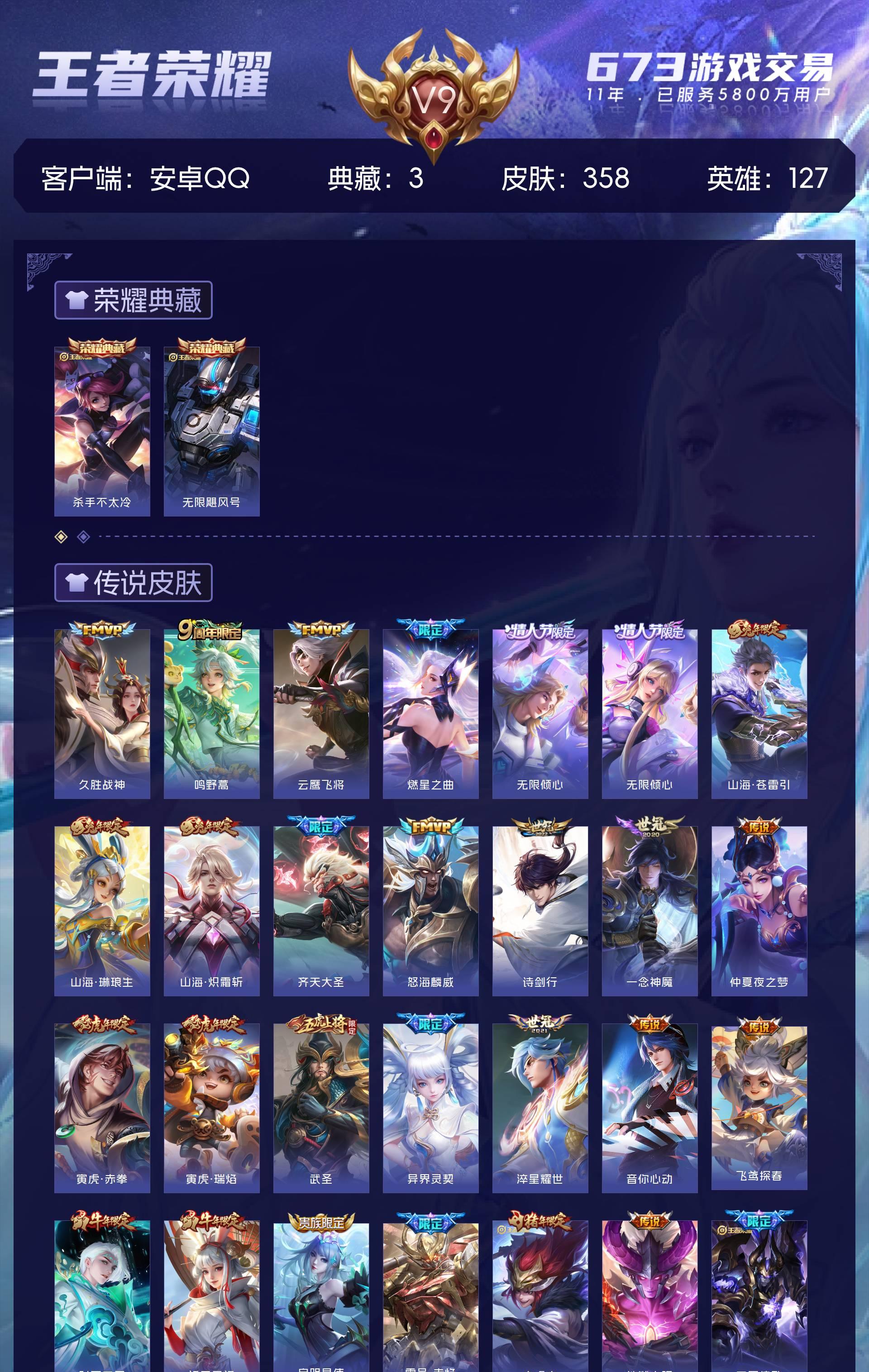 V9 皮肤358 英雄127 至尊星耀 荣耀典藏3 珍品传说1 传说33 其他皮肤327