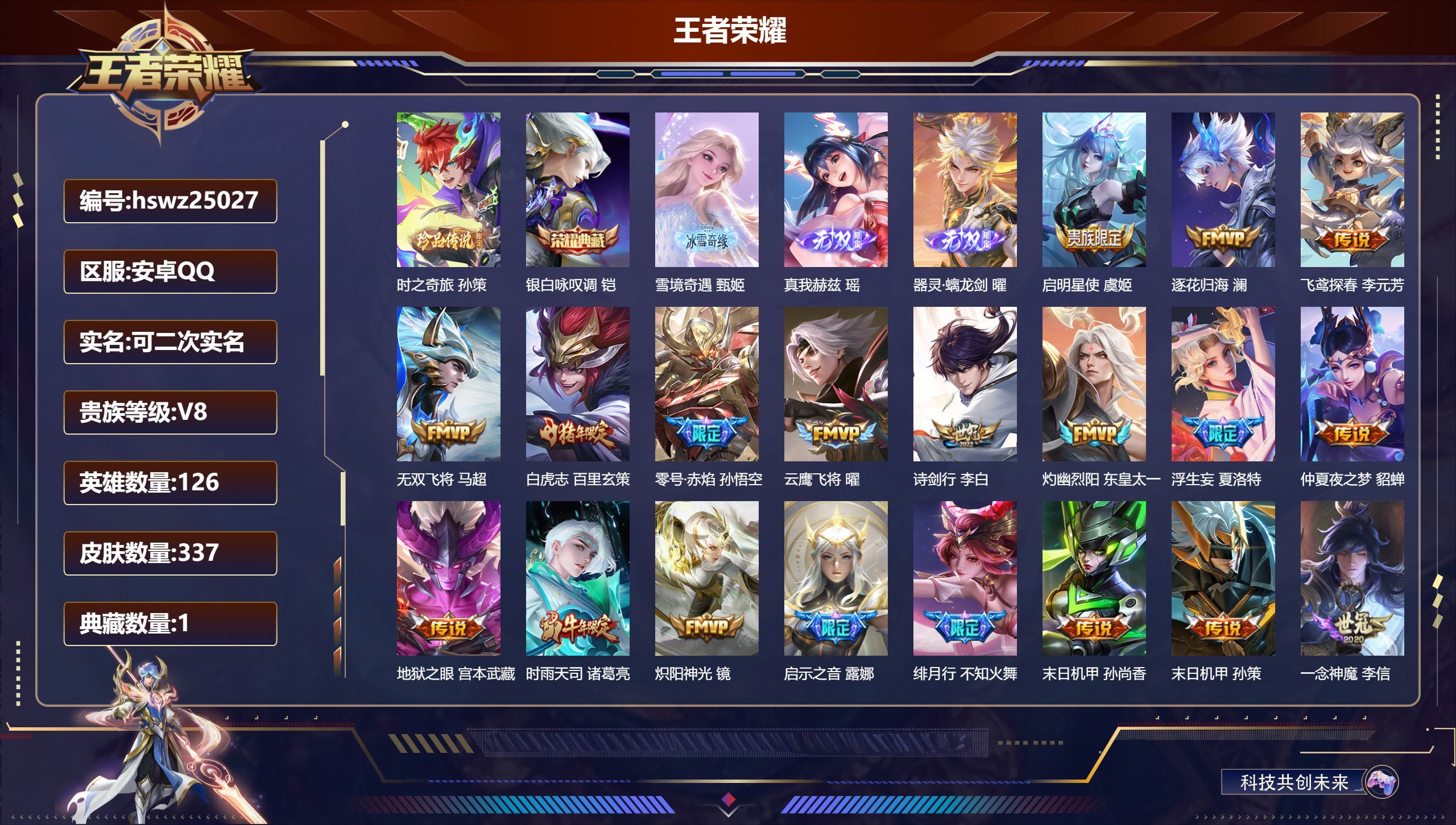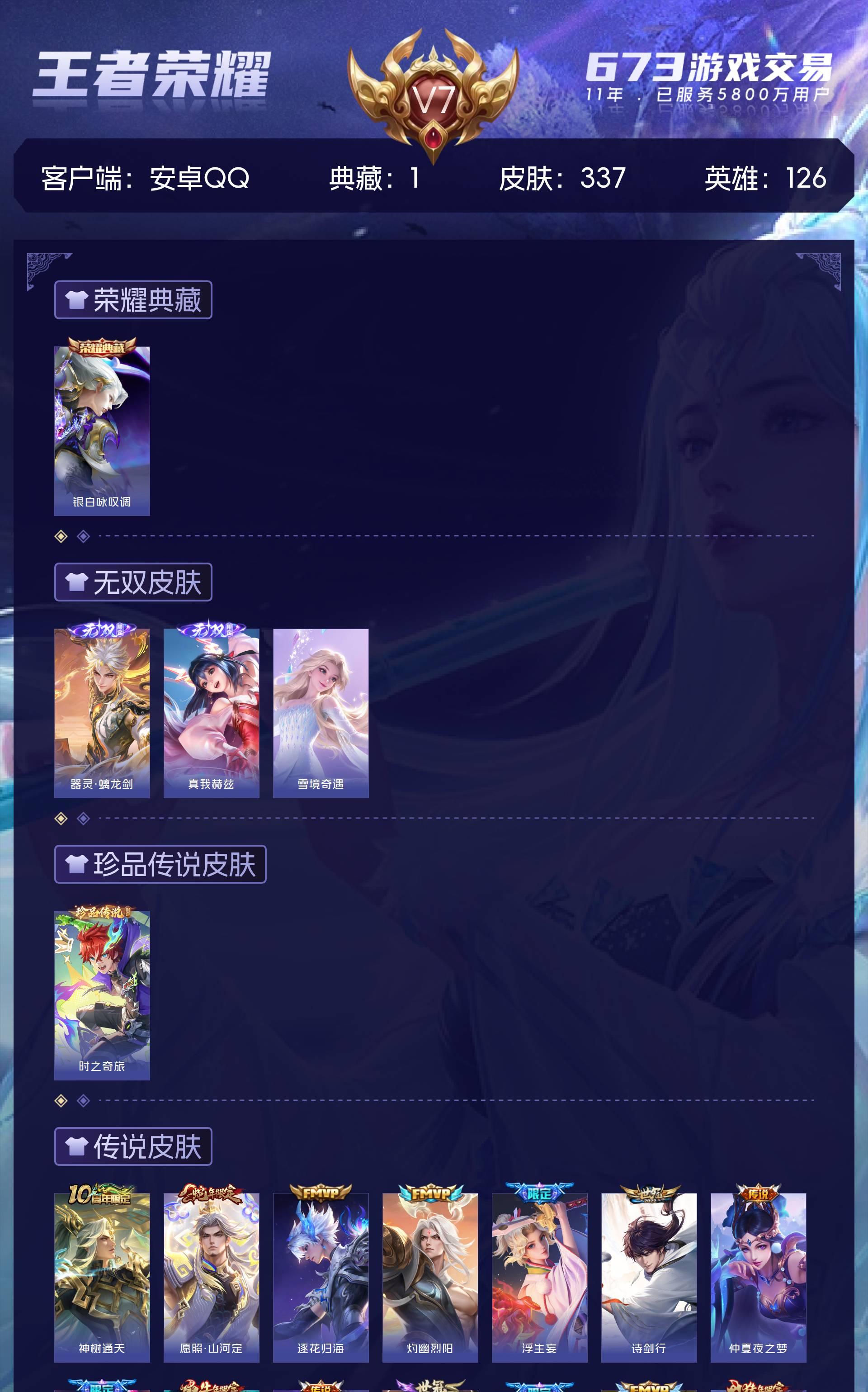 安卓QQ/至尊星耀/337皮肤/126英雄/1典藏/0珍品无双/3无双/1珍品传说/23传说/93史