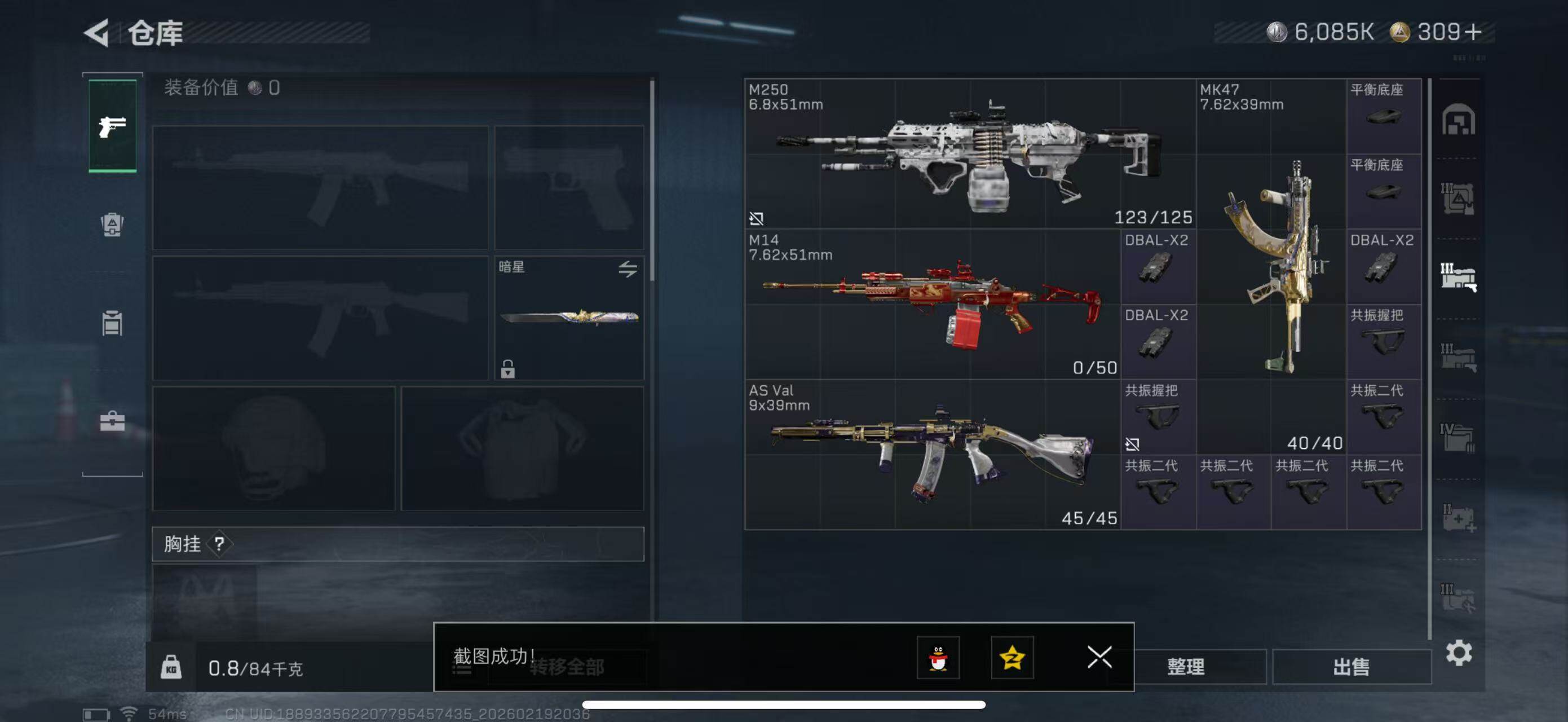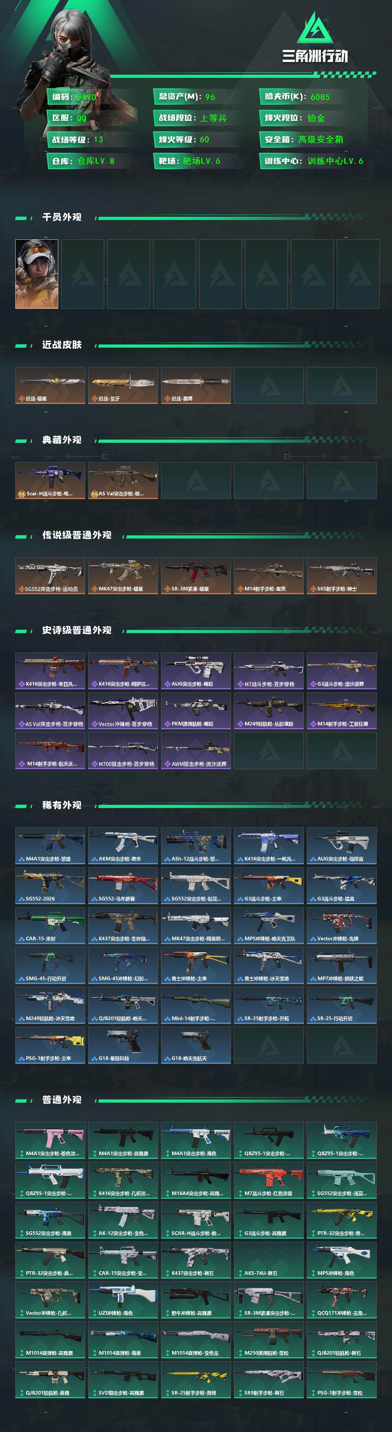 {特价出售}等级:60总资产:93M 纯币6085k 刀皮 暗星 龙牙 砖皮: 优品b电玩scar-H 优品A ASVal 特勤处:仓库8,训练6,靶场6