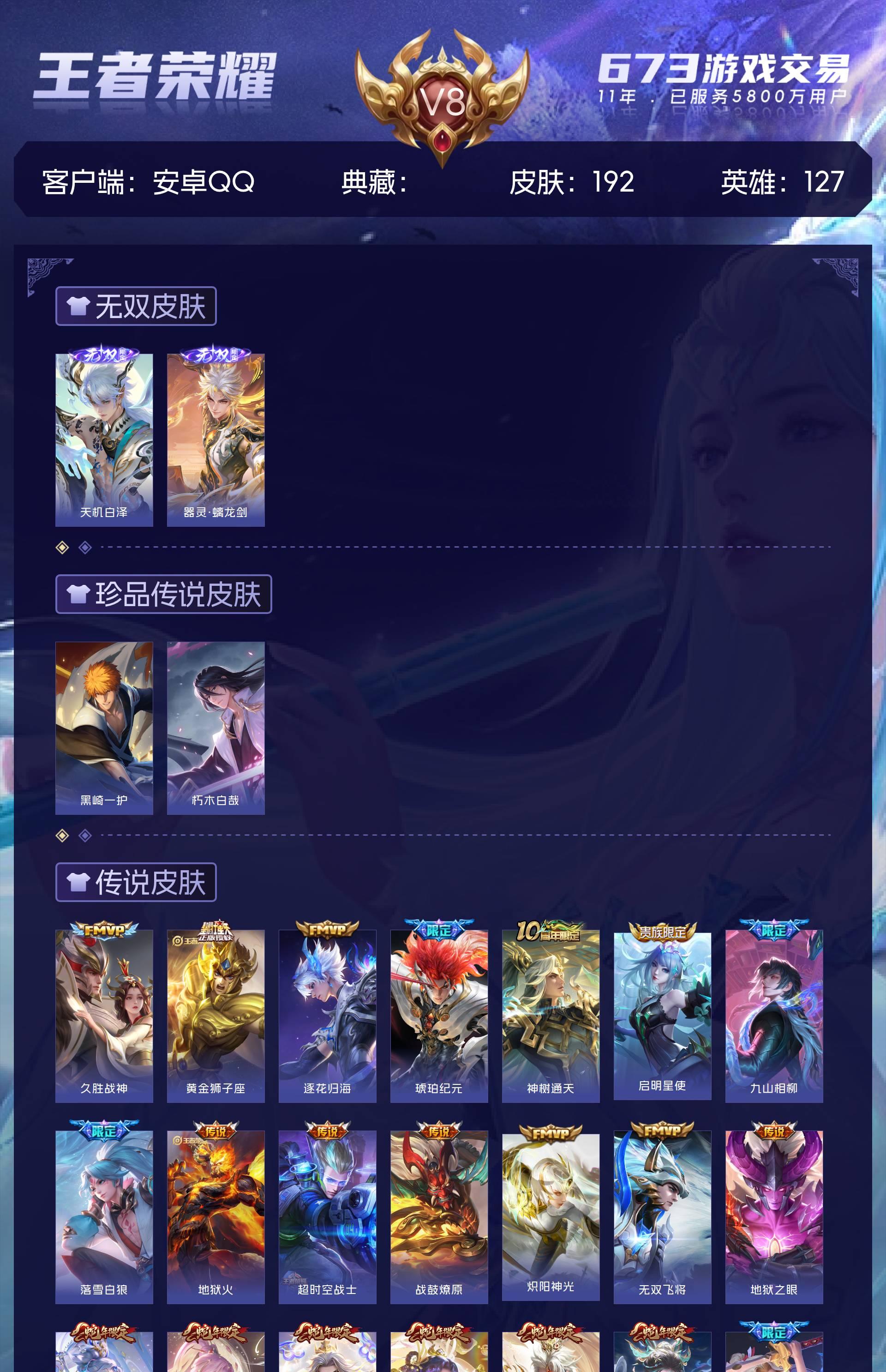 V8 皮肤192 英雄127 无双王者 无双皮肤2 珍品传说2 星传说1 传说28 其他皮肤165