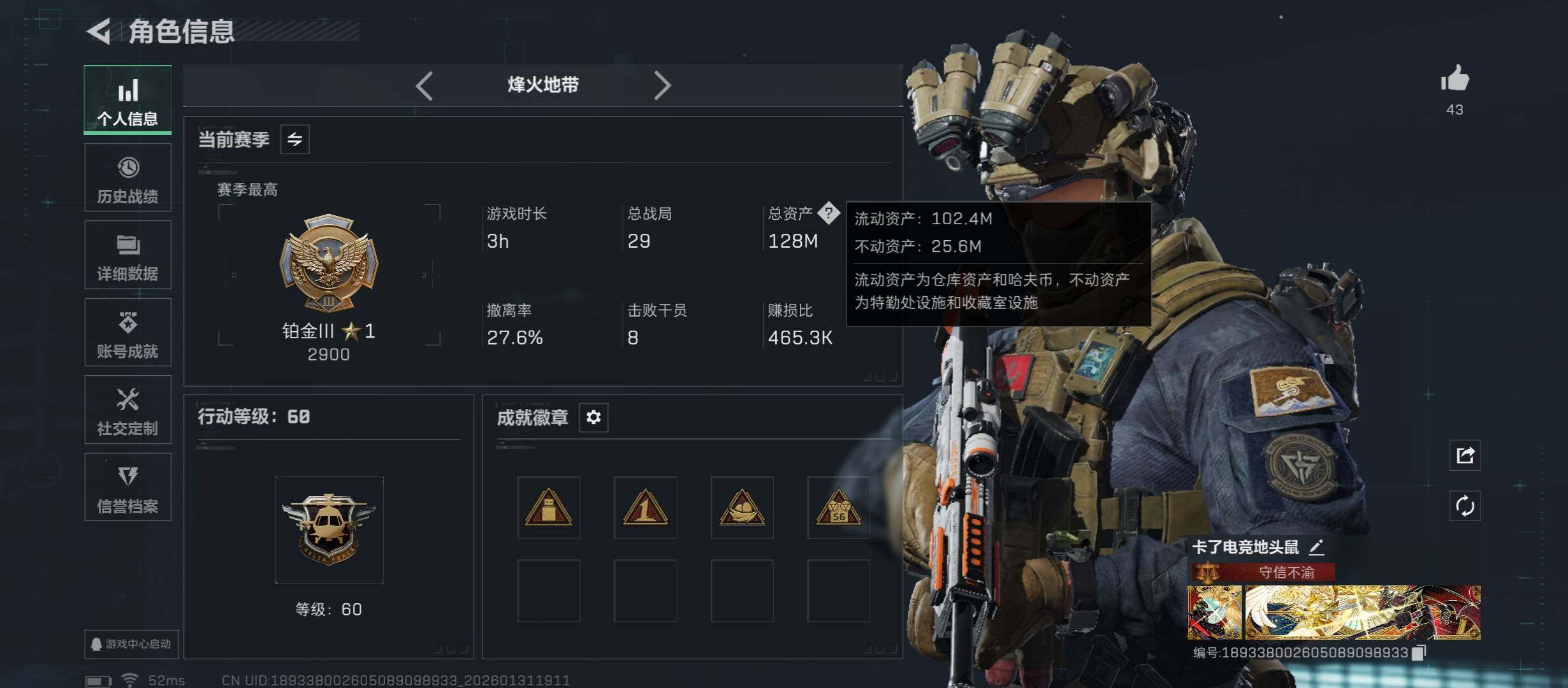 【赛季热门多刀号-暗星+北极星+信条+怜悯】【Q区三端互通】【无二次】YXz7715-特勤处:仓库8级/靶场6级/训练中心7级-总资产127m-哈夫币2539w-烽火等级:60级