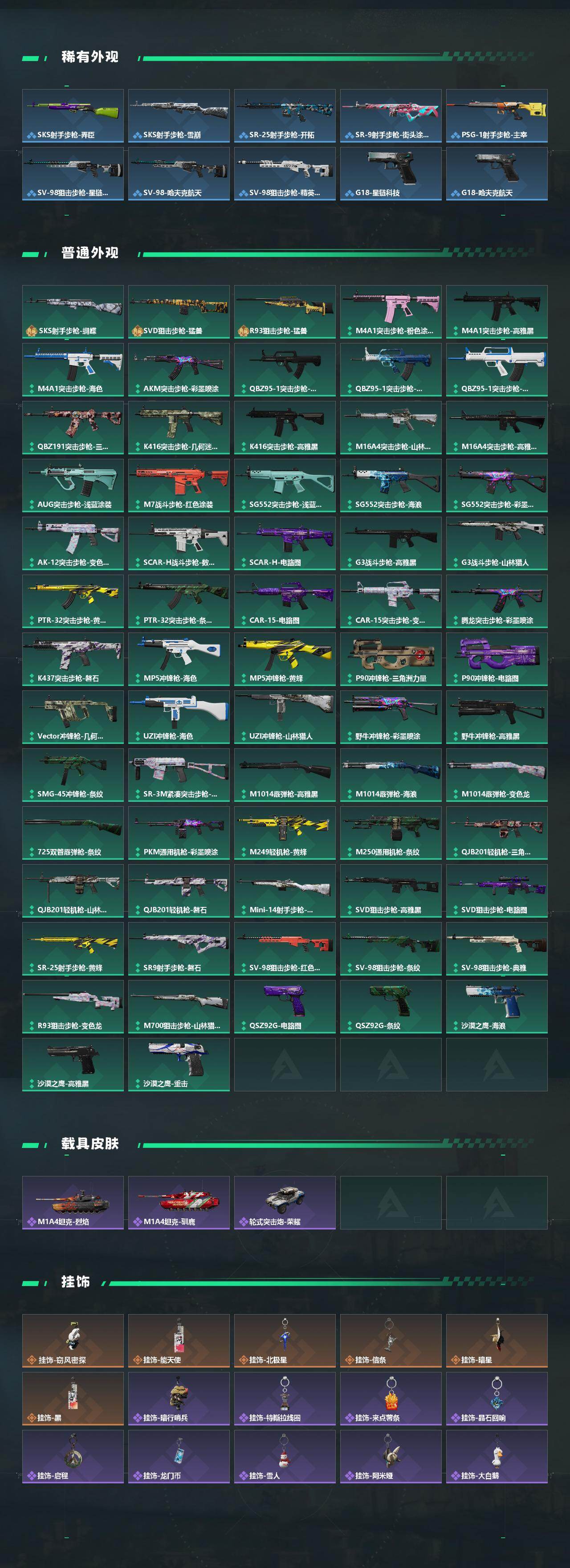 【传说外观】:M4A1突击步枪-阿米娅,ASh-12战斗步枪-鹅鸭杀,SG552突击步枪-运动员,AK-12突击步枪-特斯拉线圈,SCAR-H战斗步枪-启航,G3战斗步枪-骑士,CAR-15