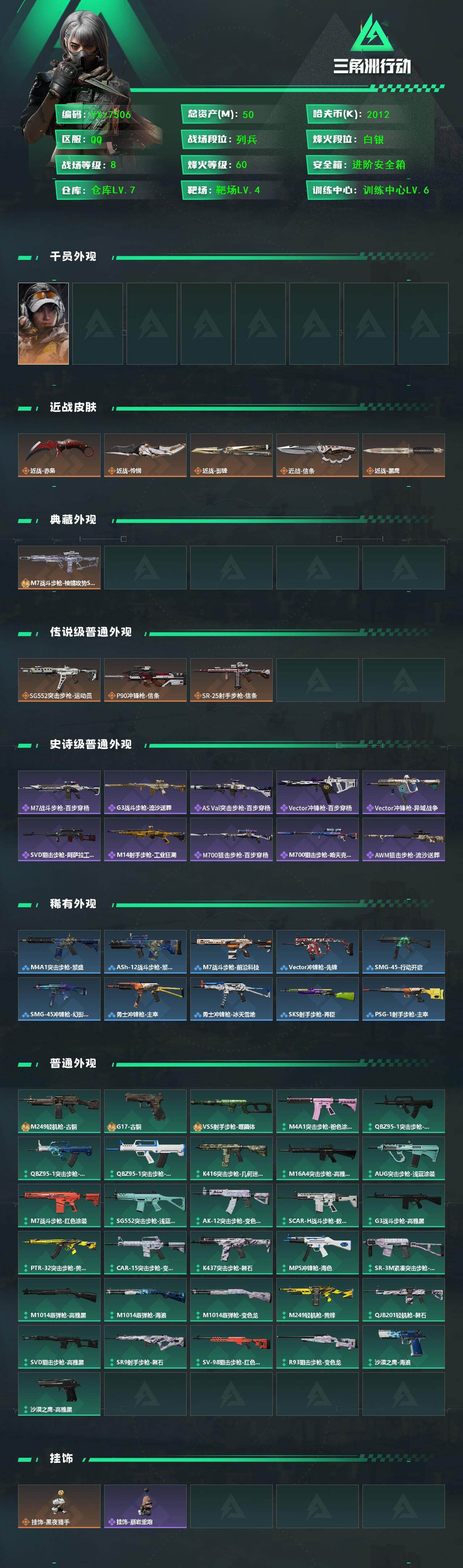 【多热门刀皮-四刀皮+一典藏-赤枭+怜悯+影锋+信条+m7棱镜-优品A】【Q区三端互通】【无二次】YXz7506-特勤处:仓库7级/靶场4级/训练中心6级-总资产50.6m-哈夫币201w-烽火等级:60级