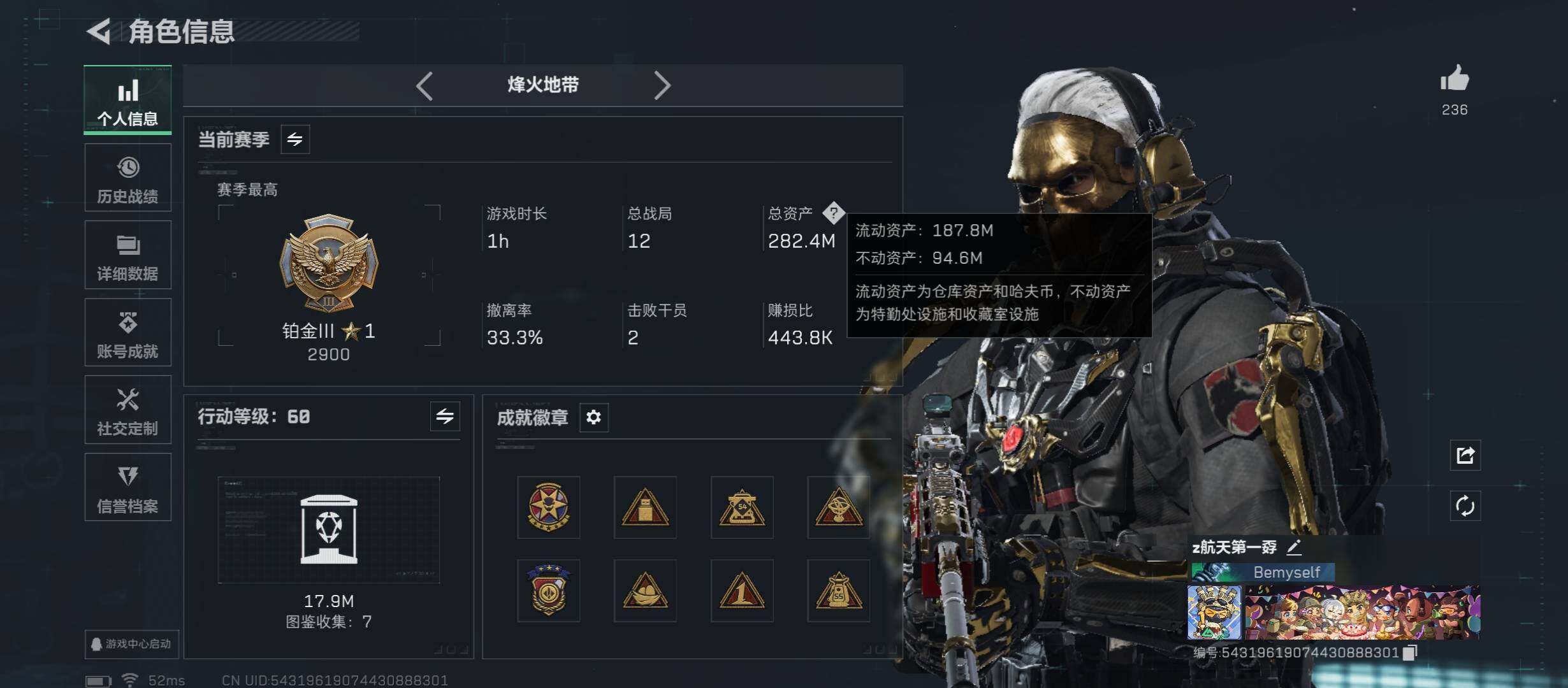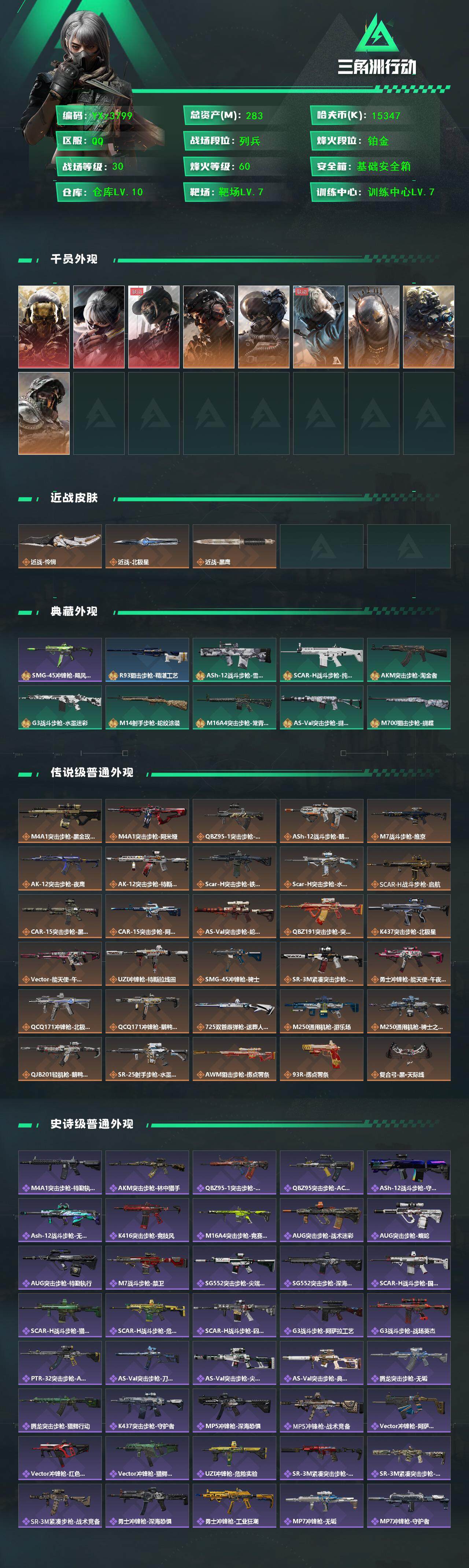 【热门皮肤号:三红+双刀-怜悯+北极星+蚀金玫瑰+水墨云图+黑天际线+铁面】【Q区三端互通】【无二次】YXz3799-特勤处:仓库10级/靶场7级/训练中心7级-总资产283m-哈夫币1534w-烽火等级:60级