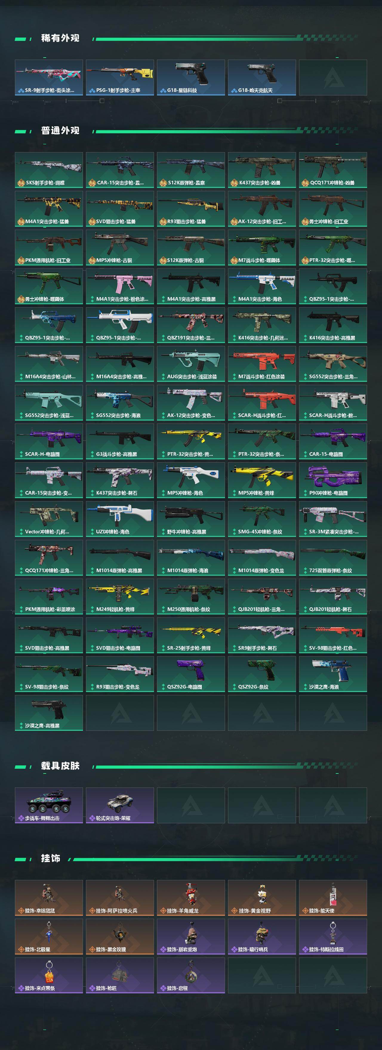 【传说外观】:M4A1突击步枪-蚀金玫瑰,M4A1突击步枪-阿米娅,ASh-12战斗步枪-鹅鸭杀,M7战斗步枪-怜悯,SG552突击步枪-运
