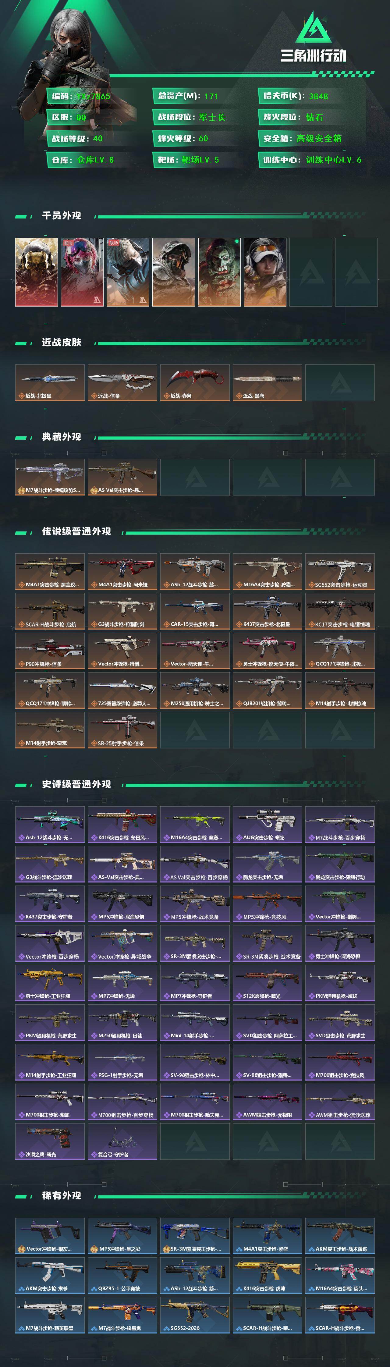 【高氪金土豪号-二红皮+三刀皮+二典藏皮肤】【Q区三端互通】【无二次】YXz7865-特勤处:仓库8级/靶场5级/训练中心6级-总资产171.2m-哈夫币384w-烽火等级:60级