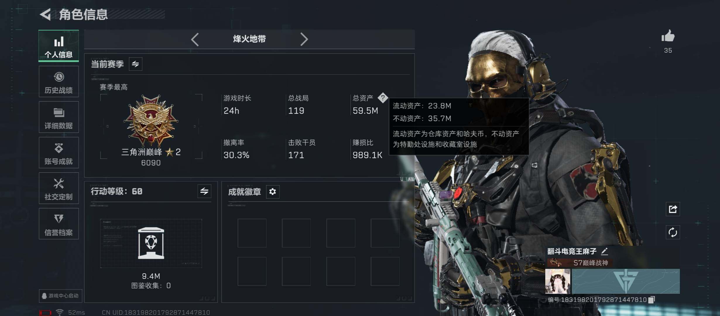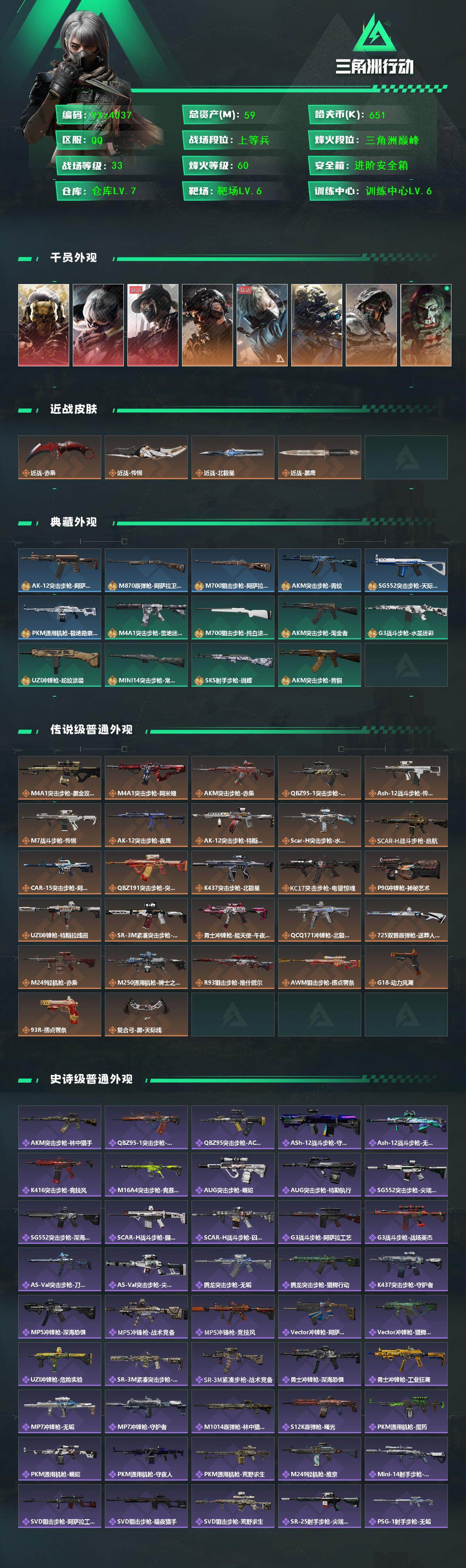 【高氪金土豪号-三红皮+三热门刀皮+铁面判官】【北极星.怜悯.赤枭.蚀金玫瑰.水墨云图.黑天际线】【Q区三端互通】【无二次】YXz4037-特勤处:仓库7级/靶场6级/训练中心6级-总资产59.5m-哈夫币65w-烽火等级:60级