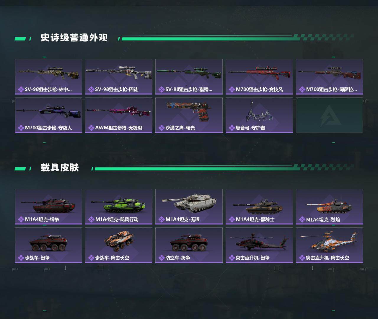 【近战皮肤】:近战-赤枭,近战-怜悯,近战-北极星,近战-黑鹰