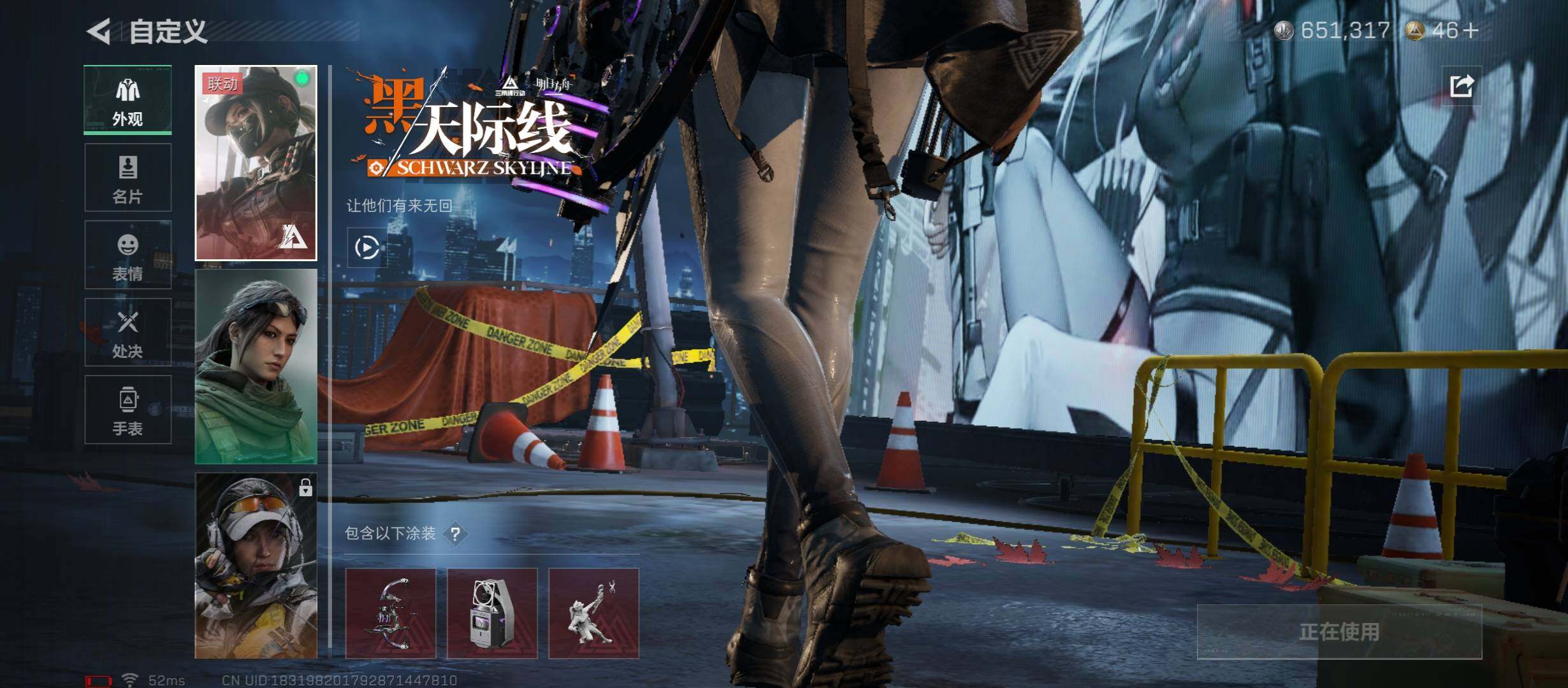 【干员外观】:红狼-蚀金玫瑰,骇爪-水墨云图,露娜-黑·天际线,威龙-铁面判官,蜂医-送葬人·无题密令,无名-夜鹰,深蓝-不破誓约,红狼-电锯惊魂