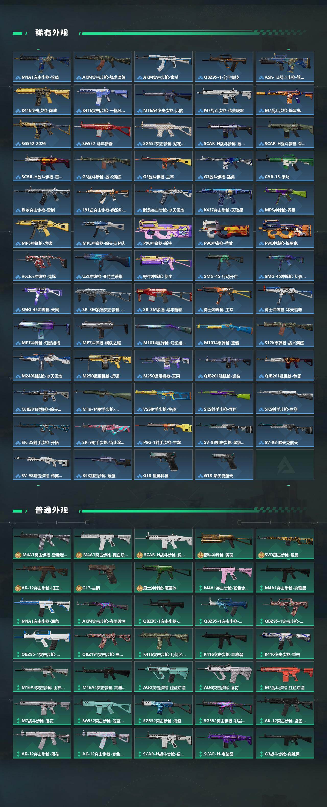 【传说外观】:M4A1突击步枪-蚀金玫瑰,M4A1突击步枪-阿米娅,ASh-12战斗步枪-鹅鸭杀,SG552突击步枪-