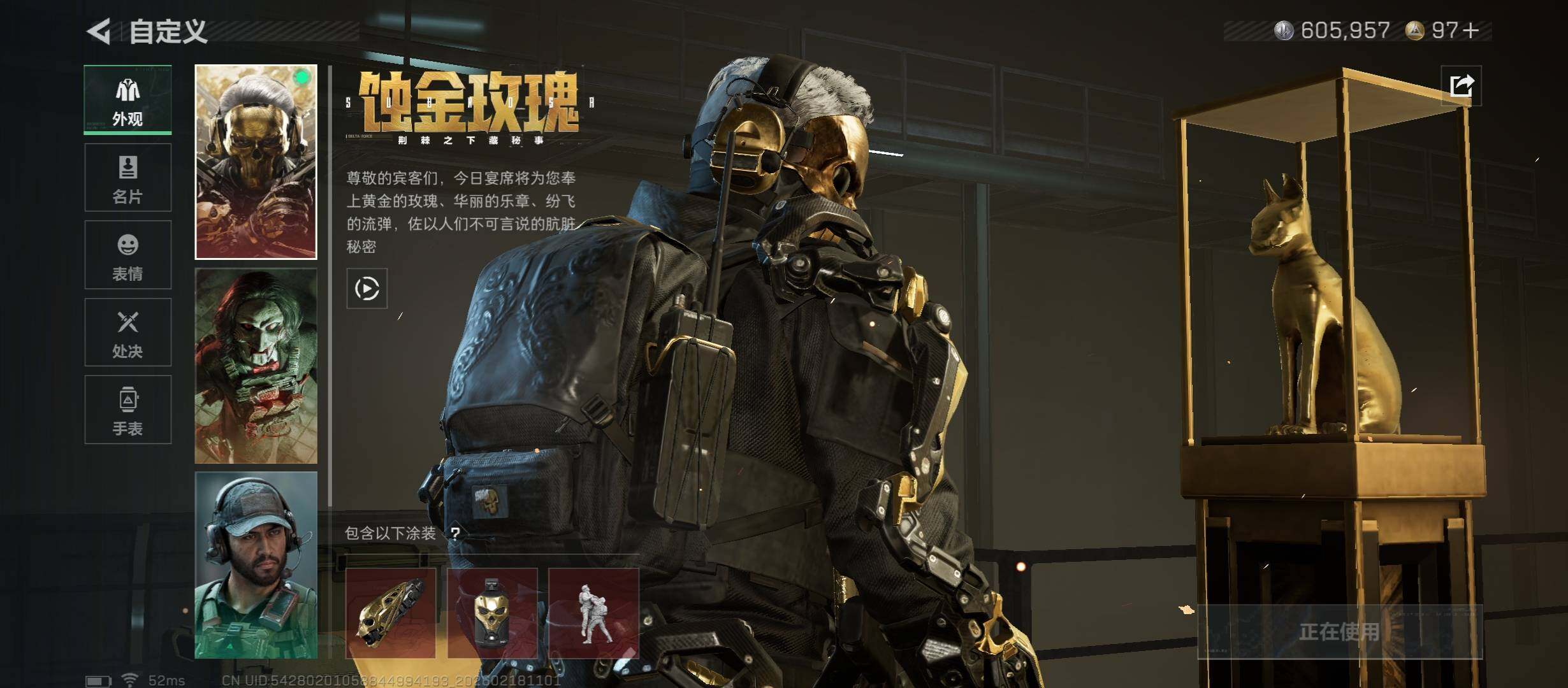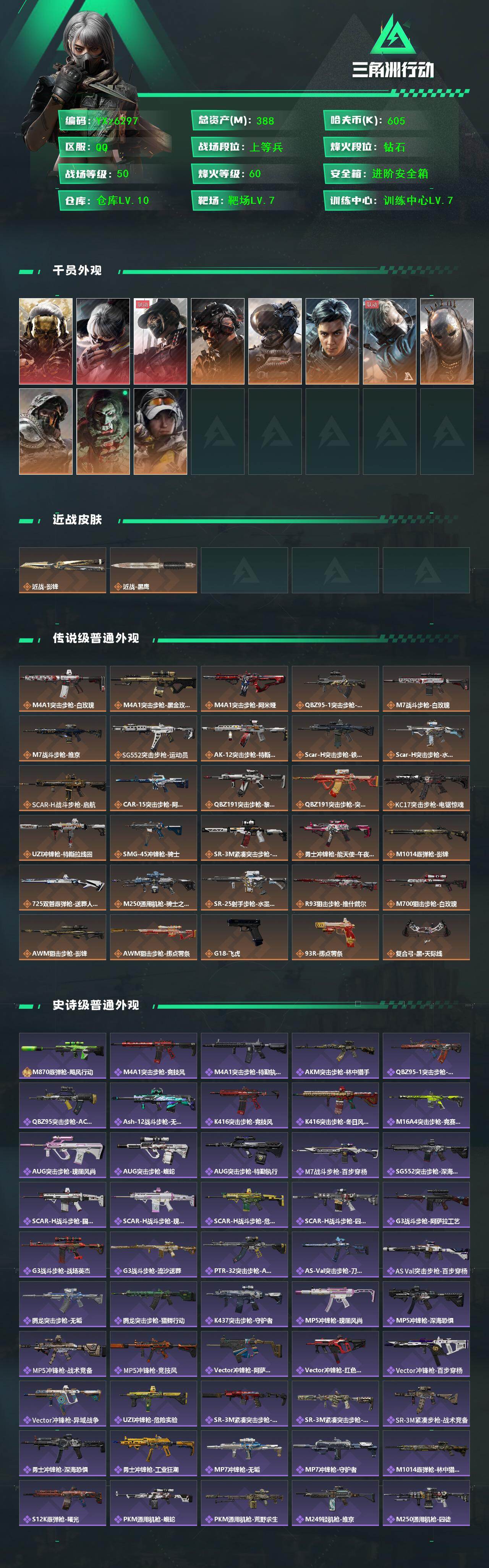 【热门干皮皮肤号-三红皮+单刀-铁面判官+飞虎,蚀金玫瑰+水墨云图+黑天际线+影锋,高额资产388M,满特勤】【Q区三端互通】【无二次】YXz6297-特勤处:仓库10级/靶场7级/训练中心7级-总资产388m-哈夫币60w-烽火等级:60级