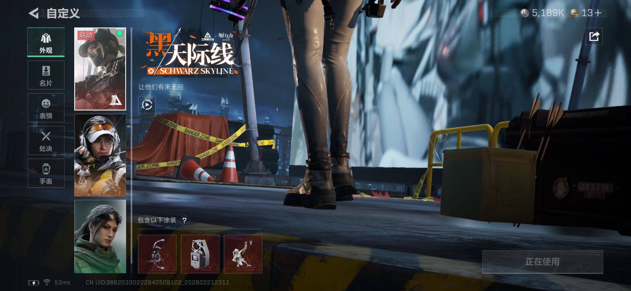 【干员外观】:红狼-蚀金玫瑰,骇爪-水墨云图,露娜-黑·天际线,威龙-壮志凌云,蜂医-送葬人·无题密令,无名-夜鹰,深蓝-不破誓约,露娜-金牌射手