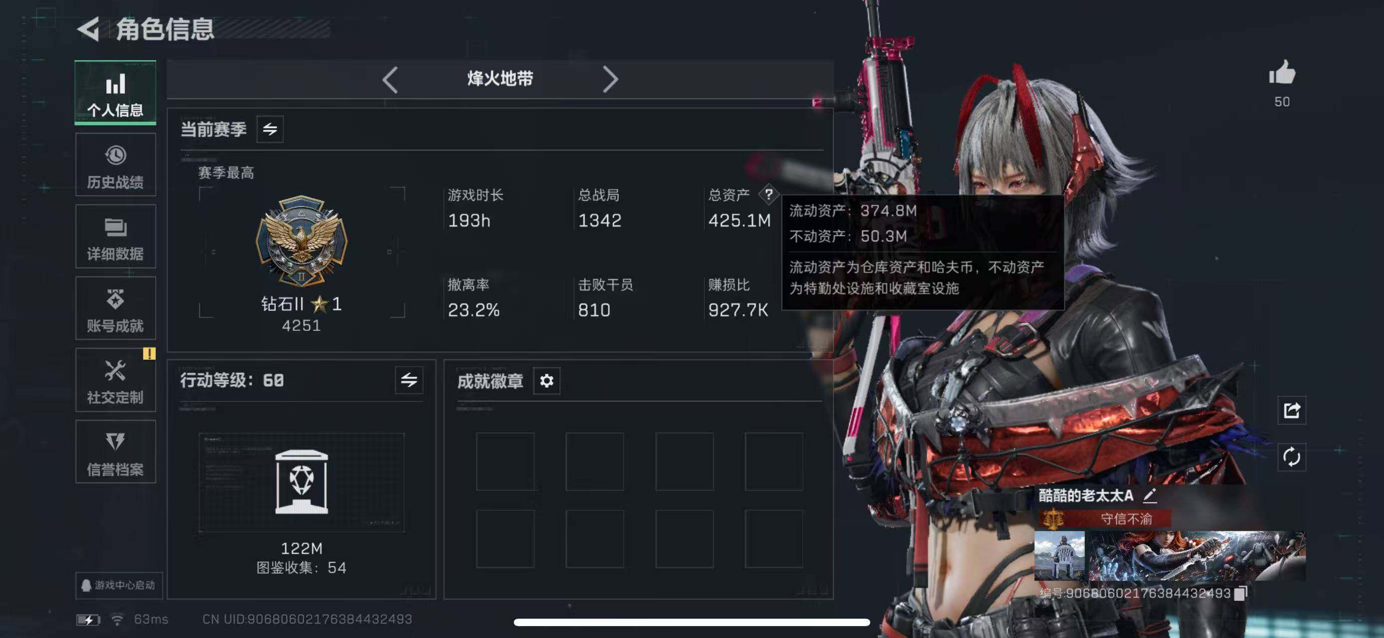 425m总资产-45751k哈伏币-60烽火等级-钻石-26战场等级-列兵