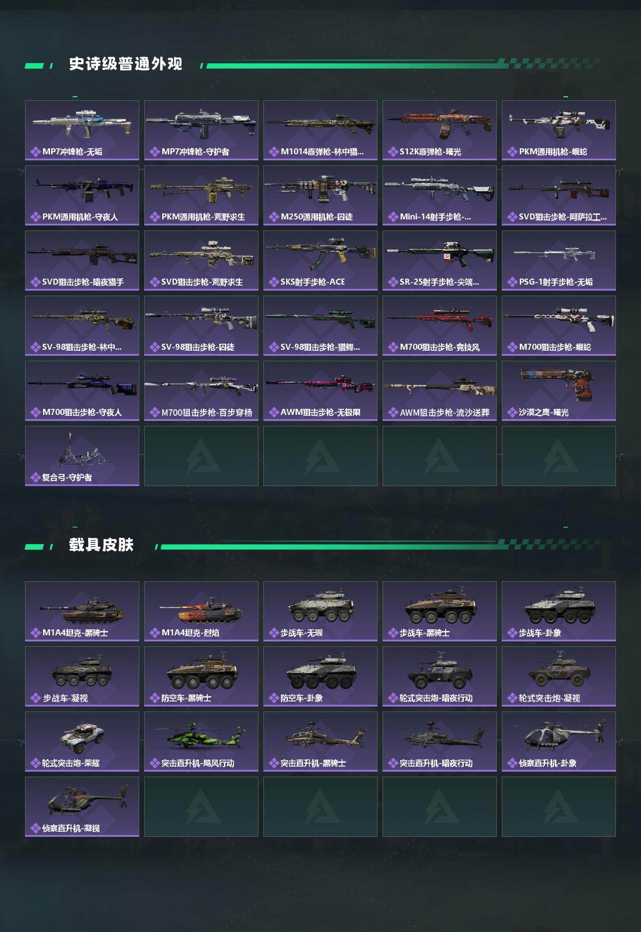 【传说外观】:M4A1突击步枪-蚀金玫瑰,M4A1突击步枪-阿米娅,ASh-12战斗步枪-鹅鸭杀,SG552突击步
