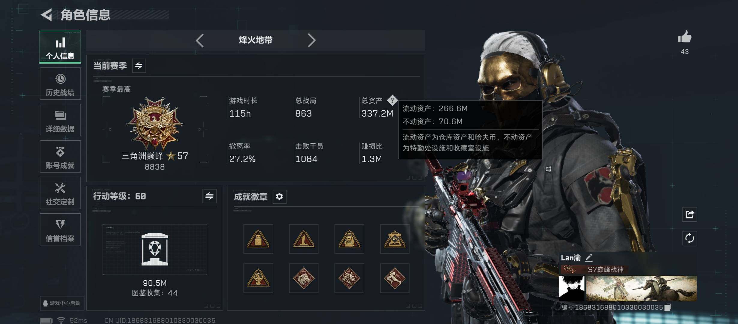 【Q区三端互通】【无二次】YXz7236-特勤处:仓库10级/靶场7级/训练中心7级-总资产337.2m-哈夫币1662w-烽火等级:60级