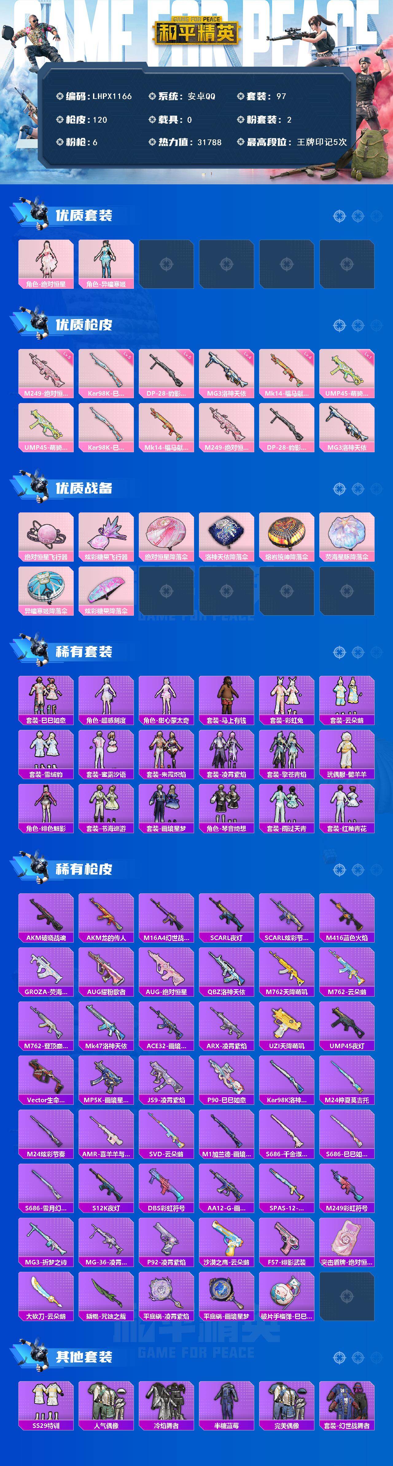 可二次【特价出售/店主推荐】安卓 手Q-2粉装-6特效枪-0载具-2粉色飞行器-31788热力值-5王牌印记-97套装-120枪皮