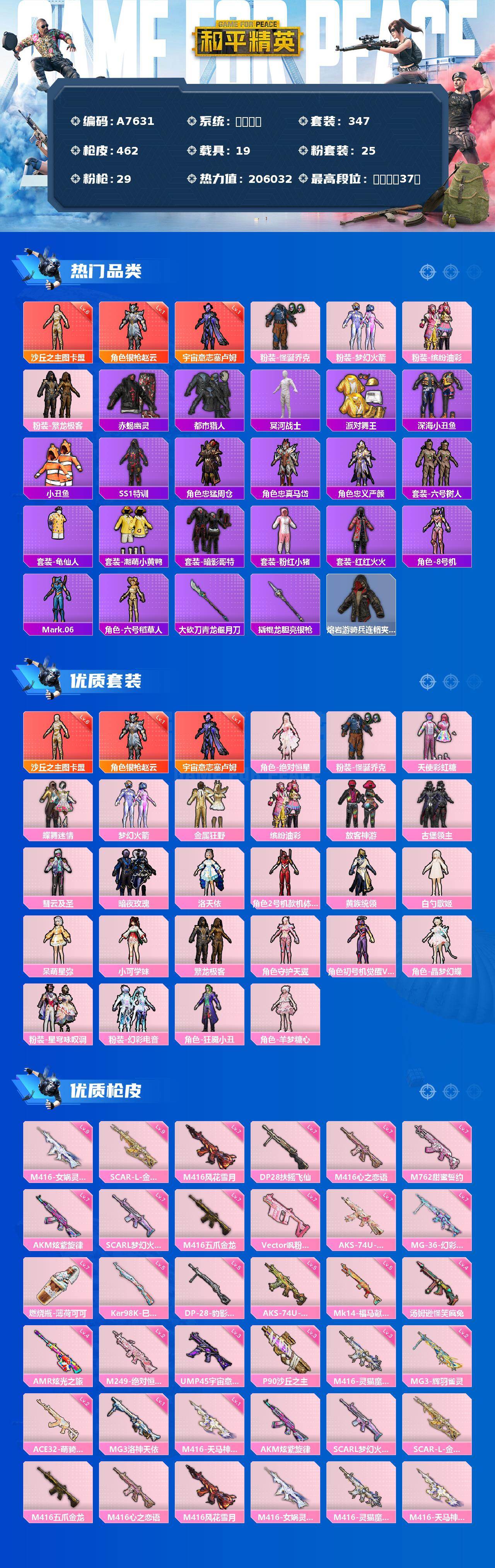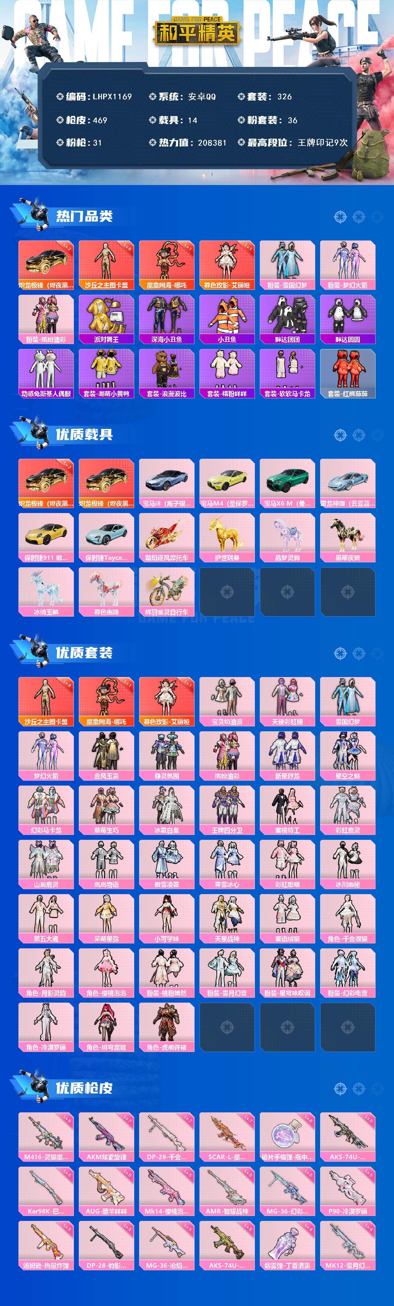 可二次【特价出售/店主推荐】安卓 手Q-3神装-36粉装-31特效枪-14载具-23粉色飞行器-208381热力值-9王牌印记-326套装-469枪皮