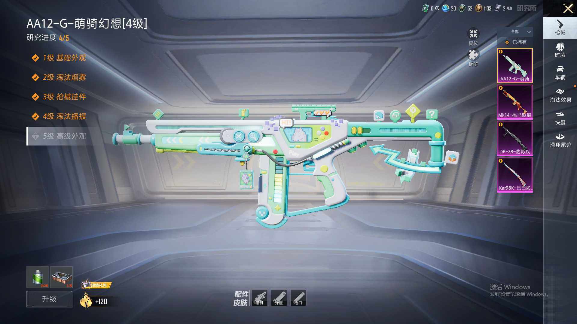 【粉色枪皮等级】:Kar98K-巳巳如意(五级),Mk14-福马献瑞(五级),AA12-G-萌骑幻想(四级),DP-28-豹影疾电(五级)