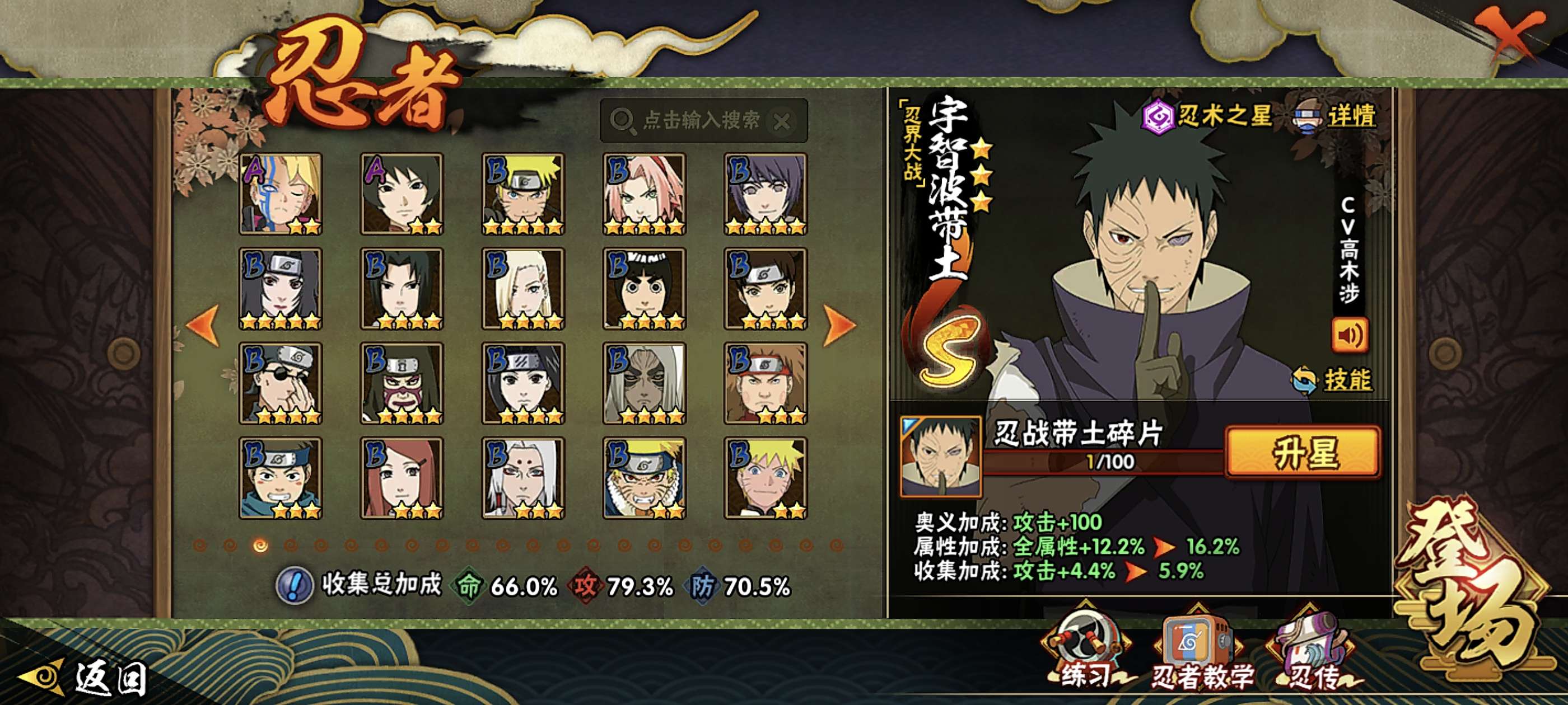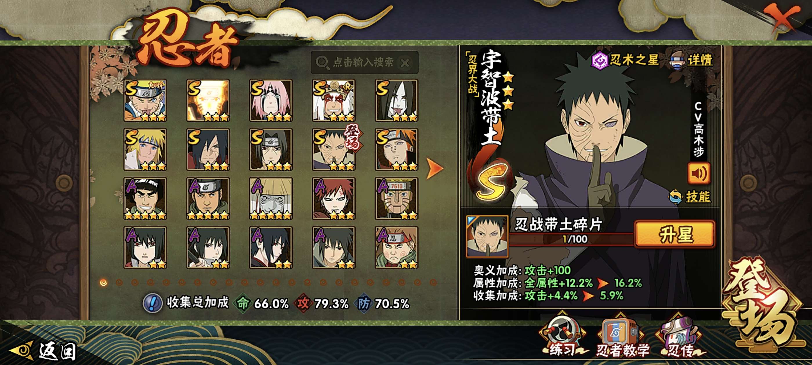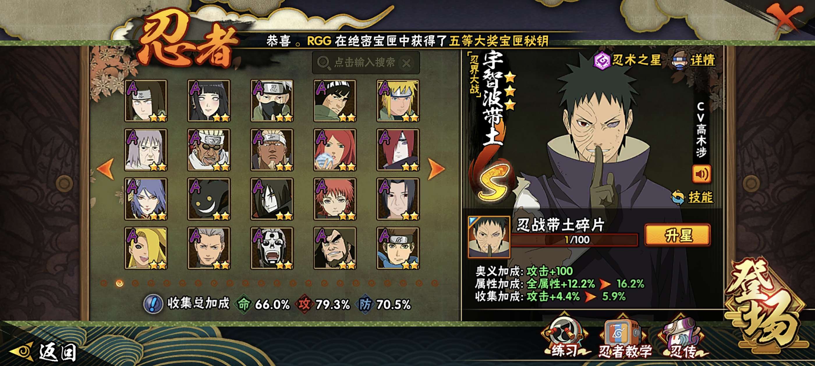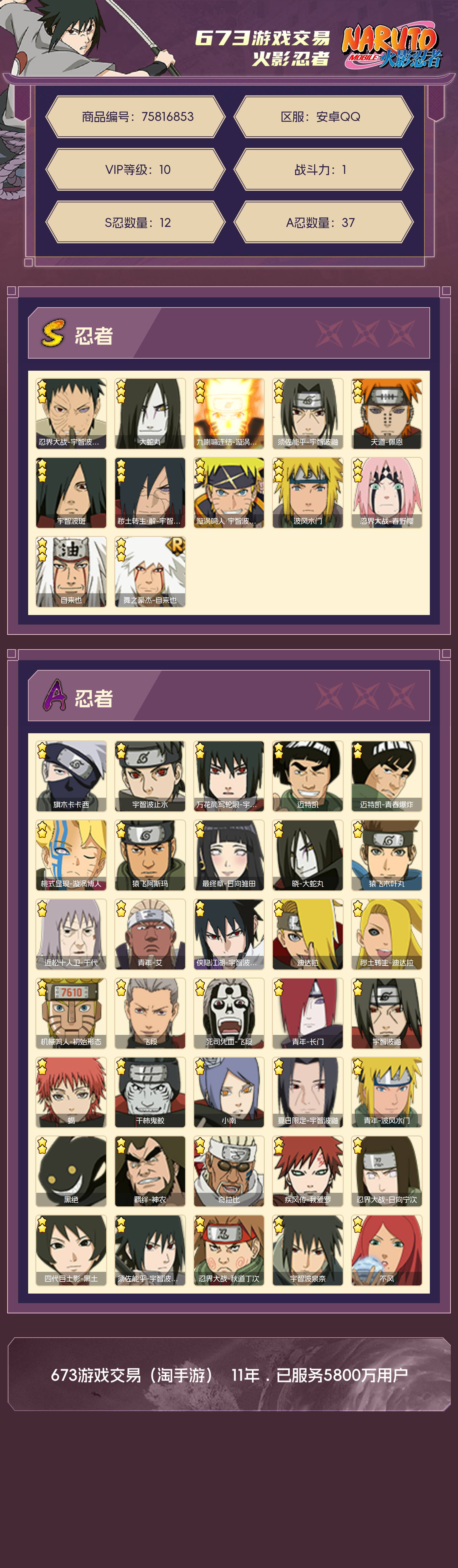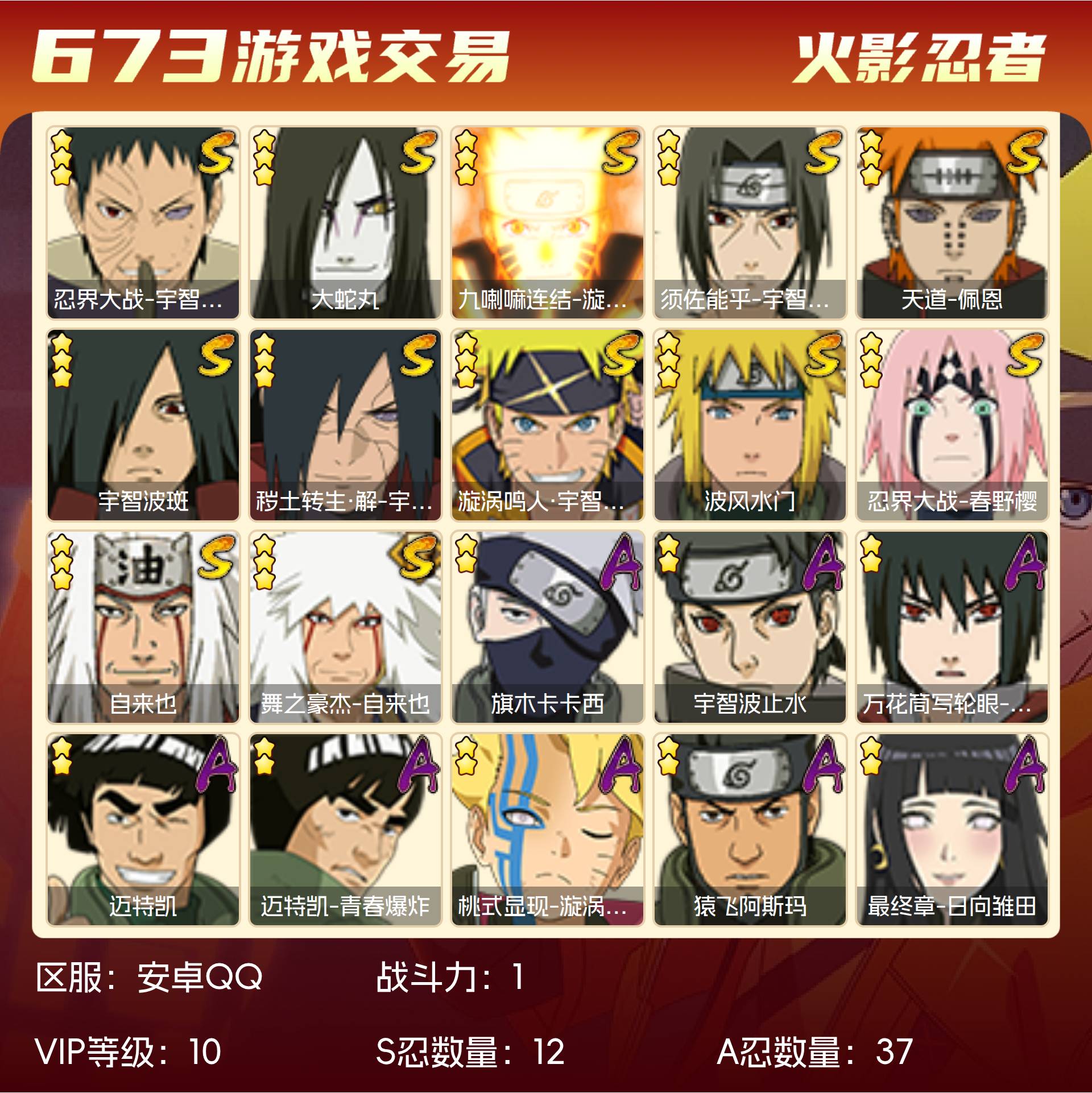 角色等级142 金币1 战斗力1 S忍12 A忍37 5星S忍者1 10 段位上忍