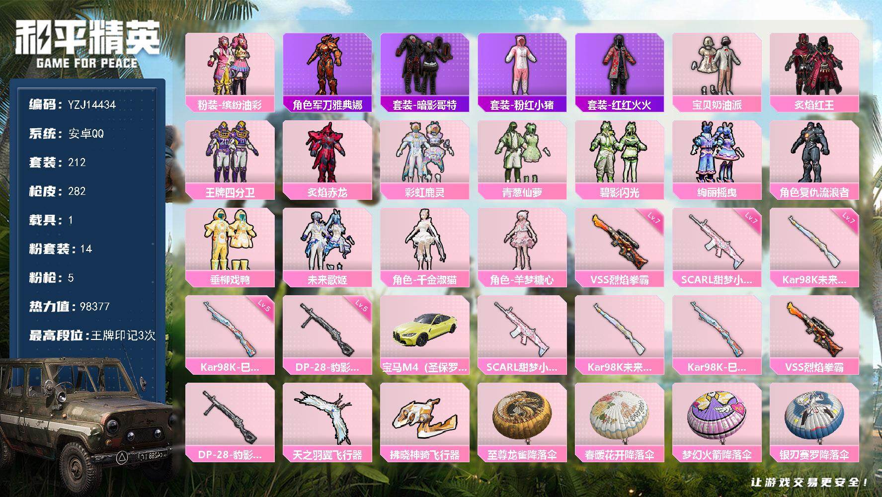 2424283_实名可改安卓Q奶油派千金淑猫羊梦糖心猪妹SCAR-L-甜梦小狐满级-1载具14粉装5特效枪25热门212套装282枪皮98377热力值3印记历史超级王牌4星【1载具】宝马M4(圣保罗黄)【14粉装】宝贝奶油派千金淑猫未来歌姬羊梦糖心垂柳戏鸭缤纷油彩绚丽摇曳炙焰红王王牌四分卫炙焰赤龙青葱仙萝彩虹鹿灵复仇流浪者碧影闪光【5特效枪】Kar98K-巳巳如意(5级)DP-28-豹影疾电(5级