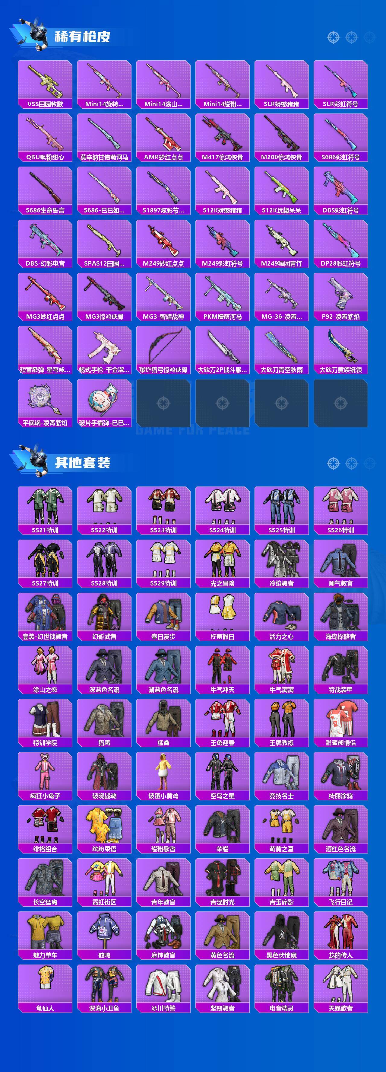 【粉色枪皮等级】:M416-心之恋语(七级),Kar98K-巳巳如意(五级),MK12-雪月幻音(七级),DP-28-豹影疾电(五级),MG3-洛神天依(七级)