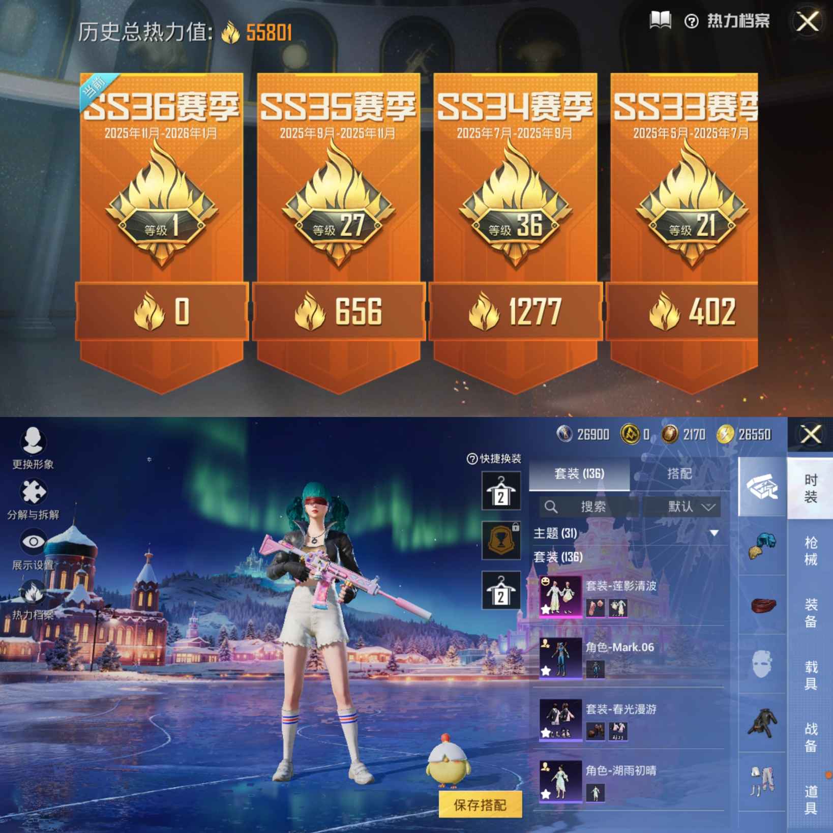 1稀有6粉装10特效枪10热门136套装200枪皮 55801热力值 9印记 历史卓越王牌13星