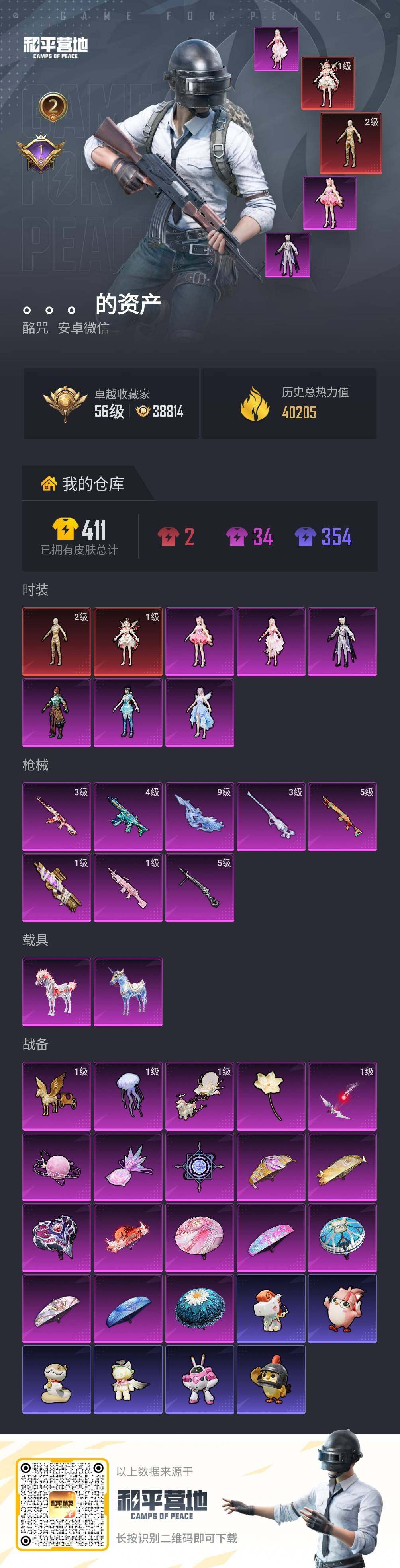 《极品带妹号》《2级图卡盟!满级AUG-星梦奇缘》《精品双字id》安卓 微信-2神装-6粉装-8特效枪-2载具-8粉色飞行器-40205热力值-2王牌印记-58套装-106枪皮
