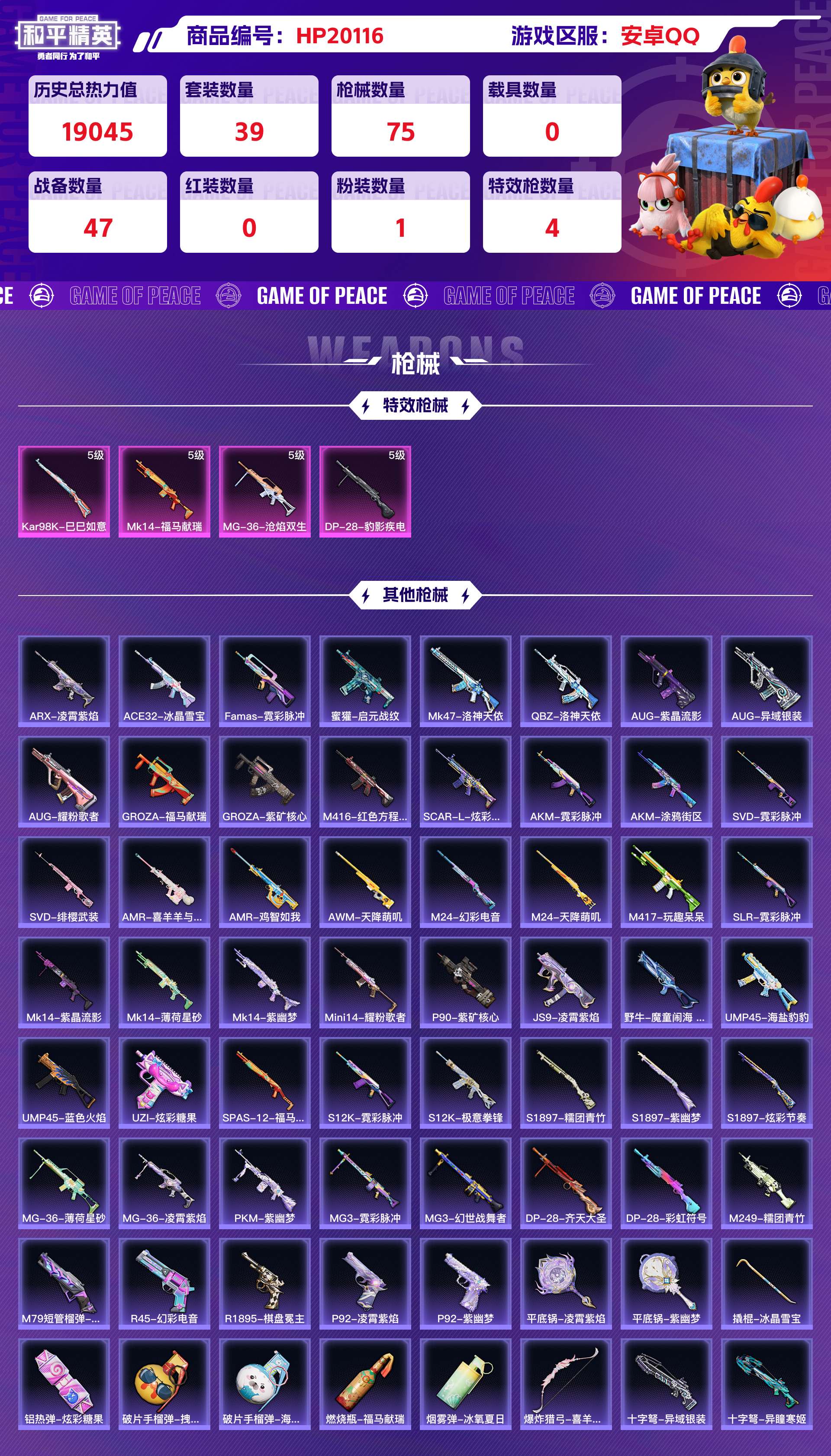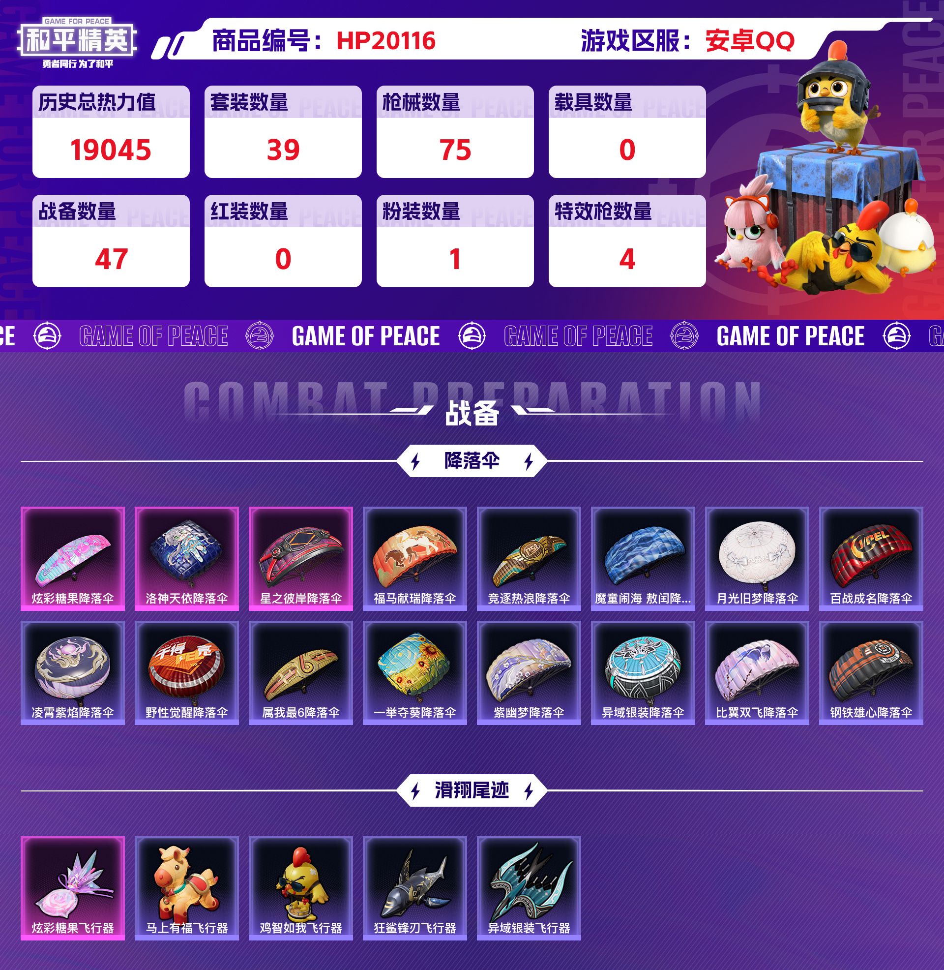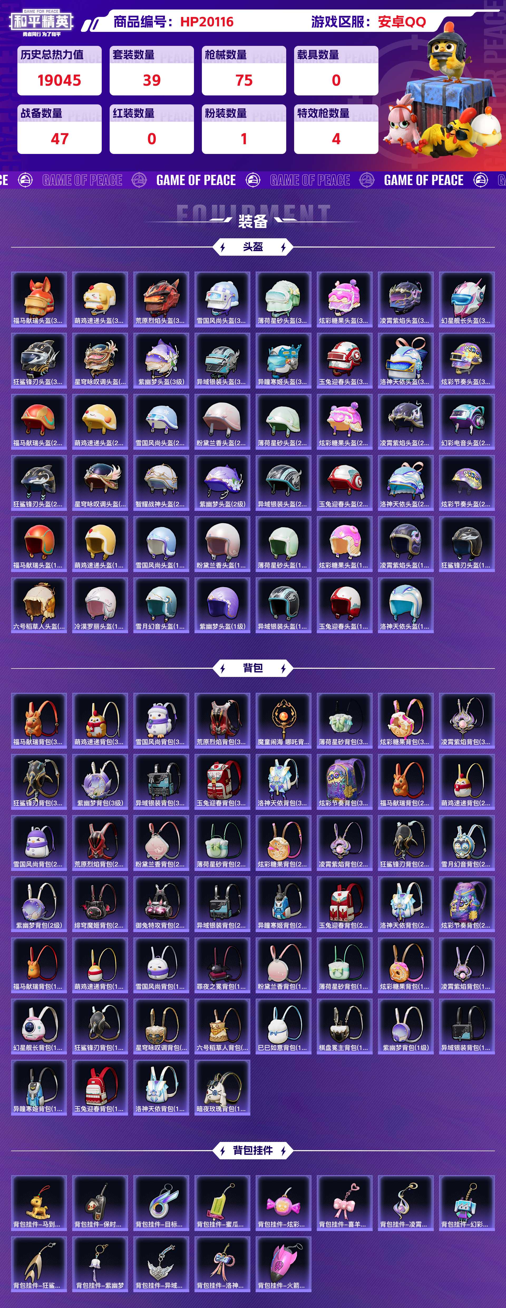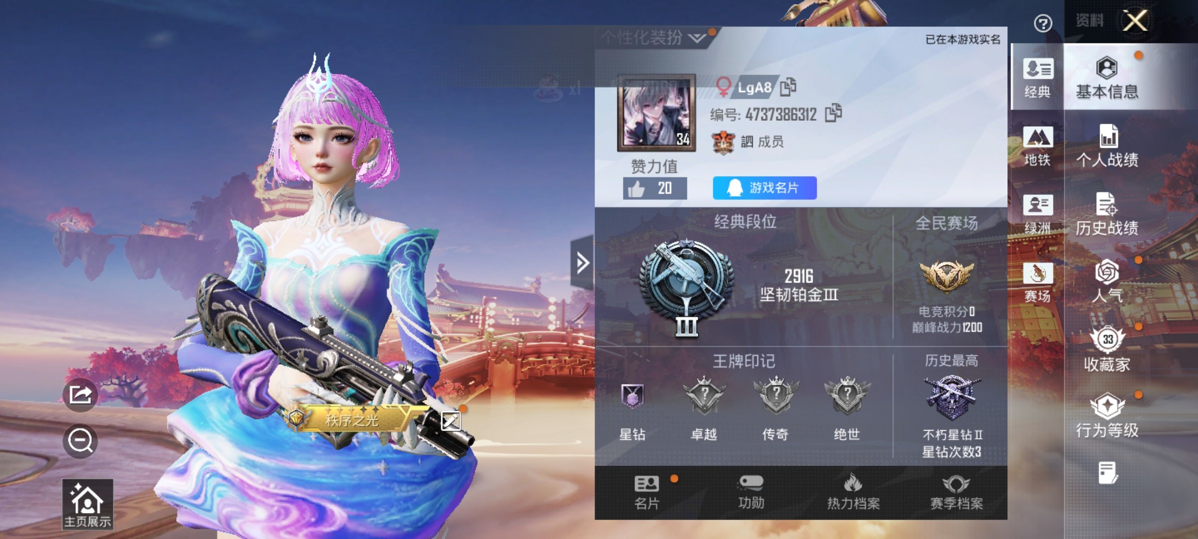 历史总热力值:19045 粉装数量:1 特效枪数量:4 历史最高段位:不朽星钻Ⅱ 套装数量:39 时装数量:159 枪械数量:75 战备数量:47 装备数量:112