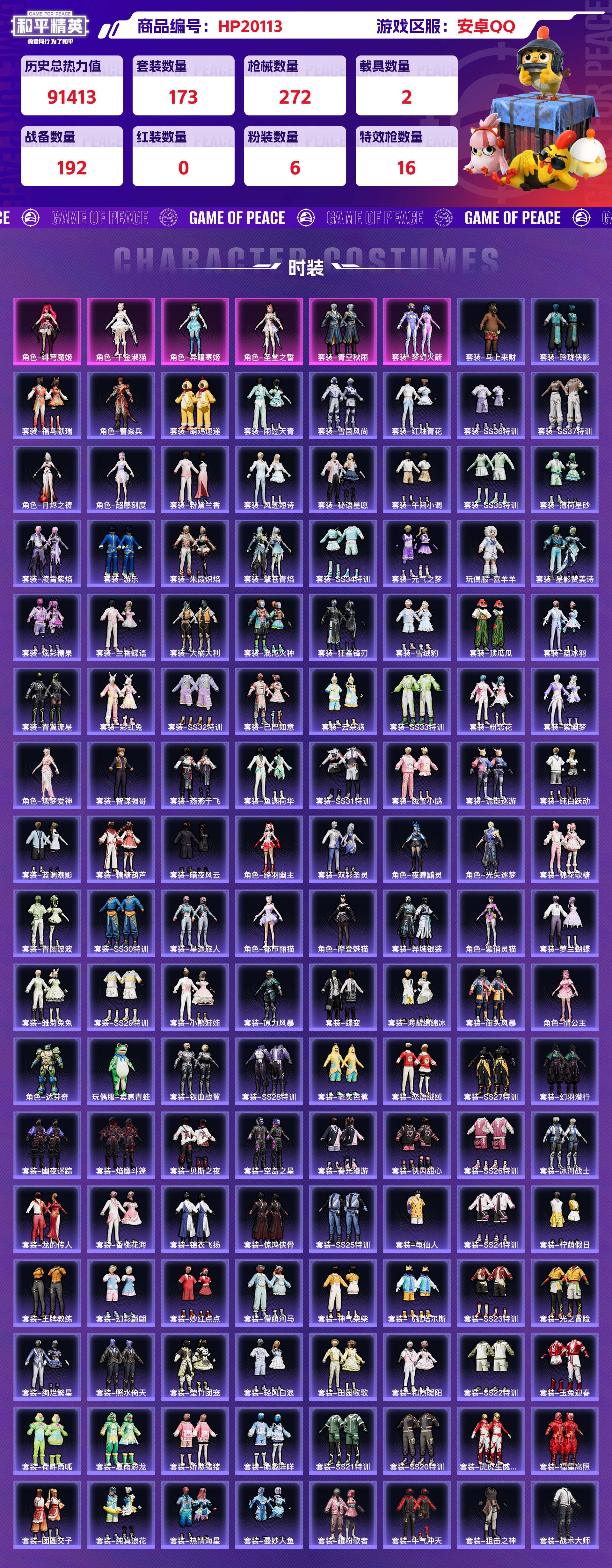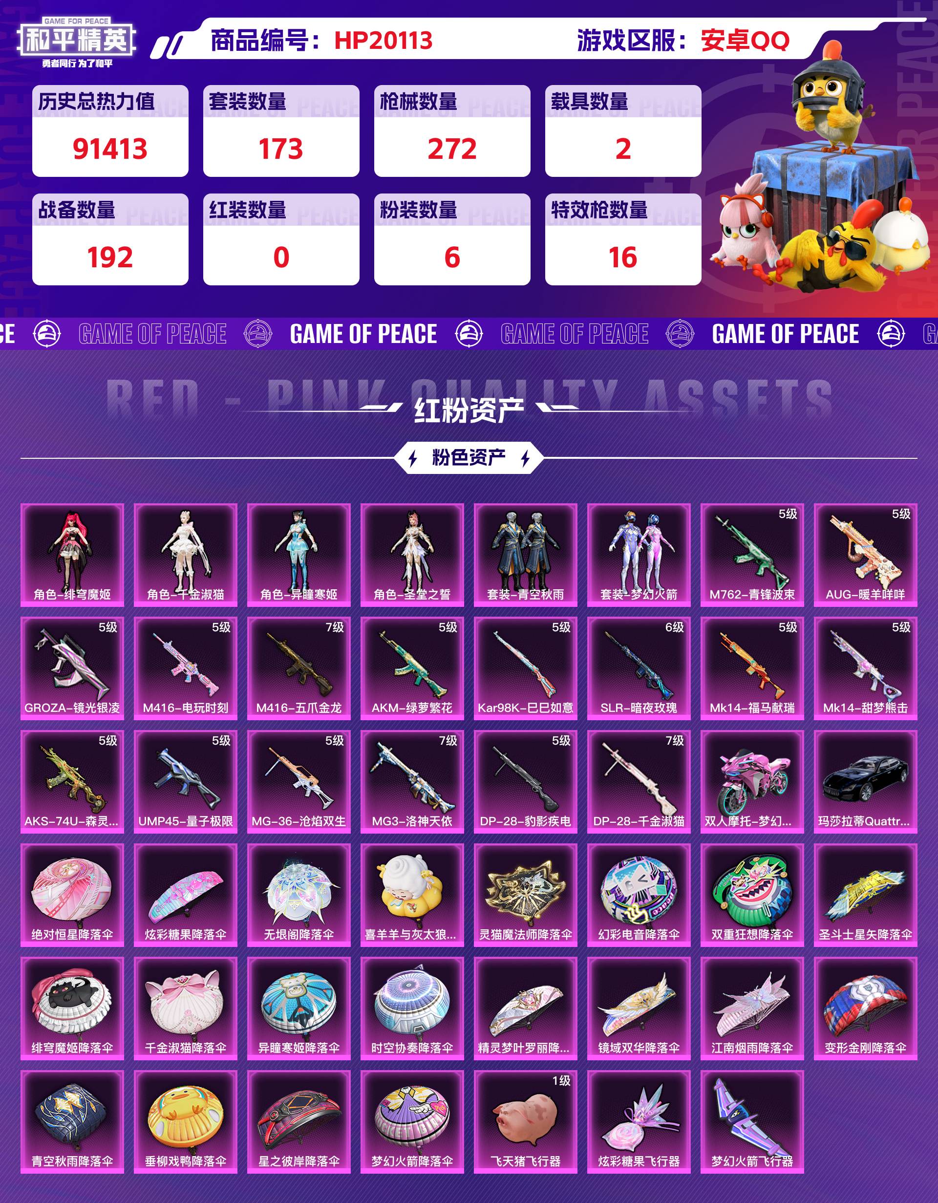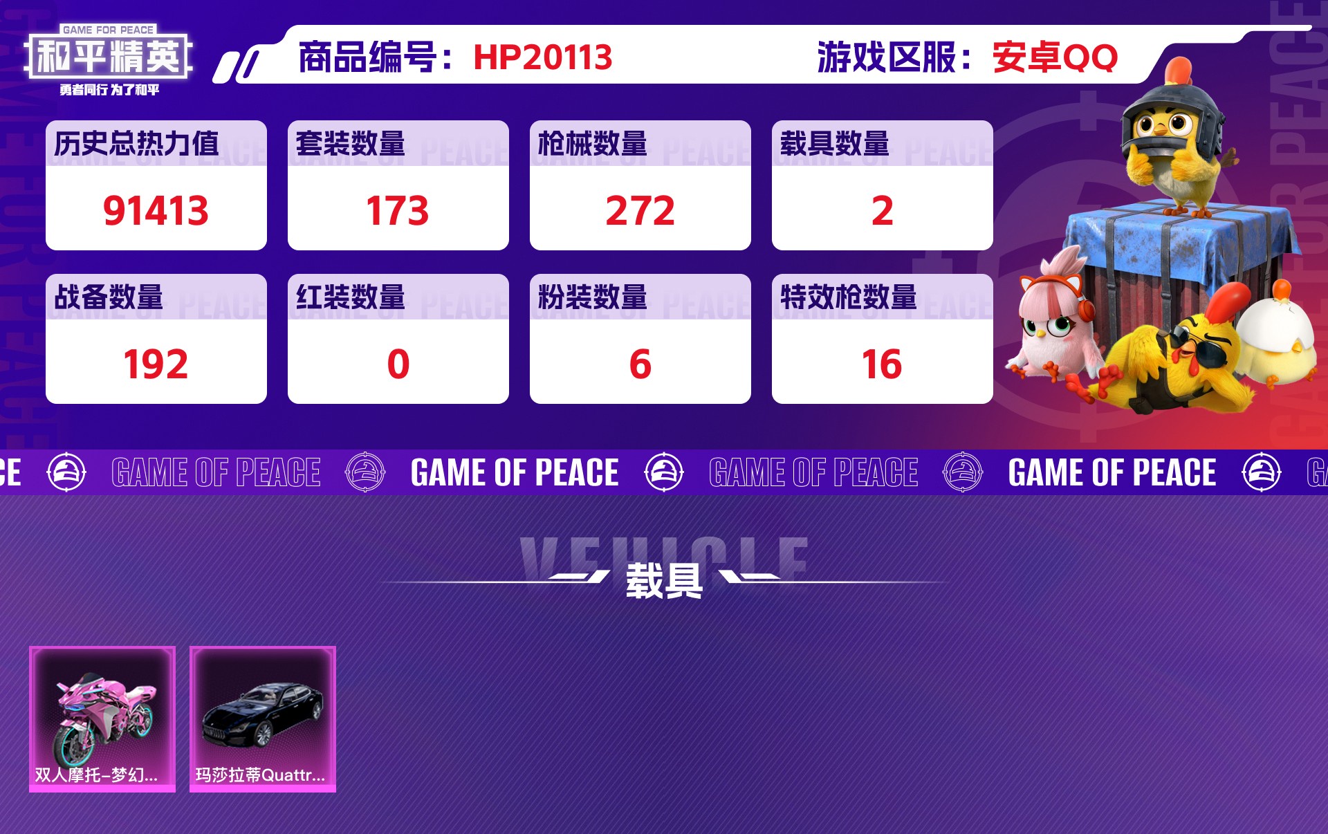 安卓QQ 历史总热力值:91413 粉装数量:6 特效枪数量:16 载具数量:2 王牌印记:9 历史最高段位:卓越王牌7星 套装数量:173 时装数量:637 枪械数量:272 战备数量:192 装备数量:374 载具:玛莎拉蒂Quattroporte(夜幕蓝),双人摩托-梦幻火箭 时装:套装-梦幻火箭,套装-青空秋雨,角色-千金淑猫,角色-圣堂之誓,角色-异瞳寒姬,角色-绯穹魔姬,套装-SS20特训,套装-SS21特训,套装-SS22特训,套装-SS23特训,套装-SS24特训,套装-SS25