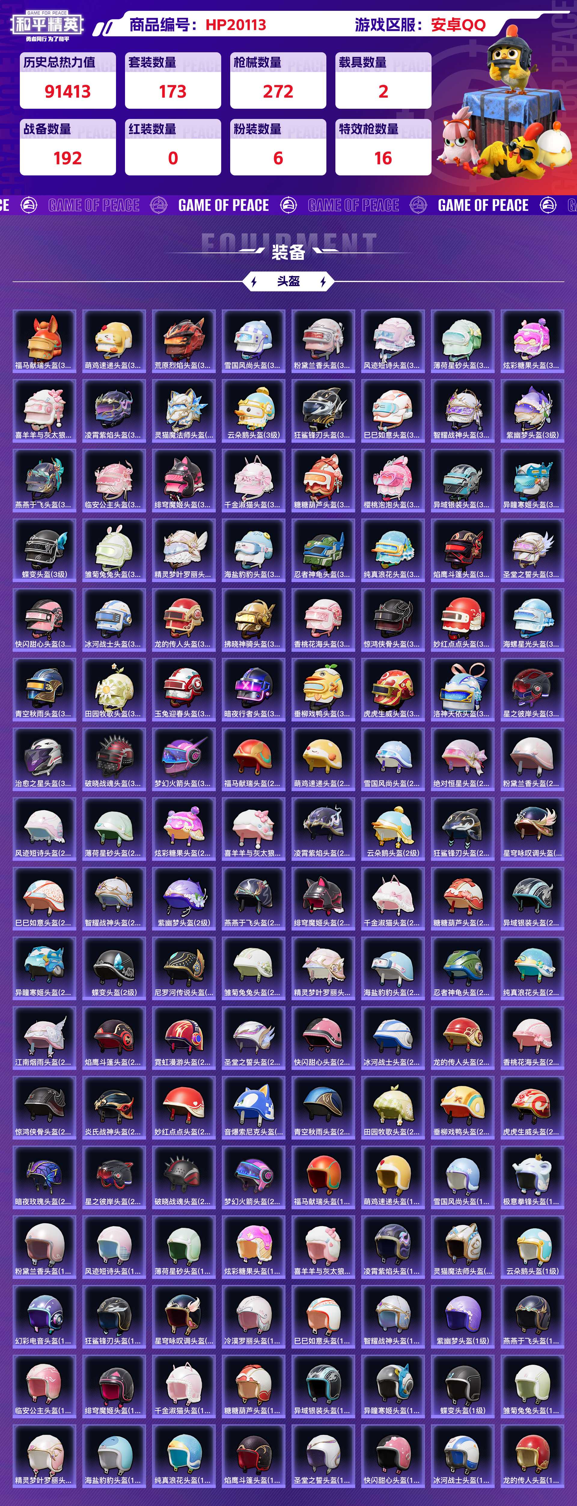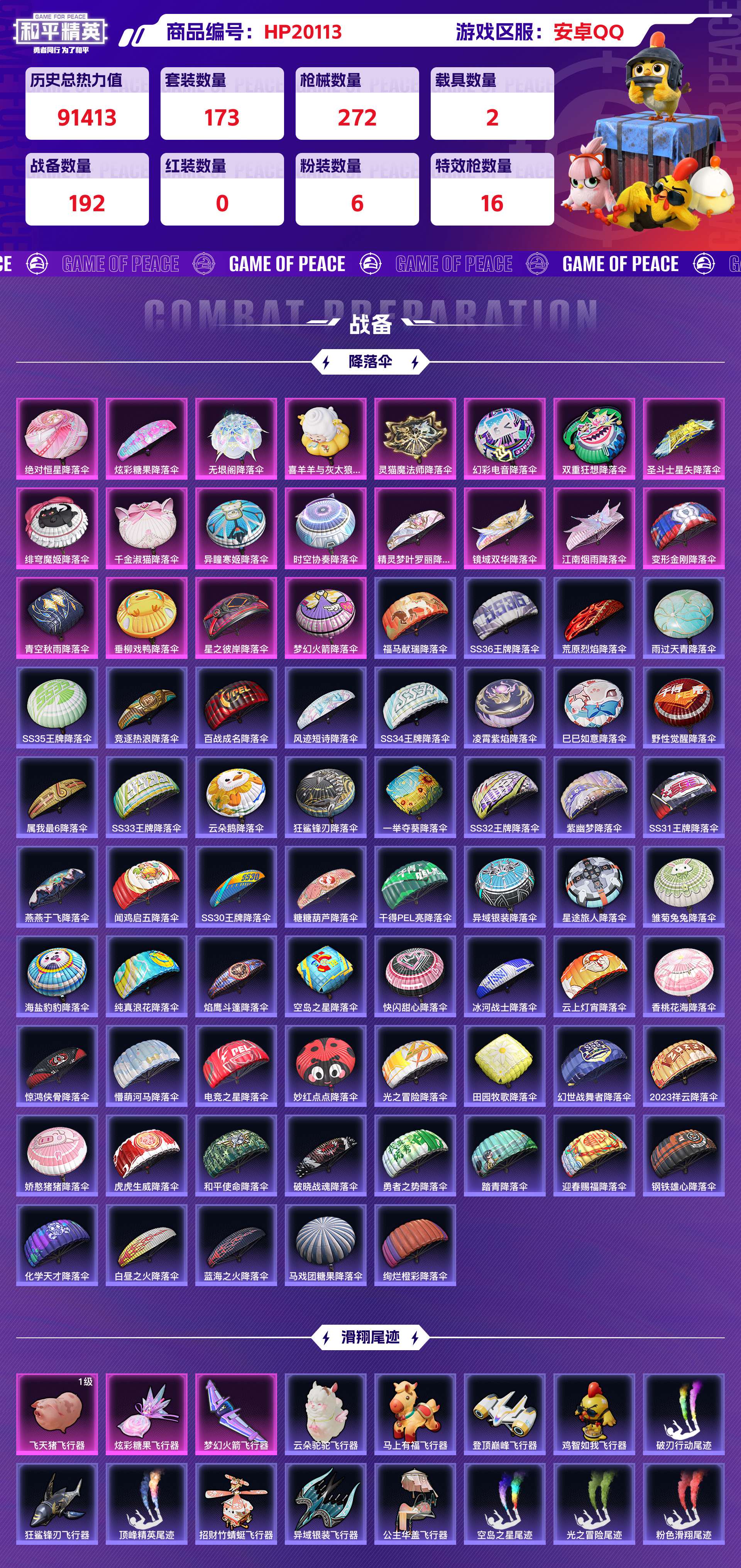 历史总热力值:91413 粉装数量:6 特效枪数量:16 载具数量:2 王牌印记:9 历史最高段位:卓越王牌7星 套装数量:173 时装数量:637 枪械数量:272 战备数量:192 装备数量:374